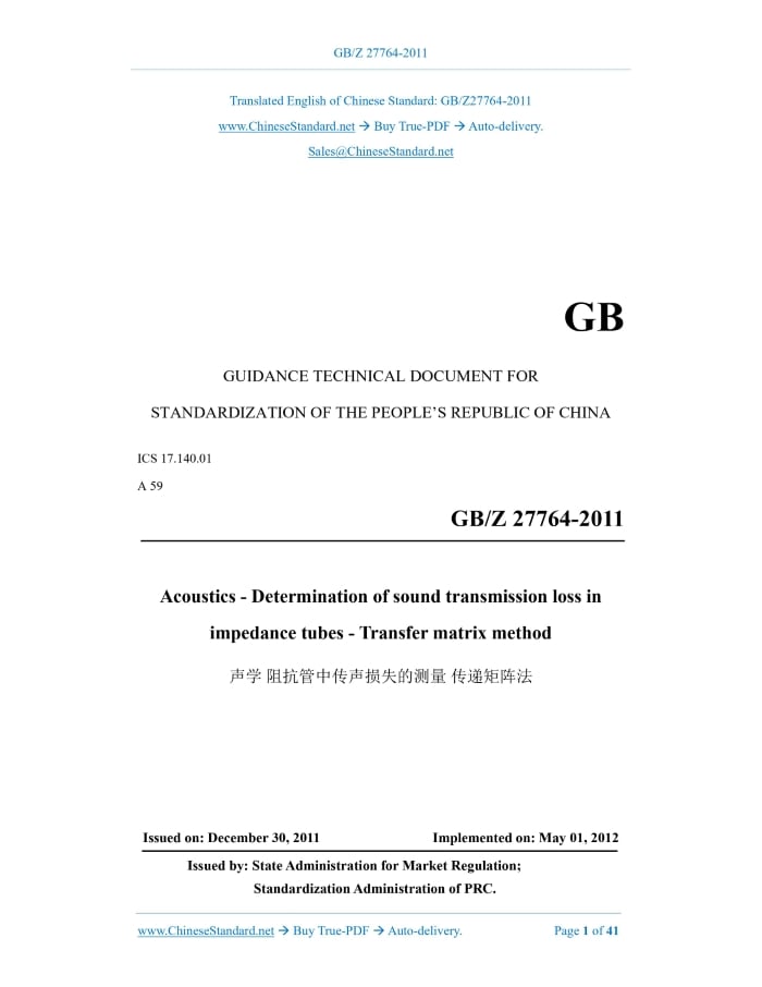 GBZ27764-2011: Acoustics - Determination of sound transmission loss in impedance tubes - Transfer matrix method Delivery: 9 seconds. True-PDF full-copy in English & invoice will be downloaded + auto-delivered via email. See step-by-step procedure Status: Valid
