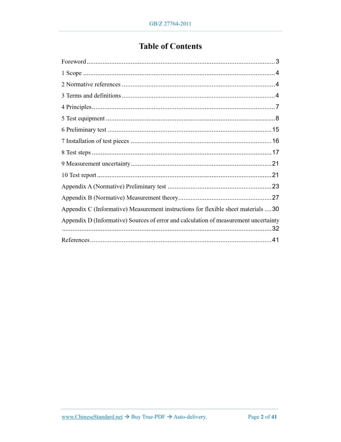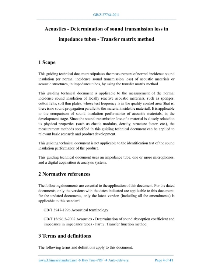 Similar standardsGBZ27764-2011: Acoustics - Determination of sound transmission loss in impedance tubes - Transfer matrix method---This is an excerpt. Full copy of true-PDF in English version (including equations, symbols, images, flow-chart, tables, and figures etc.), auto-downloaded/delivered in 9 seconds, can be purchased online: https://www.ChineseStandard.net/PDF.aspx/GBZ27764-2011 GB GUIDANCE TECHNICAL DOCUMENT FOR STANDARDIZATION OF THE PEOPLE’S REPUBLIC OF CHINA ICS 17.140.01 A 59 Acoustics - Determination of sound transmission loss in impedance tubes - Transfer matrix method ISSUED ON: DECEMBER 30, 2011 IMPLEMENTED ON: MAY 01, 2012 Issued by: State Administration for Market Regulation; Standardization Administration of PRC. Table of ContentsForeword ... 3 1 Scope ... 4 2 Normative references ... 4 3 Terms and definitions ... 4 4 Principles ... 7 5 Test equipment ... 8 6 Preliminary test ... 15 7 Installation of test pieces ... 16 8 Test steps ... 17 9 Measurement uncertainty ... 21 10 Test report ... 21 Appendix A (Normative) Preliminary test ... 23 Appendix B (Normative) Measurement theory ... 27 Appendix C (Informative) Measurement instructions for flexible sheet materials ... 30 Appendix D (Informative) Sources of error and calculation of measurement uncertainty ... 32 References ... 41 Acoustics - Determination of sound transmission loss in impedance tubes - Transfer matrix method1 ScopeThis guiding technical document stipulates the measurement of normal incidence sound insulation (or normal incidence sound transmission loss) of acoustic materials or acoustic structures, in impedance tubes, by using the transfer matrix method. This guiding technical document is applicable to the measurement of the normal incidence sound insulation of locally reactive acoustic materials, such as sponges, cotton felts, soft thin plates, whose test frequency is in the quality control area (that is, there is no sound propagation parallel to the material inside the material). It is applicable to the comparison of sound insulation performance of acoustic materials, in the development stage. Since the sound transmission loss of a material is closely related to its physical properties (such as elastic modulus, density, structure factor, etc.), the measurement methods specified in this guiding technical document can be applied to relevant basic research and product development. This guiding technical document is not applicable to the identification test of the sound insulation performance of the product. This guiding technical document uses an impedance tube, one or more microphones, and a digital acquisition & analysis system.2 Normative referencesThe following documents are essential to the application of this document. For the dated documents, only the versions with the dates indicated are applicable to this document; for the undated documents, only the latest version (including all the amendments) is applicable to this standard. GB/T 3947-1996 Acoustical terminology GB/T 18696.2-2002 Acoustics - Determination of sound absorption coefficient and impedance in impedance tubes - Part 2: Transfer function method3 Terms and definitionsThe following terms and definitions apply to this document. 3.1 Normal incidence [sound] pressure transmission coefficient τp The ratio -- of the sound pressure transmitted through a material or structure TO the incident sound pressure, when the sound wave is incident on the normal direction. Note: Rewrite GB/T 3947-1996, Terms and Definitions 12.37. 3.2 Normal incidence [sound] transmission loss TL The difference -- between the incident sound power level on one side of the material and the transmitted sound power level on the other side -- when the sound wave is incident on the normal direction. The sound transmission loss is equal to the reciprocal of the square of the sound pressure transmission coefficient, taking the logarithm to the base 10, in the unit of Bell [B]. However, it is usually measured in decibels (dB). Note: Rewrite GB/T 3947-1996, Terms and Definitions 12.26. 3.3 The first reference plane The cross-section of the impedance tube, which is used to measure the sound pressure transmission coefficient. If the surface of the test piece is flat, usually take the front surface of the sample as the first reference plane. Note: Rewrite GB/T 18696.2-2002, Terms and Definitions 3.3. 3.4 The second reference plane The cross-section of the impedance tube, which is used to measure the sound pressure transmission coefficient. If the surface of the test piece is flat and the thickness of the sample is t, the second reference plane is usually taken at x = t. Note: Rewrite GB/T 18696.2-2002, Terms and Definitions 3.3. 3.5 Wave number in the air sequence noise or chirp. Measure the sound pressure, at two positions close to the sample in the front tube, to obtain the sound pressure transfer function of the two microphone signals. Similarly, measure the sound pressure, at two positions close to the sample in the back tube, to obtain the sound pressure transfer function of the two microphone signals. Calculate the normal incident transmission coefficient of the test piece (see Appendix B), sound transmission loss, other related acoustic quantities, by the transfer matrix method. These quantities are all functions of frequency. Frequency resolution depends on the sampling frequency and the measurement record length of the digital acquisition and analysis system. The effective frequency range is related to the lateral dimension or diameter of the impedance tube, as well as the spacing between the two microphones. With different sizes or combinations of diameter and spacing, a wide range of measuring frequencies can be obtained. Measurements can be made in one of two ways: a) Four-microphone method (measured by four microphones at a fixed position); b) Single-microphone method (measured by one microphone at four positions in sequence).5 Test equipment5.1 Structure of impedan
