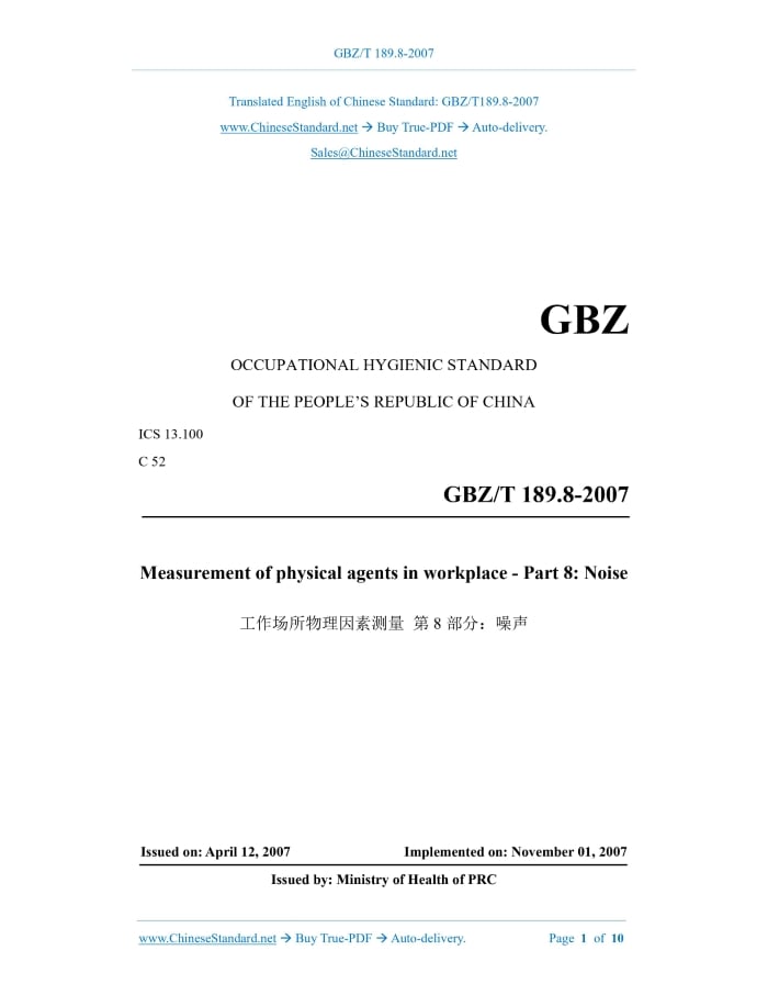 GBZT189.8-2007: Measurement of physical agents in workplace - Part 8: Noise Delivery: 9 seconds. True-PDF full-copy in English & invoice will be downloaded + auto-delivered via email. See step-by-step procedure Status: Valid
