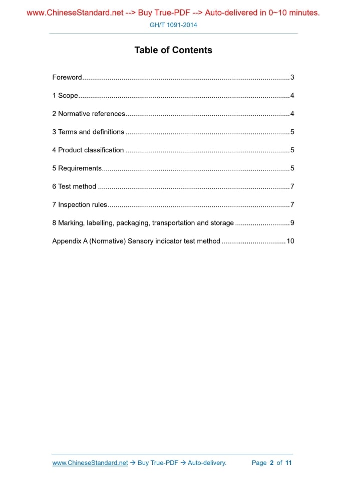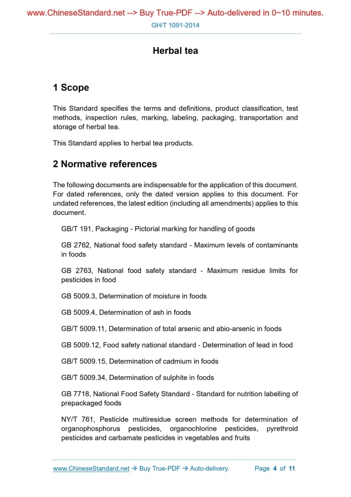 Similar standardsGHT1091-2014: Herbal tea---This is an excerpt. Full copy of true-PDF in English version (including equations, symbols, images, flow-chart, tables, and figures etc.), auto-downloaded/delivered in 9 seconds, can be purchased online: https://www.ChineseStandard.net/PDF.aspx/GHT1091-2014GH SUPPLY AND MARKETING COOPERATIVES INDUSTRY STANDARD OF THE PEOPLE’S REPUBLIC OF CHINA ICS 67.140.10 X 55 Herbal tea ISSUED ON: JUNE 23, 2014 IMPLEMENTED ON: OCTOBER 01, 2014 Issued by: All China Federation of Supply and Marketing Cooperatives Table of ContentsForeword ... 3 1 Scope ... 4 2 Normative references ... 4 3 Terms and definitions ... 5 4 Product classification ... 5 5 Requirements ... 5 6 Test method ... 7 7 Inspection rules ... 7 8 Marking, labelling, packaging, transportation and storage ... 9 Appendix A (Normative) Sensory indicator test method ... 10 Herbal tea1 ScopeThis Standard specifies the terms and definitions, product classification, test methods, inspection rules, marking, labeling, packaging, transportation and storage of herbal tea. This Standard applies to herbal tea products.2 Normative referencesThe following documents are indispensable for the application of this document. For dated references, only the dated version applies to this document. For undated references, the latest edition (including all amendments) applies to this document. GB/T 191, Packaging - Pictorial marking for handling of goods GB 2762, National food safety standard - Maximum levels of contaminants in foods GB 2763, National food safety standard - Maximum residue limits for pesticides in food GB 5009.3, Determination of moisture in foods GB 5009.4, Determination of ash in foods GB/T 5009.11, Determination of total arsenic and abio-arsenic in foods GB 5009.12, Food safety national standard - Determination of lead in food GB/T 5009.15, Determination of cadmium in foods GB/T 5009.34, Determination of sulphite in foods GB 7718, National Food Safety Standard - Standard for nutrition labelling of prepackaged foods NY/T 761, Pesticide multiresidue screen methods for determination of organophosphorus pesticides, organochlorine pesticides, pyrethroid pesticides and carbamate pesticides in vegetables and fruits6 Test method6.1 Sensory indicators Test according to the method that is specified in Appendix A. 6.2 Physical-chemical indicators 6.2.1 Determine the moisture according to the method that is specified in GB 5009.3. 6.2.2 Determine the total ash according to the method that is specified in GB 5009.4. 6.3 Hygienic indicators 6.3.1 Determine the lead according to the method that is specified in GB 5009.12. 6.3.2 Determine the total arsenic according to the method that is specified in GB/T 5009.11. 6.3.3 Determine the sulfur dioxide according to the method that is specified in GB/T 5009.34. 6.3.4 Determine the cadmium according to the method that is specified in GB/T 5009.15. 6.3.5 Determine Hexachlorocyclohexane, DDT, dicofol, fenvalerate, dichlorvos, dimethoate, chlorpyrifos, carbofuran, triazophos, acephate, and fenitrothion according to the method that is specified in NY/T 761. 6.4 Net content Test according to the method that is specified in JJF 1070.7 Inspection rules7.1 Sampling 7.1.1 Batching Products that have the same color, grade, packaging specifications and net content, consistent mass, and are processed and packaged at the same place and within the same period are assembled into one batch. 7.1.2 Sampling method and number of samples When there is a dispute over the inspection results, perform a re-inspection on the retained samples or the re-randomly double sampling products of the same batch of unqualified items; it shall be subject to the re-inspection results.8 Marking, labelling, packaging, transportation andstorage 8.1 Marking, labeling The storage and transportation pictorial signs shall meet the requirements of GB/T 191. The labeling shall comply with the provisions of GB 7718 and the "Decision on Amending the Administrative Provisions on Food Labeling". 8.2 Packaging The packaging materials that contact the herbal tea shall meet the corresponding sanitary requirements; they shall be clean, dry, odorless, non- toxic, and shall have good air tightness. 8.3 Transportation Clean, dry, odor-free, and pollution-free transportation tools shall be used; it must not be mixed or transported with toxic, harmful, odorous, or easily polluted items; there shall be rain-proof, moisture-proof, and exposure-proof protection measures during transportation to avoid severe impact and heavy pressure. 8.4 Storage It shall be stored in a clean, dry, and odor-free special warehouse; the products shall be stacked more than 20 cm away from the ground and the wall. There shall be no peculiar smell around the warehouse. It should be refrigerated. ......Source: Above contents are excerpted from the full-copy PDF -- translated/reviewed by: www.ChineseStandard.net / Wayne Zheng et al. Tips & Frequently Asked Questions:Question 1: How long will the true-PDF of English version of GHT1091-2014 be delivered?Answer: The full copy PDF of English version of GHT1091-2014 can be downloaded in 9 seconds, and it will also be emailed to you in 9 seconds (double mechanisms to ensure the delivery reliably), with PDF-invoice.Question 2: Can I share the purchased PDF of GHT1091-2014_English with my colleagues?Answer: Yes. The purchased PDF of GHT1091-2014_English will be deemed to be sold to your employer/organization who actually paid for it, including your colleagues and your employer's intranet.Question 3: Does the price include tax/VAT?Answer: Yes. Our tax invoice, downloaded/delivered in 9 seconds, includes all tax/VAT and complies with 100+ countries' tax regulations (tax exempted in 100+ countries) -- See Avoidance of Double Taxation Agreements (DTAs): List of DTAs signed between Singapore and 100+ countriesQuestion 4: Do you accept my currency other than USD?Answer: Yes. www.ChineseStandard.us -- GHT1091-2014 -- C