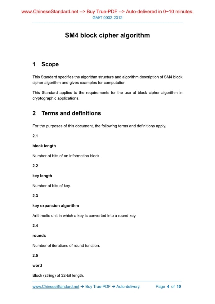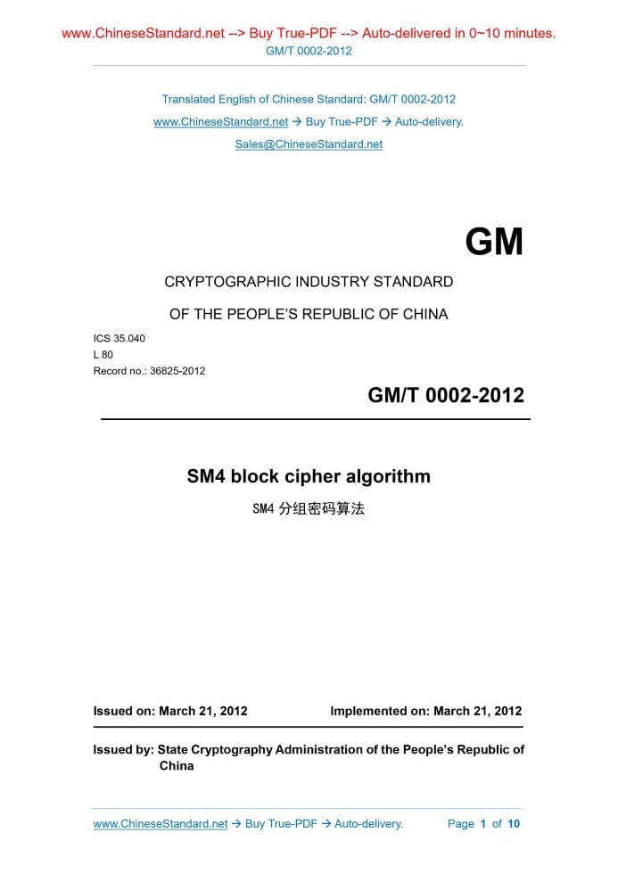 GM/T 0002-2012: SM4 block cipher algorithm Delivery: 9 seconds. True-PDF full-copy in English & invoice will be downloaded + auto-delivered via email. See step-by-step procedure Status: Valid