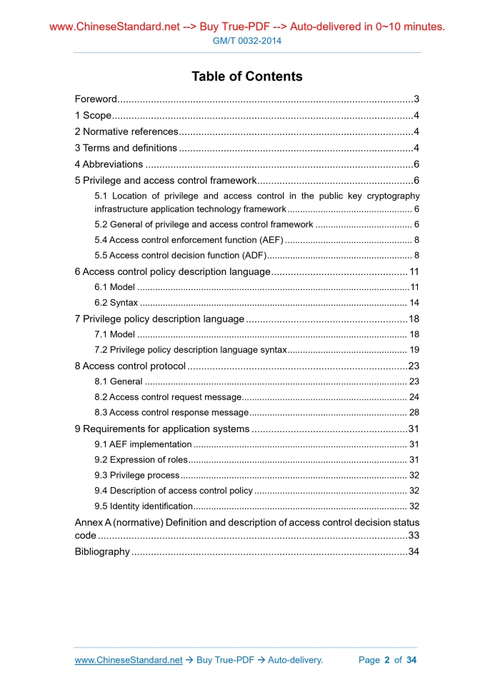 Similar standardsGM/T 0032-2014: Specifications for role based privilege management and access control---This is an excerpt. Full copy of true-PDF in English version (including equations, symbols, images, flow-chart, tables, and figures etc.), auto-downloaded/delivered in 9 seconds, can be purchased online: https://www.ChineseStandard.net/PDF.aspx/GMT0032-2014GM CRYPTOGRAPHY INDUSTRY STANDARD OF THE PEOPLE’S REPUBLIC OF CHINA ICS 35.040 L 80 File No.. 44633-2014 Specifications for role based privilege management and access control Issued on: FEBRUARY 13, 2014 Implemented on: FEBRUARY 13, 2014 Issued by. State Cryptography Administration Table of ContentsForeword . 3 1 Scope .. 4 2 Normative references .. 4 3 Terms and definitions .. 4 4 Abbreviations .. 6 5 Privilege and access control framework .. 6 5.1 Location of privilege and access control in the public key cryptography infrastructure application technology framework . 6 5.2 General of privilege and access control framework . 6 5.4 Access control enforcement function (AEF) .. 8 5.5 Access control decision function (ADF) .. 8 6 Access control policy description language . 11 6.1 Model .. 11 6.2 Syntax .. 14 7 Privilege policy description language . 18 7.1 Model . 18 7.2 Privilege policy description language syntax .. 19 8 Access control protocol .. 23 8.1 General . 23 8.2 Access control request message .. 24 8.3 Access control response message .. 28 9 Requirements for application systems .. 31 9.1 AEF implementation .. 31 9.2 Expression of roles . 31 9.3 Privilege process . 32 9.4 Description of access control policy . 32 9.5 Identity identification .. 32 Annex A (normative) Definition and description of access control decision status code .. 33 Bibliography .. 34 Foreword This Standard was drafted in accordance with the rules given in GB/T 1.1-2009. Attention is drawn to the possibility that some of the elements of this document may be the subject of patent rights. The issuing authority shall not be held responsibility for identifying any or all such patent rights. This Standard was proposed by and shall be under the jurisdiction of Code Industry Standardization Technical Committee. Drafting organizations of this Standard. Changchun Jida Zhengyuan Information Technology Co., Ltd., Wuxi Jiangnan Information Security Engineering Technology Center, Chengdu Westone Information Industry Co., Ltd., Shandong De’an Information Technology Co., Ltd., Shanghai Koal Software Co., Ltd., Beijing Digital Certificate Certification Center Co., Ltd., Shanghai Digital Certificate Certification Center Co., Ltd., Wanda Information Co., Ltd., Xingtang Communication Technology Co., Ltd. Drafters of this Standard. Liu Ping, Li Weiping, Zhao Lili, He Changlong, Xu Qiang, Li Yuanzheng, Gao Zhiquan, Tan Wuzheng, Li Shusheng, Cui Jiuqiang, Zhou Dong, Wang Nina. Specifications for role based privilege management and access control1 ScopeThis Standard specifies the role-based privilege and access control framework structure and the logical relationship between the various components within the framework, defines the functions, operating procedures and operating protocols of each component, and defines the uniform format of access control policy description language and privilege policy description language, and the standard interface for access control protocols. This Standard is applicable to the development of role-based privilege and access control systems under the public key cryptography technology system, and may guide the detection of such systems and the development of related applications.2 Normative referencesThe following referenced documents are indispensable for the application of this document. For dated references, only the dated edition cited applies. For undated references, the latest edition of the referenced document (including all amendments) applies. GB/T 20519 Information security technology - Public key infrastructures - Privilege Management Center technical specification GM/T 0019 Universal cryptography service interface specification3 Terms and definitionsFor the purpose of this document, the following terms and definitions apply. 3.1 access control decision Evaluation result of the access control decision function to the access request. 3.2 access control decision function Component responsible for making the decision on the access request. 3.3 access control enforcement function Component that performs the access control policy function. 3.4 access control policy Binding relationship, determined by the application, between roles and resources. 3.5 access control policy certificate Attribute certificate that carries the application access control policy. 3.6 contextual information Environmental information related to the access decision result when the request is happening. 3.7 privilege management Management of the distribution relationship between subjects and roles. 3.8 privilege information Information that identifies the distribution relationship between subjects and roles. 3.9 privilege certificate Attribute certificate that carries the privilege information. to complete the binding of subjects and roles, roles and resources, such as using privilege certificates and access control policy certificates. When using the attribute certificate to carry the binding relationship, the system shall follow the requirements of GB/T 20519. 5.4 Access control enforcement function (AEF) The AEF receives the access request, encapsulates the access request according to the access control protocol and controls the access to the resource based on the decision result. When the decision result is “permit”, the AEF authorizes the initiator's access to the resource; if the decision result is “deny”, the AEF shall block the initiator's access to the resource. The use mode of the AEF includes share and non-share. In the share mode, multiple applications use one AEF; in the non-share mode, each application uses its own AEF. 5.5 Access control d