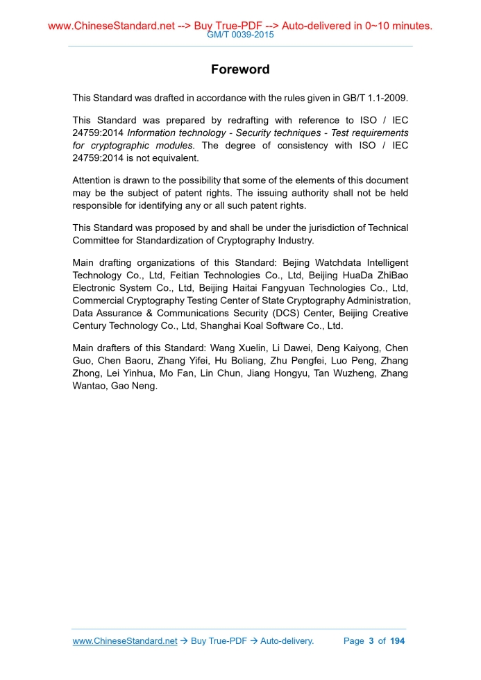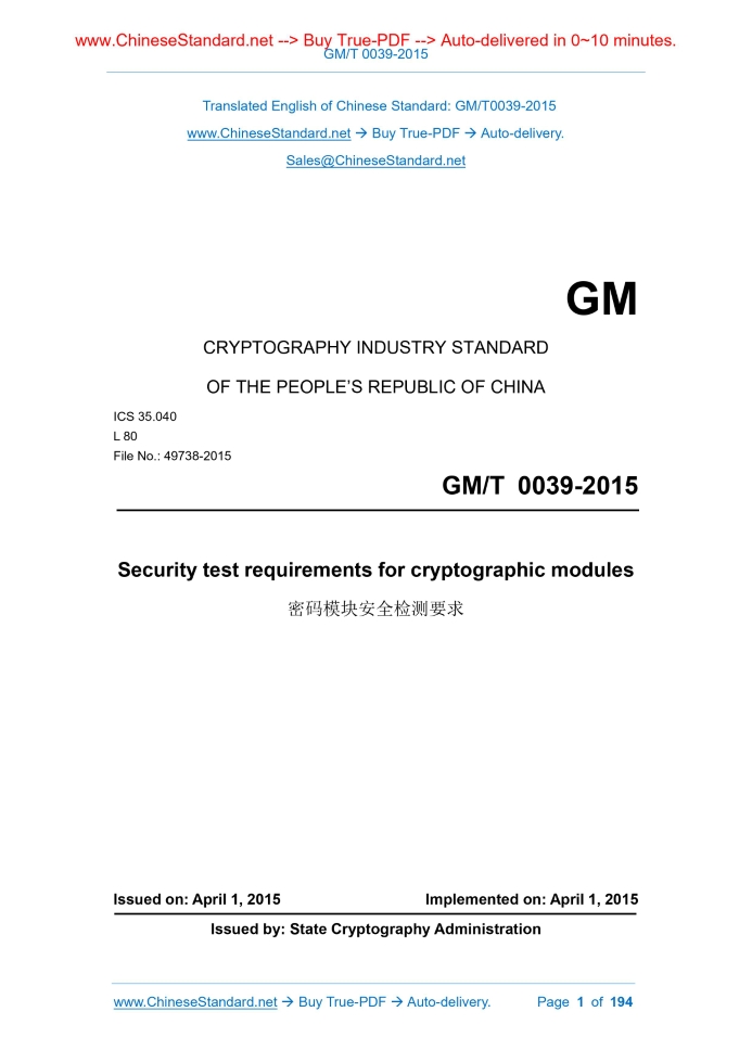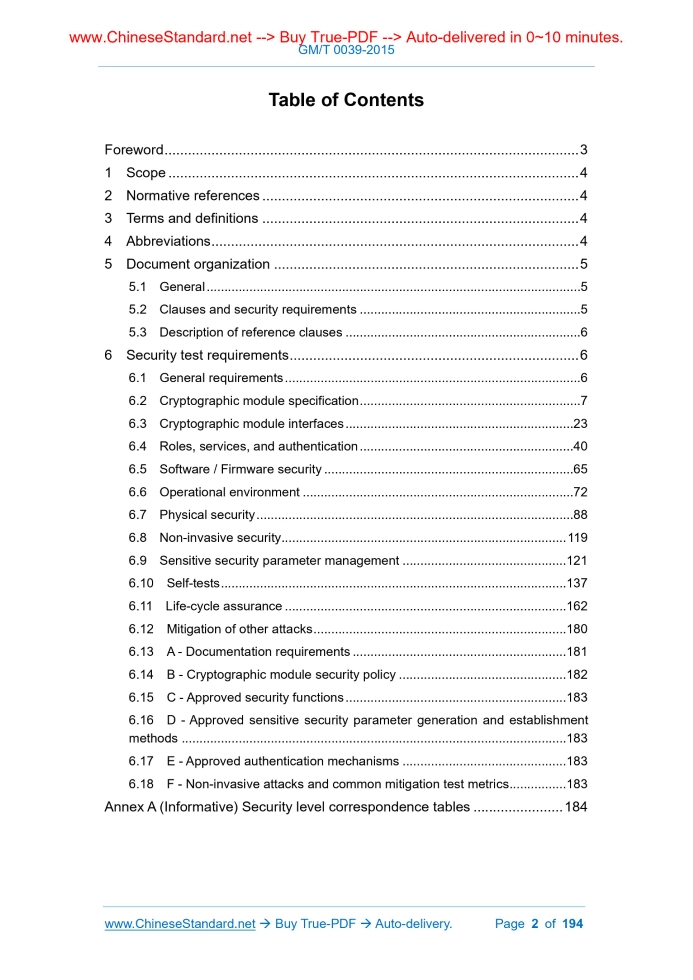 Similar standardsGM/T 0039-2015: Security test requirements for cryptographic modules---This is an excerpt. Full copy of true-PDF in English version (including equations, symbols, images, flow-chart, tables, and figures etc.), auto-downloaded/delivered in 9 seconds, can be purchased online: https://www.ChineseStandard.net/PDF.aspx/GMT0039-2015GM CRYPTOGRAPHY INDUSTRY STANDARD ICS 35.040 L 80 File No.. 49738-2015 Security test requirements for cryptographic modules Issued on: APRIL 1, 2015 Implemented on: APRIL 1, 2015 Issued by. State Cryptography Administration Table of ContentsForeword. 3 1 Scope.. 4 2 Normative references.. 4 3 Terms and definitions.. 4 4 Abbreviations.. 4 5 Document organization. 5 5.1 General.. 5 5.2 Clauses and security requirements.. 5 5.3 Description of reference clauses. 6 6 Security test requirements.. 6 6.1 General requirements. 6 6.2 Cryptographic module specification.. 7 6.3 Cryptographic module interfaces.. 23 6.4 Roles, services, and authentication. 40 6.5 Software / Firmware security.. 65 6.6 Operational environment.. 72 6.7 Physical security. 88 6.8 Non-invasive security. 119 6.9 Sensitive security parameter management. 121 6.10 Self-tests.. 137 6.11 Life-cycle assurance.. 162 6.12 Mitigation of other attacks.. 180 6.13 A - Documentation requirements. 181 6.14 B - Cryptographic module security policy.. 182 6.15 C - Approved security functions.. 183 6.16 D - Approved sensitive security parameter generation and establishment methods.. 183 6.17 E - Approved authentication mechanisms. 183 6.18 F - Non-invasive attacks and common mitigation test metrics.. 183 Annex A (Informative) Security level correspondence tables. 184ForewordThis Standard was drafted in accordance with the rules given in GB/T 1.1-2009. This Standard was prepared by redrafting with reference to ISO / IEC 24759.2014 Information technology - Security techniques - Test requirements for cryptographic modules. The degree of consistency with ISO / IEC 24759.2014 is not equivalent. Attention is drawn to the possibility that some of the elements of this document may be the subject of patent rights. The issuing authority shall not be held responsible for identifying any or all such patent rights. This Standard was proposed by and shall be under the jurisdiction of Technical Committee for Standardization of Cryptography Industry. Main drafting organizations of this Standard. Bejing Watchdata Intelligent Technology Co., Ltd, Feitian Technologies Co., Ltd, Beijing HuaDa ZhiBao Electronic System Co., Ltd, Beijing Haitai Fangyuan Technologies Co., Ltd, Commercial Cryptography Testing Center of State Cryptography Administration, Data Assurance & Communications Security (DCS) Center, Beijing Creative Century Technology Co., Ltd, Shanghai Koal Software Co., Ltd. Main drafters of this Standard. Wang Xuelin, Li Dawei, Deng Kaiyong, Chen Guo, Chen Baoru, Zhang Yifei, Hu Boliang, Zhu Pengfei, Luo Peng, Zhang Zhong, Lei Yinhua, Mo Fan, Lin Chun, Jiang Hongyu, Tan Wuzheng, Zhang Wantao, Gao Neng. Security test requirements for cryptographic modules 1 Scope This Standard specifies a series of test procedures, test methods and corresponding document submission requirements for cryptographic modules, in accordance with the requirements of GM/T 0028-2014. This Standard is applicable to the tests of cryptographic modules. 2 Normative references The following documents are essential to the application of this document. For dated references, only the editions with the dates indicated are applicable to this document. For undated references, only the latest editions (including all the amendments) are applicable to this document. GM/T 0028-2014 Security requirements for cryptographic modules GM/Z 4001 Cryptology terminology 3 Terms and definitions The terms and definitions defined in GM/T 0028-2014 and GM/Z 4001 are applicable to this document. 4 Abbreviations The following abbreviations are applicable to this document. API Application Program Interface CBC Cipher Block Chaining CSP Critical Security Parameter EDC Error Detection Code EFP Environmental Failure Protection EFT Environmental Failure Testing Following each clause is the requirements for the required vendor documentation. These requirements describe the types of documentation or explicit information that the vendor shall provide in order for the tester to verify conformity (of the documentation or information) to the given clause. These requirements are denoted by the form. CY< requirement number>.< clause sequence number>.< sequence number> where “CY” represents the requirements for the documents that are submitted by the vendor, “requirement number” and “clause sequence number” are identical to those in the corresponding security requirement, and “sequence number” is a sequential identifier for vendor requirements within the clause. Following the required vendor documentation is the requirements for the required test procedures. These requirements instruct the tester as to what he or she shall do in order to test the cryptographic module with respect to the given clause. These requirements are denoted by the form. JY< requirement number>.< clause sequence number>.< sequence number> where “JY” represents the requirements for the test procedures and methods, “requirement number” and “clause sequence number” are identical to those in the corresponding security requirement, and “sequence number” is a sequential identifier for tester requirements within the clause. 5.3 Description of reference clauses For coherence in the statements, this Standard adds supplementary statements to some of the clauses that are direct quotations from GM/T 0028-2014.These statements have been put between curly brackets “{” and “}” and are italicized in bold font of Song typeface. In addition, the “shall” used in the requirements for the vendor documentation and the requirements for the test procedures required by this Standard have the same