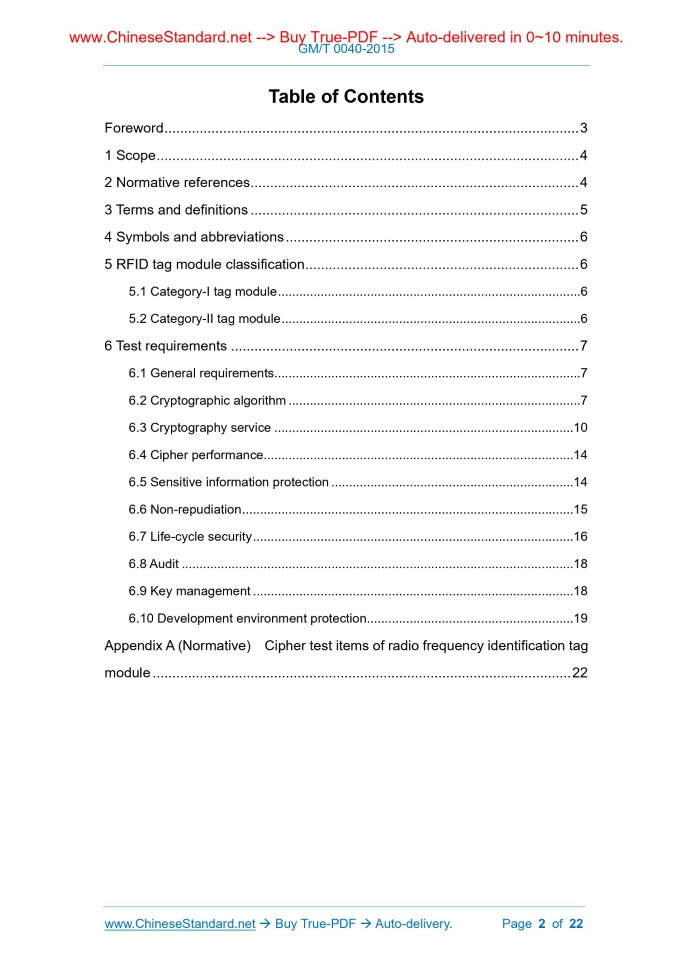 Similar standardsGM/T 0040-2015: Cipher test specification of radio frequency identification tag module---This is an excerpt. Full copy of true-PDF in English version (including equations, symbols, images, flow-chart, tables, and figures etc.), auto-downloaded/delivered in 9 seconds, can be purchased online: https://www.ChineseStandard.net/PDF.aspx/GMT0040-2015GM CRYPTOGRAPHY INDUSTRY STANDARD ICS 35.040 L80 File No.. 49739-2015 Cipher test specification of radio frequency identification tag module Issued on: APRIL 1, 2015 Implemented on: APRIL 1, 2015 Issued by. State Cryptography Administration Table of ContentsForeword... 3 1 Scope.. 4 2 Normative references... 4 3 Terms and definitions... 5 4 Symbols and abbreviations... 6 5 RFID tag module classification... 6 5.1 Category-I tag module.. 6 5.2 Category-II tag module... 6 6 Test requirements... 7 6.1 General requirements... 7 6.2 Cryptographic algorithm.. 7 6.3 Cryptography service... 10 6.4 Cipher performance... 14 6.5 Sensitive information protection.. 14 6.6 Non-repudiation... 15 6.7 Life-cycle security... 16 6.8 Audit... 18 6.9 Key management... 18 6.10 Development environment protection... 19 Appendix A (Normative) Cipher test items of radio frequency identification tag module... 22ForewordThis Standard was drafted in accordance with the rules given in GB/T 1.1-2009. Attention is drawn to the possibility that some of the elements of this Standard may be the subject of patent rights. The issuing authority shall not be held responsible for identifying any or all such patent rights. This Standard was proposed by and shall be under the jurisdiction of Cryptography Industry Standardization Technical Committee. Main drafting organizations of this Standard. CEC Huada Electronic Design Co., Ltd., Commercial Cryptography Testing Center of State Cryptography Administration, Shanghai Huahong Integrated Circuit Co., Ltd., Beijing Tongfang Microelectronics Company, Shanghai Fudan Microelectronics Group Co., Ltd., Shanghai Hsic Application System Co., Ltd., Aisino Corporation, Nation Technologies Inc. Main drafters of this Standard. Dong Haoran, Luo Peng, Zhou Jiansuo, Lan Tian, Fei Du, Mao Yingying, Mo Fan, Deng Kaiyong, Gu Zhen, Yang Xianwei, Shao Bo, Liu Xun, Liu Ying, Yue Chao. Cipher test specification of radio frequency identification tag module 1 Scope This standard specifies the test content and requirements for cipher test of RFID (Radio Frequency Identification) tag module product by using cryptographic techniques. This standard applies to cipher test and security function test of RFID tag module. It can also be used to meet the requirements of GB/T 28925-2012 and GB/T 29768-2013 for the cipher test of RFID air interface protocol product. The algorithm described in this standard is the cryptographic algorithm which is approved by state cryptography administration competent department.2 Normative referencesThe following documents are essential for the application of this document. For dated references, only the dated version applies to this document. For undated references, the latest edition (including all amendments) applies to this document. GB/T 28925-2012 Information technology - Radio frequency identification - Air interface protocol at 2.45 GHz GB/T 29768-2013 Information technology - Radio frequency identification - Air interface protocol at 800/900 MHz GM/T 0005-2012 Randomized test specification GM/T 0008-2012 Cipher test specification of security chip GM/T 0035.1-2014 Technical requirements for cryptographic application of radio frequency identification system – Part 1.Cryptographic security protection framework and security level GM/T 0035.2-2014 Technical requirements for cryptographic application of radio frequency identification system - Part 2.Technical requirements for cryptographic applications of electronic tag chip GM/T 0035.4-2014 Technical requirements for cryptographic application of radio frequency identification system - Part 4.Technical requirements for cryptographic application of electronic tag and reader-writer communication GM/Z 4001 Cipher terms3 Terms and definitionsThe terms defined in GM/Z 4001 AND the following terms and definitions apply to this document. 3.1 Symmetric cryptographic algorithm It is a cryptographic algorithm which uses the same key in encryption- decryption. 3.2 Unidirectional authentication It is an identity authentication for tag which is initiated by reader-writer. 3.3 Confidentiality It is the nature which guarantees information not to be leaked to entities such as unauthorized individuals and processes. 3.4 Non-repudiation of origin It is a cryptographic method which is used to prevent the originator of a message from denying its creation and having sent the message. 3.5 Kill It is an operation instruction to tag module; after successfully executed, the tag module will no longer respond to any command. 3.6 Radio frequency identification command and mechanism specified in the standard; if it selects and uses the products of security authentication protocols in GM/T 0035.4-2014, it shall implement the security mechanism specified in the standard; If it selects and uses the products of security authentication protocols in other security standards or user-defined, it shall implement the corresponding security mechanism. 6.3.1.2 Category-I tag module The identity authentication test mode of Category-I tag module is as follows. a) Test requirements Use unidirectional authentication mode. The unidirectional authentication process shall use cipher, and its cipher function shall be correct and valid. The test environment needs to design valid and invalid test cases. The tag module shall respond correctly to the authentication request which is issued by the reader-writer. b) Decision criteria The unidirectional authentication mechanism of tag module is valid. 6.3.1.3 Category-II tag module The identity authentication test mode of Category-II tag module is as follows. a) Test requirement