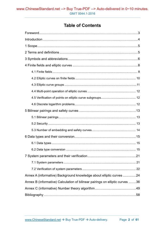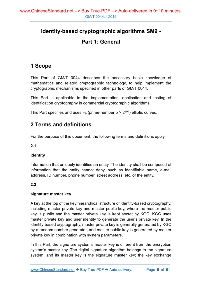 Similar standardsGM/T 0044.1-2016: Identity-based cryptographic algorithms SM9 - Part 1: General---This is an excerpt. Full copy of true-PDF in English version (including equations, symbols, images, flow-chart, tables, and figures etc.), auto-downloaded/delivered in 9 seconds, can be purchased online: https://www.ChineseStandard.net/PDF.aspx/GMT0044.1-2016GM CRYPTOGRAPHY INDUSTRY STANDARD OF THE PEOPLE’S REPUBLIC OF CHINA ICS 35.040 L 80 File No.. 55618-2016 Identity-based cryptographic algorithms SM9 - Part 1. General Issued on: MARCH 28, 2016 Implemented on: MARCH 28, 2016 Issued by. State Cryptography Administration Table of ContentsForeword . 3 Introduction .. 4 1 Scope .. 5 2 Terms and definitions .. 5 3 Symbols and abbreviations . 6 4 Finite fields and elliptic curves .. 8 4.1 Finite fields . 8 4.2 Elliptic curves on finite fields .. 10 4.3 Elliptic curve groups .. 11 4.4 Multi-point operation of elliptic curves .. 12 4.5 Verification of points on elliptic curve subgroups.. 12 4.6 Discrete logarithm problems. 12 5 Bilinear pairings and safety curves .. 13 5.1 Bilinear pairings .. 13 5.2 Security . 13 5.3 Number of embedding and safety curves. 14 6 Data types and their conversion . 15 6.1 Data types .. 15 6.2 Data type conversion .. 15 7 System parameters and their verification . 21 7.1 System parameters .. 21 7.2 Verification of system parameters . 22 Annex A (informative) Background knowledge about elliptic curves .. 24 Annex B (informative) Calculation of bilinear pairings on elliptic curves .. 36 Annex C (informative) Number theory algorithm .. 49 Bibliography .. 58 Identity-based cryptographic algorithms SM9 - Part 1. General1 ScopeThis Part of GM/T 0044 describes the necessary basic knowledge of mathematics and related cryptographic technology, to help implement the cryptographic mechanisms specified in other parts of GM/T 0044. This Part is applicable to the implementation, application and testing of identification cryptography in commercial cryptographic algorithms. This Part specifies and uses Fp (prime-number p > 2191) elliptic curves.2 Terms and definitionsFor the purpose of this document, the following terms and definitions apply. 2.1 identity Information that uniquely identifies an entity. The identity shall be composed of information that the entity cannot deny, such as identifiable name, e-mail address, ID number, phone number, street address, etc. of the entity. 2.2 signature master key A key at the top of the key hierarchical structure of identity-based cryptography, including master private key and master public key, where the master public key is public and the master private key is kept secret by KGC. KGC uses master private key and user identity to generate the user’s private key. In the identity-based cryptography, master private key is generally generated by KGC by a random number generator, and master public key is generated by master private key in combination with system parameters. In this Part, the signature system's master key is different from the encryption system's master key. The digital signature algorithm belongs to the signature system, and its master key is the signature master key; the key exchange where K is the finite field (including Fq and Fqk). < P>. cyclic group generated by element P. [u]P. u times element P in addition group G1, G2. [x, y]. a set of integers not less than x and not more than y. ڿݔۀ. ceiling function, the minimum integer not less than x. For example, ڿ7ۀ = 7, ڿ8.3ۀ = 9. ہݔۂ. floor function, the maximum integer not greater than x. For example, ہ7ۂ = 7, ہ8.3ۂ = 8. β. twist curve parameter. ψ. homomorphic map from G2 to G1, which satisfies P1 = ψ(P2). ⊕. modulo 2 addition operation, in bits, of two bit-strings of equal length.4 Finite fields and elliptic curves4.1 Finite fields 4.1.1 General A filed consists of a non-empty set F and two kinds of operations. These two kinds of operations are addition (represented by “+”) and multiplication (represented by “•”), which satisfy the following arithmetic characteristics. a) (F, +), for addition operation, forms an addition exchange group; the unit element is represented by 0. b) (F\{0}, •), for multiplication operation, forms a multiplicative exchange group; the unit element is represented by 1. c) The distribution law is true. for all a, b, c ∈ F, there is (a + b) • c = a • c + b • c. If the set F is a finite set, the filed is called a finite field. The number of elements in a finite field is called the order of the finite field. 4.1.2 Prime field Fp The finite field of which the order is prime is the prime filed. Let p be a prime, then the set {0, 1, 2, ., p - 1} of the all remainders of the g in ܨ* that makes , g is called a generator. The order of the elements a in ܨ is the smallest positive integer t that satisfies at = 1. The order of the group ܨ* is qm - 1, therefore t I qm - 1. Let the generator of the multiplicative cyclic group ܨ* be g, y ∈ ܨ*. The discrete logarithm problem on finite fields refers to the determination of integer x ∈ [0, qm - 2] that makes y = gx true on ܨ*. 4.6.2 Elliptic curve discrete logarithm problem (ECDLP) With known elliptic curve E(ܨ) (m ≥ 1), points P ∈ E(ܨ) and Q ∈ < P> with the order of n, the elliptic curve discrete logarithm problem refers to the determination of integer J ∈ [0, n - 1] that makes Q = [l]P true.5 Bilinear pairings and safety curves5.1 Bilinear pairings Let (G1, +), (G2, +) and (GT, •) be three cyclic groups, the order of G1, G2 and GT be prime N, P1 be the generator of G1, and P2 be the generator of G2. There is a homomorphism map ψ of G2 to G1 such that ψ(P2) = P1. The bilinear pairing e is a map of G1 × G2 → GT and satisfies the following conditions. a) Bilinearity. For any P ∈ G1, Q ∈ G2, a, b ∈ ZN, there is e([a]P, [b]Q) = e(P, Q)ab; b) Non-degeneracy. ; c) Computability. For any P ∈ G1, Q ∈ G2, there is an effective algorithm for calculating