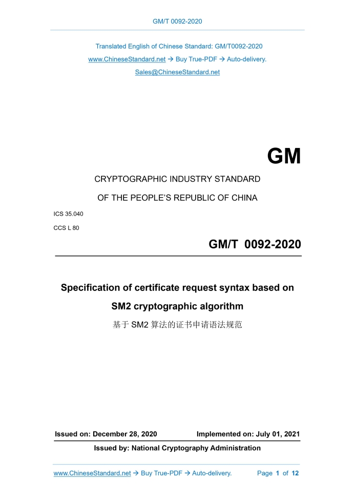 GM/T 0092-2020: Specification of certificate request syntax based on SM2 cryptographic algorithm Delivery: 9 seconds. True-PDF full-copy in English & invoice will be downloaded + auto-delivered via email. See step-by-step procedure Status: Valid