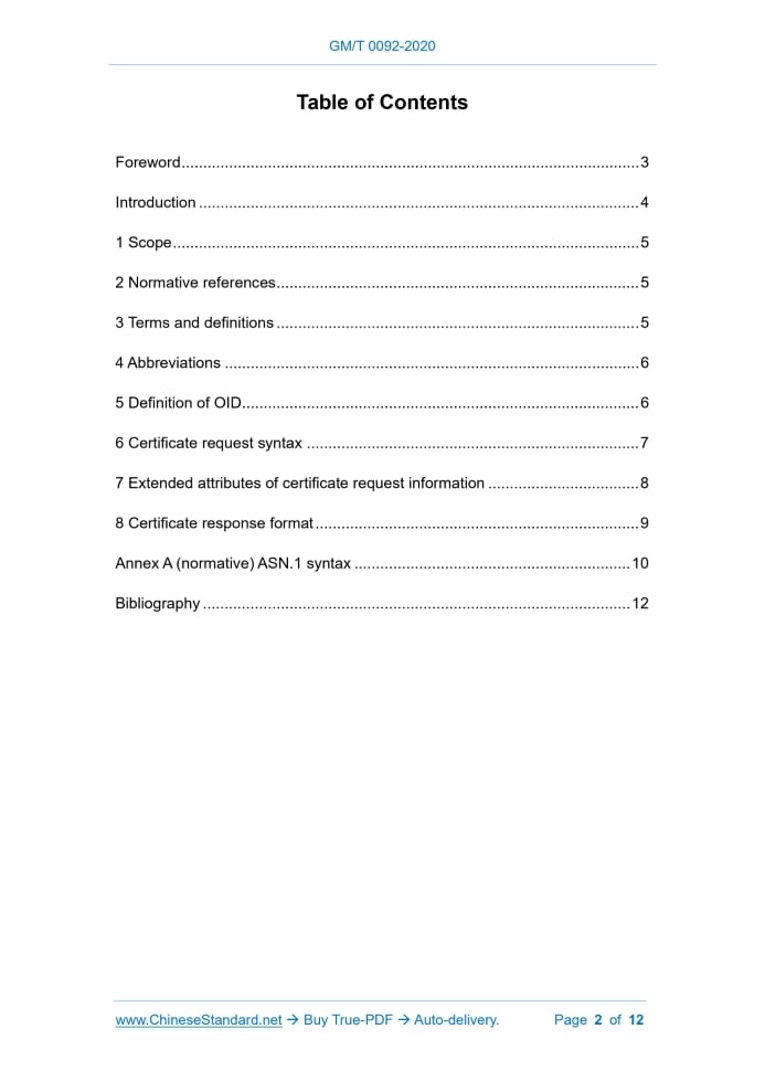 Similar standardsGM/T 0092-2020: Specification of certificate request syntax based on SM2 cryptographic algorithm---This is an excerpt. Full copy of true-PDF in English version (including equations, symbols, images, flow-chart, tables, and figures etc.), auto-downloaded/delivered in 9 seconds, can be purchased online: https://www.ChineseStandard.net/PDF.aspx/GMT0092-2020GM CRYPTOGRAPHIC INDUSTRY STANDARD OF THE PEOPLE’S REPUBLIC OF CHINA ICS 35.040 CCS L 80 Specification of certificate request syntax based on SM2 cryptographic algorithm ISSUED ON: DECEMBER 28, 2020 IMPLEMENTED ON: JULY 01, 2021 Issued by: National Cryptography Administration Table of ContentsForeword ... 3 Introduction ... 4 1 Scope ... 5 2 Normative references ... 5 3 Terms and definitions ... 5 4 Abbreviations ... 6 5 Definition of OID ... 6 6 Certificate request syntax ... 7 7 Extended attributes of certificate request information ... 8 8 Certificate response format ... 9 Annex A (normative) ASN.1 syntax ... 10 Bibliography ... 12ForewordThis Standard was drafted in accordance with the rules given in GB/T 1.1-2020 “Directives for standardization - Part 1: Rules for the structure and drafting of standardizing documents”. Attention is drawn to the possibility that some of the elements of this Standard may be the subject of patent rights. The issuing authority shall not be held responsible for identifying any or all such patent rights. This Standard was proposed by and shall be under the jurisdiction of Cryptographic Industry Standardization Technical Committee. The drafting organizations of this Standard: Beijing Xin'an Century Technology Co., Ltd., Geer Software Co., Ltd., Beijing Digital Certification Co., Ltd., Changchun Jitai Zhengyuan Information Technology Co., Ltd., Xingtang Communication Technology Co., Ltd., Weishitong Information Industry Co., Ltd., National Information Security Engineering Technology Research Center, Shandong De’an Information Technology Co., Ltd., Beijing Chuangyuan Tiandi Technology Co., Ltd. Main drafters of this Standard: Wang Zongbin, Liu Ting, Zheng Qiang, Fu Dapeng, Zhao Lili, Wang Nina, Zhao Shan, Luo Jun, Zhang Xu, Zhou Shujing, Zhang Qingyong, Jiao Jingwei, Shi Xiaofeng, Ma Hongfu. Specification of certificate request syntax based on SM2 cryptographic algorithm1 ScopeThis document defines the certificate request syntax that uses SM2 cryptographic algorithm, the extended attributes of the certificate request information, and the certificate response format. This document is applicable to the development of digital certificate authentication system. When the digital certificate application system uses SM2 cryptographic algorithm for certificate request operations, it encapsulates the standardization of the certificate request syntax.2 Normative referencesThe following referenced documents are indispensable for the application of this document. For dated references, only the edition cited applies. For undated references, the latest edition of the referenced document (including any amendments) applies. GB/T 31503-2015, Information security technology - Encryption and signature message syntax for electronic document GB/T 32905, Information security technology SM3 cryptographic hash algorithm GB/T 33560-2017, Information security technology - Cryptographic application identifier criterion specification GB/T 35275-2017, Information security technology - SM2 cryptographic algorithm encrypted signature message syntax specification GB/T 35276-2017, Information security technology - SM2 cryptography algorithm usage specification GM/Z 4001, Cryptographic terms3 Terms and definitionsFor the purposes of this document, the terms and definitions defined in GM/Z 4001 as well as the followings apply. 3.1 certificate a credible digital document that is digitally signed by an authoritative, credible and impartial third-party certificate certification body recognized by the state 3.2 signature an algorithm defined by GB/T 32905; it is a value generated by an application program that uses a cryptographic algorithm to calculate with a private key; with the characteristics of integrity, message authentication and/or signer authentication 3.3 attributes a collection of object attributes and a related attribute value4 AbbreviationsThe following abbreviations apply to this document. ASN.1: Abstract Syntax Notation One BER: Basic Encoding Rule CA: Certificate Authority DER: Distinguished Encoding Rules for ASN.1; DER is a subset of BER OID: Object Identity5 Definition of OIDThis document defines the identifiers of the three objects certificationRequestInfo, certificationRequest, and challengePassword, see Table 1. Where, AlgorithmIdentifier here is used to identify the signature algorithm. OBJECTIDENTIFIER identifies the specific algorithm. The content of the optional parameters completely depends on the identified algorithm. The signature algorithm of this document is a signature based on SM2 algorithm and SM3 algorithm, without parameters. Its OID is in accordance with GB/T 33560-2017. The type composition of CertificationRequest is shown in Table 3. The subject sending a certificate application generally occurs after the public and private key pair is generated, or after the subject's distinguished name is changed. When applying for a certificate, the purpose of signing the certificate request information is to prevent the subject from using the other party’s public key for certificate request. The signing process consists of the following two steps: a) The components of CertificationRequestInfo are encoded by DER to generate a byte string; b) The result of a) is signed with the private key of the subject of the certificate request and a specific signature algorithm to generate a bit string, that is, a signature.7 Extended attributes of certificate request informationChallengePassword attribute type specifies a password. Using this password, the subject can apply for a certificate or revoke the ce