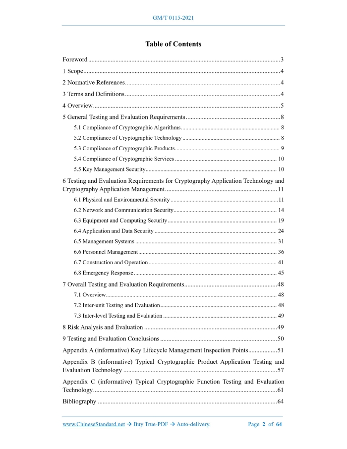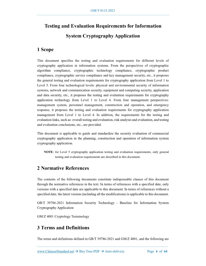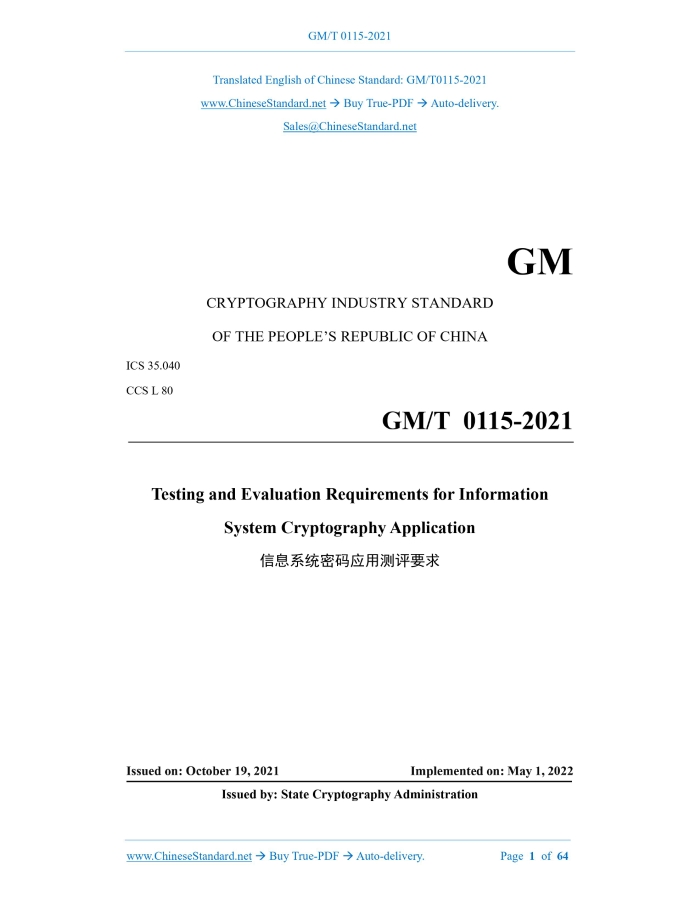 Similar standardsGM/T 0115-2021: Testing and evaluation requirements for information system cryptography application---This is an excerpt. Full copy of true-PDF in English version (including equations, symbols, images, flow-chart, tables, and figures etc.), auto-downloaded/delivered in 9 seconds, can be purchased online: https://www.ChineseStandard.net/PDF.aspx/GMT0115-2021 GM CRYPTOGRAPHY INDUSTRY STANDARD ICS 35.040 CCS L 80 Testing and Evaluation Requirements for Information System Cryptography Application Issued on. OCTOBER 19, 2021 Implemented on. MAY 1, 2022 Issued by. State Cryptography Administration Table of ContentsForeword... 3 1 Scope... 4 2 Normative References... 4 3 Terms and Definitions... 4 4 Overview... 5 5 General Testing and Evaluation Requirements... 8 5.1 Compliance of Cryptographic Algorithms... 8 5.2 Compliance of Cryptographic Technology... 8 5.3 Compliance of Cryptographic Products... 9 5.4 Compliance of Cryptographic Services... 10 5.5 Key Management Security... 10 6 Testing and Evaluation Requirements for Cryptography Application Technology and Cryptography Application Management... 11 6.1 Physical and Environmental Security... 11 6.2 Network and Communication Security... 14 6.3 Equipment and Computing Security... 19 6.4 Application and Data Security... 24 6.5 Management Systems... 31 6.6 Personnel Management... 36 6.7 Construction and Operation... 41 6.8 Emergency Response... 45 7 Overall Testing and Evaluation Requirements... 48 7.1 Overview... 48 7.2 Inter-unit Testing and Evaluation... 48 7.3 Inter-level Testing and Evaluation... 49 8 Risk Analysis and Evaluation... 49 9 Testing and Evaluation Conclusions... 50 Appendix A (informative) Key Lifecycle Management Inspection Points... 51 Appendix B (informative) Typical Cryptographic Product Application Testing and Evaluation Technology... 57 Appendix C (informative) Typical Cryptographic Function Testing and Evaluation Technology... 61 Bibliography... 641 ScopeThis document specifies the testing and evaluation requirements for different levels of cryptography application in information systems. From the perspectives of cryptographic algorithm compliance, cryptographic technology compliance, cryptographic product compliance, cryptographic service compliance and key management security, etc., it proposes the general testing and evaluation requirements for cryptography application from Level 1 to Level 5.From four technological levels. physical and environmental security of information systems, network and communication security, equipment and computing security, application and data security, etc., it proposes the testing and evaluation requirements for cryptography application technology from Level 1 to Level 4.From four management perspectives. management system, personnel management, construction and operation, and emergency response, it proposes the testing and evaluation requirements for cryptography application management from Level 1 to Level 4.In addition, the requirements for the testing and evaluation links, such as. overall testing and evaluation, risk analysis and evaluation, and testing and evaluation conclusions, etc., are provided. This document is applicable to guide and standardize the security evaluation of commercial cryptography application in the planning, construction and operation of information system cryptography application. NOTE. for Level 5 cryptography application testing and evaluation requirements, only general testing and evaluation requirements are described in this document.2 Normative ReferencesThe contents of the following documents constitute indispensable clauses of this document through the normative references in the text. In terms of references with a specified date, only versions with a specified date are applicable to this document. In terms of references without a specified date, the latest version (including all the modifications) is applicable to this document. GB/T 39786-2021 Information Security Technology - Baseline for Information System Cryptography Application GM/Z 4001 Cryptology Terminology3 Terms and DefinitionsThe terms and definitions defined in GB/T 39786-2021 and GM/Z 4001, and the following are applicable to this document. 3.1 commercial cryptography application security evaluation staff Personnel engaged in security evaluation of commercial cryptography application in a commercial cryptography application security evaluation institution.4 OverviewIn accordance with GB/T 39786-2021, the testing and evaluation requirements for information system cryptography application are divided into general testing and evaluation requirements, testing and evaluation requirements for cryptography application technology, and testing and evaluation requirements for cryptography application management.5 General Testing and Evaluation Requirements5.1 Compliance of Cryptographic Algorithms See the specific testing and evaluation units below. 5.2 Compliance of Cryptographic Technology See the specific testing and evaluation units below. 5.3 Compliance of Cryptographic Products See the specific testing and evaluation units below. 5.5 Key Management Security See the specific testing and evaluation units below.6 Testing and Evaluation Requirements for Cryptography Application Technology and Cryptography Application Management6.1 Physical and Environmental Security 6.1.1 Identity authentication See the specific testing and evaluation units below. 6.2.2 Communication data integrity See the specific testing and evaluation units below. 6.2.4 Integrity of network boundary access control information See the specific testing and evaluation units below. 6.3 Equipment and Computing Security 6.3.1 Identity authentication See the specific testing and evaluation units below. 6.4 Application and Data Security 6.4.1 Identity authentication See the specific testing and evaluation units below. 6.4.4 Important data transmission confidentiality See the specific testing and evaluation units bel