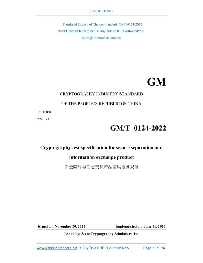 GM/T 0124-2022: Cryptography test specification for secure separation and information exchange product Delivery: 9 seconds. True-PDF full-copy in English & invoice will be downloaded + auto-delivered via email. See step-by-step procedure Status: Valid
