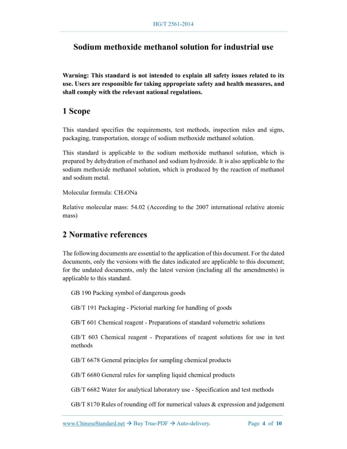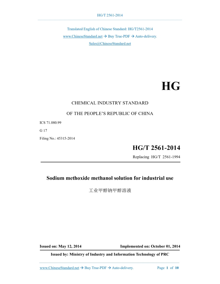 HG/T 2561-2014: Sodium methoxide methanol solution for industrial use Delivery: 9 seconds. True-PDF full-copy in English & invoice will be downloaded + auto-delivered via email. See step-by-step procedure Status: Valid HG/T 2561: Historical versions