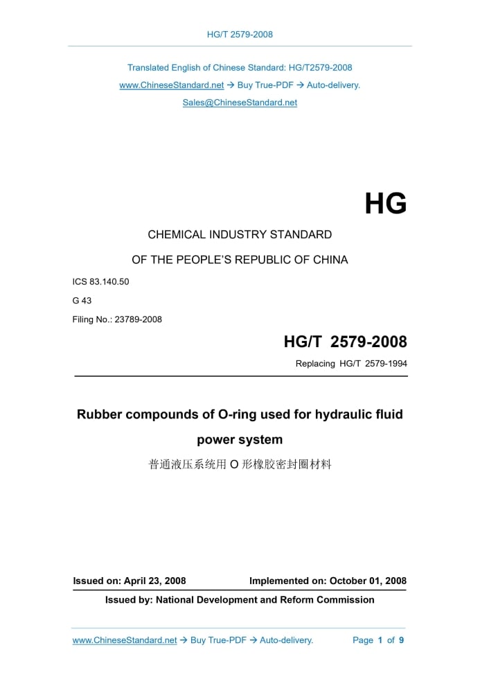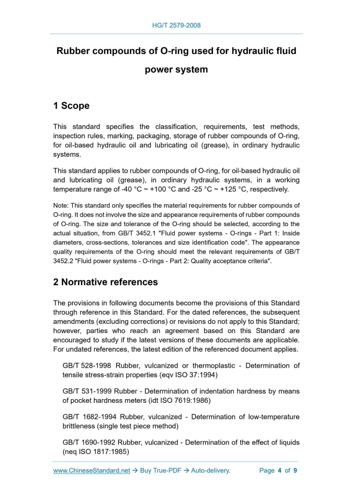 Similar standardsHG/T 2579-2008: Rubber Compounds of O-Rings used for Hydraulic fluid power System---This is an excerpt. Full copy of true-PDF in English version (including equations, symbols, images, flow-chart, tables, and figures etc.), auto-downloaded/delivered in 9 seconds, can be purchased online: https://www.ChineseStandard.net/PDF.aspx/HGT2579-2008HG CHEMICAL INDUSTRY STANDARD OF THE PEOPLE’S REPUBLIC OF CHINA ICS 83.140.50 G 43 Filing No.: 23789-2008 Replacing HG/T 2579-1994 Rubber compounds of O-ring used for hydraulic fluid power system ISSUED ON: APRIL 23, 2008 IMPLEMENTED ON: OCTOBER 01, 2008 Issued by: National Development and Reform Commission Table of ContentsForeword ... 3 1 Scope ... 4 2 Normative references ... 4 3 Classifications ... 5 4 Requirements ... 5 5 Test method ... 6 6 Inspection rules ... 7 7 Identification, packaging, storage ... 8 Appendix A (Informative) Basic physical performance digital code ... 9 Rubber compounds of O-ring used for hydraulic fluid power system1 ScopeThis standard specifies the classification, requirements, test methods, inspection rules, marking, packaging, storage of rubber compounds of O-ring, for oil-based hydraulic oil and lubricating oil (grease), in ordinary hydraulic systems. This standard applies to rubber compounds of O-ring, for oil-based hydraulic oil and lubricating oil (grease), in ordinary hydraulic systems, in a working temperature range of -40 °C ~ +100 °C and -25 °C ~ +125 °C, respectively. Note: This standard only specifies the material requirements for rubber compounds of O-ring. It does not involve the size and appearance requirements of rubber compounds of O-ring. The size and tolerance of the O-ring should be selected, according to the actual situation, from GB/T 3452.1 "Fluid power systems - O-rings - Part 1: Inside diameters, cross-sections, tolerances and size identification code". The appearance quality requirements of the O-ring should meet the relevant requirements of GB/T 3452.2 "Fluid power systems - O-rings - Part 2: Quality acceptance criteria".2 Normative referencesThe provisions in following documents become the provisions of this Standard through reference in this Standard. For the dated references, the subsequent amendments (excluding corrections) or revisions do not apply to this Standard; however, parties who reach an agreement based on this Standard are encouraged to study if the latest versions of these documents are applicable. For undated references, the latest edition of the referenced document applies. GB/T 528-1998 Rubber, vulcanized or thermoplastic - Determination of tensile stress-strain properties (eqv ISO 37:1994) GB/T 531-1999 Rubber - Determination of indentation hardness by means of pocket hardness meters (idt ISO 7619:1986) GB/T 1682-1994 Rubber, vulcanized - Determination of low-temperature brittleness (single test piece method) GB/T 1690-1992 Rubber, vulcanized - Determination of the effect of liquids (neq ISO 1817:1985) prepare a specimen with the equivalent degree of vulcanization. It can also be negotiated by the supplier and the buyer, to use the O-ring as the specimen for the test. 5.2 Method 5.2.1 The measurement of hardness is carried out, in accordance with GB/T 5720-1993, GB/T 531-1999, GB/T 6031-1998. 5.2.2 The determination of tensile strength and elongation at break shall be carried out, in accordance with GB/T 5720-1993 or GB/T 528-1998. 5.2.3 The determination of compression set shall be carried out, in accordance with GB/T 5720-1993 or GB/T 7759-1996. 5.2.4 The liquid resistance test shall be carried out, in accordance with GB/T 5720-1993 or GB/T 1690-1992. 5.2.5 The hot air aging test shall be carried out, in accordance with GB/T 5720- 1993 or GB/T 3512-2001. 5.2.6 The low temperature brittleness test shall be carried out, in accordance with GB/T 1682-1994.6 Inspection rules6.1 For the same rubber material, which is produced on the same shift AND on the same machine, one batch is composed of not more than 300 kg. 6.2 The physical properties of each batch of rubber materials shall be inspected, in accordance with the hardness, tensile strength, elongation at break requirements, in Table 1 or Table 2. 6.3 When one of the following situations occurs, it shall inspect all items of the technical requirements, which are specified in the standard. a) When the product is subject to trans-plant production OR when the new product is subject to type finalization and identification. b) After formal production, where there is significant change in structure, materials, craftsmanship, which may affect the performance of the product. c) During normal production, it is inspected once every quarter. d) When the production is resumed, after suspension for more than 3 months; e) When there is a big difference between the exit-factory inspection result and the last type inspection. f) When the national quality supervision agency requests for type inspection. 6.4 When the inspection of physical properties of the rubber material are unqualified, it shall take double quantity of specimens, to carry out reinspection for the unqualified items. If the reinspection is still unqualified, it is allowed re- melting for one time. After re-melting, it shall carry out a full physical property inspection. If there is still one item unqualified, the batch of rubber compound material is unqualified.7 Identification, packaging, storage7.1 Each batch of rubber compound material shall be marked with the name or code of the rubber compound, manufacturing batch number, manufacturing date, conformity label. 7.2 It shall use the materials, that do not damage or pollute the rubber compound material, for packaging, to prevent foreign matter, such as dust, from adhering to the surface of the rubber material. 7.3 The rubber compound material shall be stored in an environment, which has a temperature below 30 °C AND a relative humidity below 80%, at least 1 m away from the heat source, with proper ventila