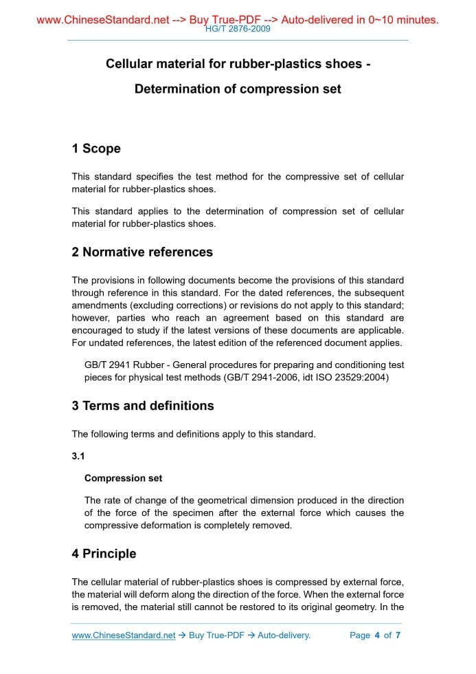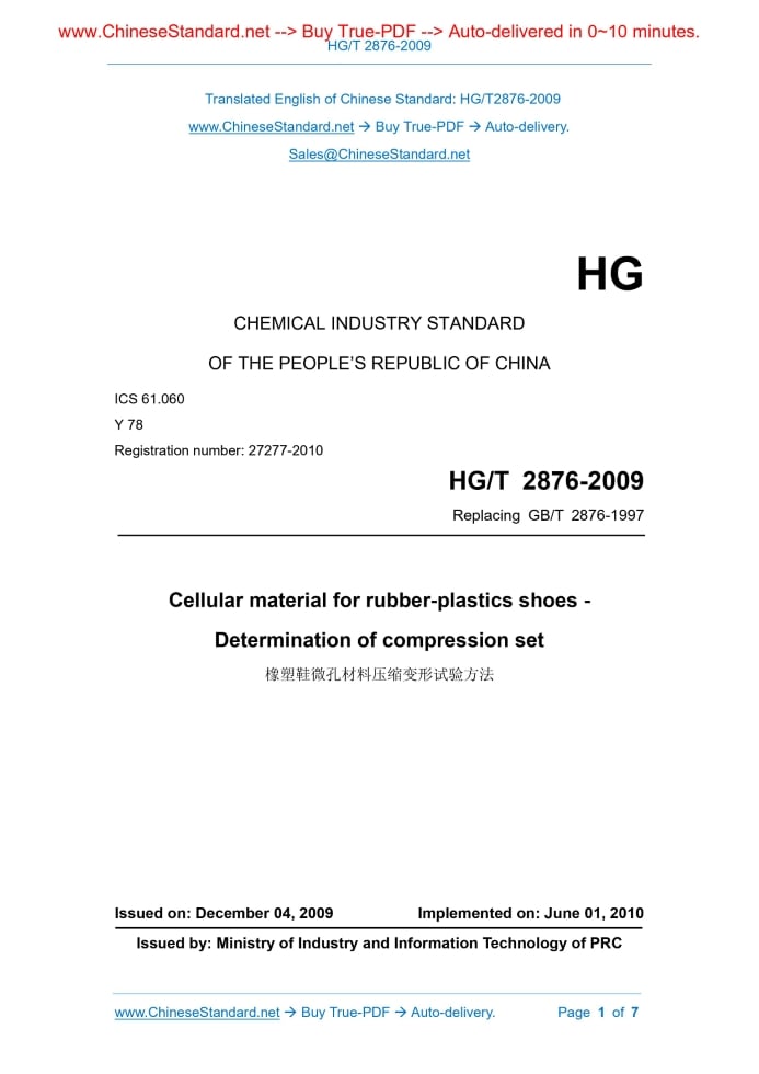 HG/T 2876-2009: Cellular material fo rubber-plastics shoes. Determination of compression set Delivery: 9 seconds. True-PDF full-copy in English & invoice will be downloaded + auto-delivered via email. See step-by-step procedure Status: Valid HG/T 2876: Historical versions