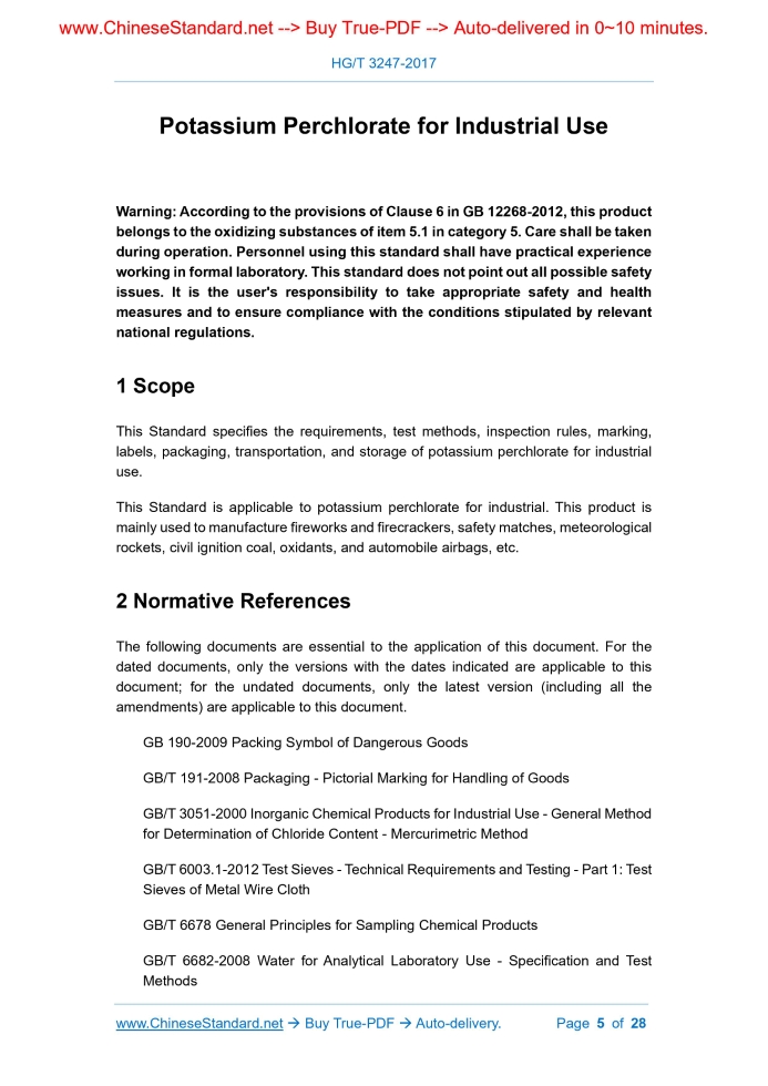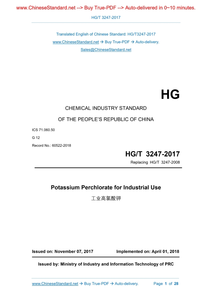 HG/T 3247-2017: Potassium Perchlorate for Industrial Use Delivery: 9 seconds. True-PDF full-copy in English & invoice will be downloaded + auto-delivered via email. See step-by-step procedure Status: Valid HG/T 3247: Historical versions
