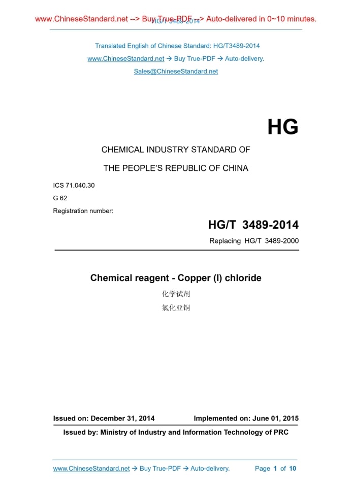 HG/T 3489-2014: Chemical reagent. Copper (Ⅰ) chloride Delivery: 9 seconds. True-PDF full-copy in English & invoice will be downloaded + auto-delivered via email. See step-by-step procedure Status: Valid HG/T 3489: Historical versions