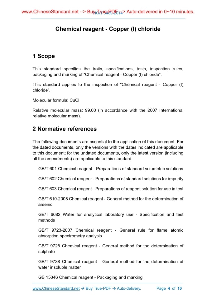 HG/T 3489-2014: Chemical reagent. Copper (Ⅰ) chloride---This is an excerpt. Full copy of true-PDF in English version (including equations, symbols, images, flow-chart, tables, and figures etc.), auto-downloaded/delivered in 9 seconds, can be purchased online: https://www.ChineseStandard.net/PDF.aspx/HGT3489-2014HG CHEMICAL INDUSTRY STANDARD OF THE PEOPLE’S REPUBLIC OF CHINA ICS 71.040.30 G 62 Registration number. Replacing HG/T 3489-2000 Chemical reagent - Copper (I) chloride 氯化亚铜 Issued on: DECEMBER 31, 2014 Implemented on: JUNE 01, 2015 Issued by. Ministry of Industry and Information Technology of PRC Table of ContentsForeword ... 3 1 Scope ... 4 2 Normative references ... 4 3 Traits ... 5 4 Specifications ... 5 5 Tests... 5 6 Inspection rules ... 9 7 Packaging and marking ... 10 Chemical reagent - Copper (I) chloride1 ScopeThis standard specifies the traits, specifications, tests, inspection rules, packaging and marking of “Chemical reagent - Copper (I) chloride”. This standard applies to the inspection of “Chemical reagent - Copper (I) chloride”. Molecular formula. CuCl Relative molecular mass. 99.00 (in accordance with the 2007 International relative molecular mass).2 Normative referencesThe following documents are essential to the application of this document. For the dated documents, only the versions with the dates indicated are applicable to this document; for the undated documents, only the latest version (including all the amendments) are applicable to this standard. GB/T 601 Chemical reagent - Preparations of standard volumetric solutions GB/T 602 Chemical reagent - Preparations of standard solutions for impurity GB/T 603 Chemical reagent - Preparations of reagent solution for use in test GB/T 610-2008 Chemical reagent - General method for the determination of arsenic GB/T 6682 Water for analytical laboratory use - Specification and test methods GB/T 9723-2007 Chemical reagent - General rule for flame atomic absorption spectrometry analysis GB/T 9728 Chemical reagent - General method for the determination of sulphate GB/T 9738 Chemical reagent - General method for the determination of water insoluble matter GB 15346 Chemical reagent - Packaging and marking slowly ADD 80 mL of sulfuric acid, COOL it down, DILUTE it to 500 mL. 5.3.2 Method of determination WEIGH 0.3 g of sample, accurate to 0.0001 g. DISSOLVE it into 25 mL of ammonium ferric sulfate solution (heat to dissolve it if necessary), ADD 100 mL of water and 2 drops of 1,10-phenanthroline ferrous indicator liquid, USE the standard titration solution of ammonium cerous sulphate {c[2(NH4)2SO4 • Ce(SO4)2] = 0.1 mol/L} to titrate the solution until it becomes bright green. Meanwhile MAKE the blank test. The mass fraction w of the copper (I) chloride is calculated in accordance with the formula (1). w = [(V1 - V2) cM/(m x 1000)] x 100% ... (1) Where. V1 - The value of volume of the standard titration solution of ammonium cerous sulphate consumed by the sample, in the unit of millimeters (mL); V2 - The value of volume of the standard titration solution of ammonium cerous sulphate consumed by the blank test, in the unit of millimeters (mL); c - The accurate value of the concentration of the standard titration solution of ammonium cerous sulphate, in the unit of molar per liter (mol/L); M - The value of the molar mass of the copper (I) chloride, in the unit of grams per mole (g/mol) [M (CuCl) = 99.00]; m - The value of the mass of the sample, in the unit of grams (g). 5.4 Acid insoluble matter WEIGH 20 g of sample, ADD 40 mL of water and 80 mL of hydrochloric acid, HEAT to dissolve it, slowly ADD 10 mL of nitric acid, carefully HEAT to boil it, COOL it down, DILUTE it to 200 mL, MAINTAIN the temperature for 1 h in water bath, MAKE determination in accordance with the provisions of GB/T 9738. Among them, USE several drops of water which had been acidified by hydrochloric acid to rinse the filter residue, until the washing solution has no copper ion reaction. 5.5 Sulfate WEIGH 0.5 g of sample, ADD 5 mL of water and 2 mL of nitric acid, carefully HEAT to dissolve it, BOIL it, COOL it down, DILUTE it to 100 mL. TAKE 2 mL, ADD 2 mL of hydrochloric acid solution (20%), EVAPORATE it dry in water bath, then ADD 2 mL of hydrochloric acid solution (20%), EVAPORATE it dry, DISSOLVE it into water (filter it if necessary), DILUTE it to 20 mL, ADD 0.5 mL of hydrochloric acid solution (20%) to acidify it, MAKE determination in accordance with the provisions of GB/T 9728. The turbidity of the solution shall not be greater than the standard turbidity solution. The standard turbidity solution is prepared as follows. TAKE the following amount of the sulfate (SO4) standard solution, MAKE it subject to same treatment together with the residues which are evaporated dry. Analytical pure. 0.02 mg; chemical pure. 0.04 mg. 5.6 Arsenic 5.6.1 Preparation of ammonium ferric sulfate solution (10 g/L) WEIGH 1 g of ammonium ferric sulfate dodecahydrate (III), DISSOLVE it into water, ADD 2 drops of sulfuric acid, DILUTE it to 100 mL. 5.6.2 Method of determination WEIGH 1 g of sample, ADD 10 mL of water and 2 mL of nitric acid, carefully HEAT to dissolve it, BOIL it for 2 min. DILUTE it to 40 mL, BOIL it. ADD 1 mL of ammonium ferric sulfate solution (10 g/L), ADD drops of ammonia solution (10%) until the produced precipitation dissolves, to make it excess 2 mL; MAINTAIN the temperature in water bath for 30 min. USE the No.3 glass filter to filter it, USE ammonia solution (1 + 25) to rinse it until the blue color disappears completely, MAKE another 3 rinsing. USE 2 mL of hot hydrochloric acid solution (20%) to dissolve the precipitation on the filter crucible, USE water to rinse it, COLLECT the filtrate and the washing solution, DILUTE it to 50 mL. TAKE 10 mL, DILUTE it to 70 mL. MAKE determination in accordance with the provisions of clause 4.1 of GB/T 610-2008. The brownish yellow shown by the mercury bromide test paper shall not be deep