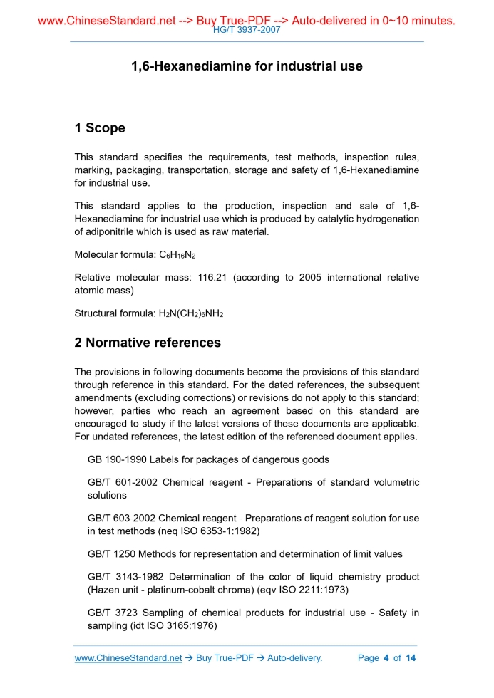 HG/T 3937-2007: 1, 6-Hexanediamine for industrial use Delivery: 9 seconds. True-PDF full-copy in English & invoice will be downloaded + auto-delivered via email. See step-by-step procedure Status: Obsolete HG/T 3937: Historical versions