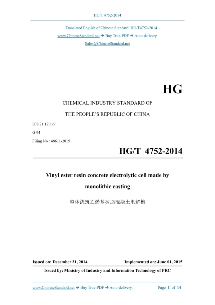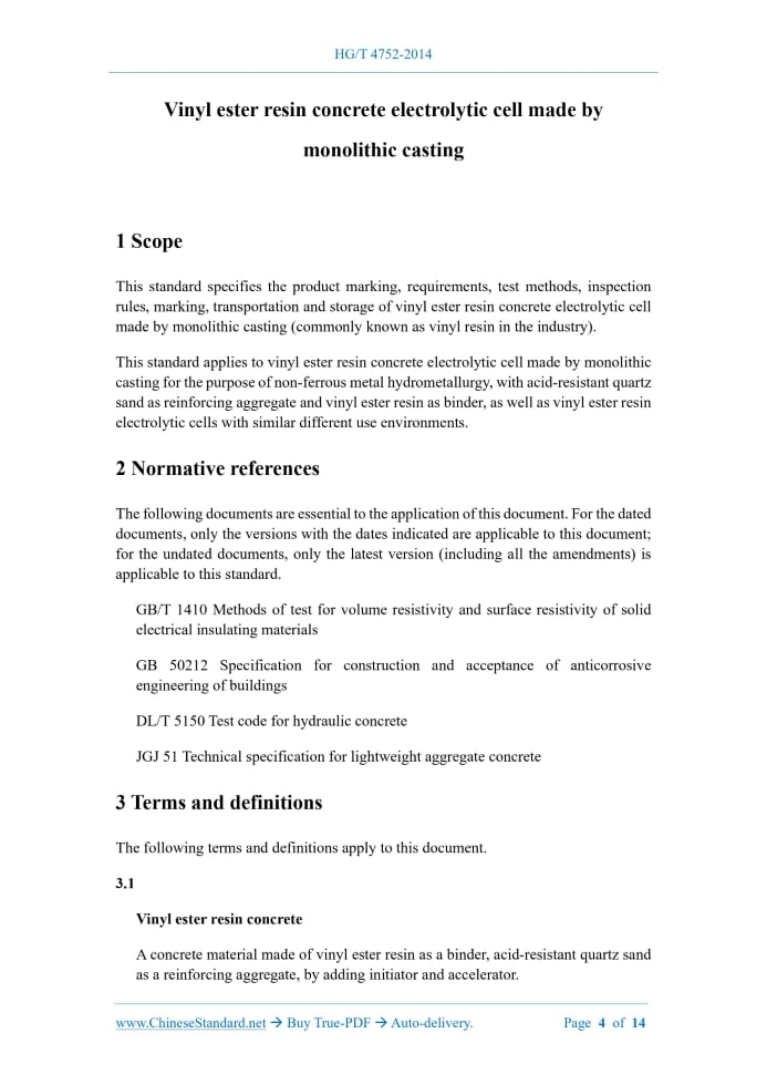 Similar standardsHG/T 4752-2014: Vinyl ester resin concrete electrolytic cell made by monolithic casting---This is an excerpt. Full copy of true-PDF in English version (including equations, symbols, images, flow-chart, tables, and figures etc.), auto-downloaded/delivered in 9 seconds, can be purchased online: https://www.ChineseStandard.net/PDF.aspx/HGT4752-2014HG CHEMICAL INDUSTRY STANDARD OF THE PEOPLE’S REPUBLIC OF CHINA ICS 71.120.99 G 94 Filing No.. 48611-2015 Vinyl ester resin concrete electrolytic cell made by monolithic casting Issued on: DECEMBER 31, 2014 Implemented on: JUNE 01, 2015 Issued by. Ministry of Industry and Information Technology of PRC Table of ContentsForeword... 3 1 Scope... 4 2 Normative references... 4 3 Terms and definitions... 4 4 Product marking... 5 5 Requirements... 5 6 Test method... 7 7 Inspection rules... 8 8 Marking, transportation and storage... 9 Appendix A (Informative) Dimensional stability test method... 11 Vinyl ester resin concrete electrolytic cell made by monolithic casting1 ScopeThis standard specifies the product marking, requirements, test methods, inspection rules, marking, transportation and storage of vinyl ester resin concrete electrolytic cell made by monolithic casting (commonly known as vinyl resin in the industry). This standard applies to vinyl ester resin concrete electrolytic cell made by monolithic casting for the purpose of non-ferrous metal hydrometallurgy, with acid-resistant quartz sand as reinforcing aggregate and vinyl ester resin as binder, as well as vinyl ester resin electrolytic cells with similar different use environments.2 Normative referencesThe following documents are essential to the application of this document. For the dated documents, only the versions with the dates indicated are applicable to this document; for the undated documents, only the latest version (including all the amendments) is applicable to this standard. GB/T 1410 Methods of test for volume resistivity and surface resistivity of solid electrical insulating materials GB 50212 Specification for construction and acceptance of anticorrosive engineering of buildings DL/T 5150 Test code for hydraulic concrete JGJ 51 Technical specification for lightweight aggregate concrete3 Terms and definitionsThe following terms and definitions apply to this document. 3.1 Vinyl ester resin concrete A concrete material made of vinyl ester resin as a binder, acid-resistant quartz sand as a reinforcing aggregate, by adding initiator and accelerator. the test result. 6.10 Full water test Fix the support seat on the test platform according to the actual support working condition of the electrolytic cell; place the electrolytic cell in position. Plug the drain port; fill the cell with water (normal temperature) to the overflow port position; keep it for 24 hours. U-shaped clamps and other protective devices can be set on the electrolytic cell, to prevent the cell from deforming; the platform and support seat shall have sufficient strength and rigidity. 6.11 Dimension stability test The dimensional stability of the electrolytic cell is tested by load temperature simulation test. The test load is 1.2 times the actual working condition of the electrolytic cell; the test water temperature shall be 10 °C higher than the actual working condition temperature of the electrolytic cell. For the recommended test method, refer to Appendix A.7 Inspection rules7.1 Inspection items 7.1.1 Exit-factory inspection The exit-factory inspection items are the appearance inspection, dimensional tolerance inspection, and full water test specified in Table 2 of Chapter 5. 7.1.2 Type inspection The type inspection items are the contents specified in 5.2 and 5.3. Type inspection shall be carried out in any of the following situations. a) Before the product is successfully manufactured for the first time and put into normal production; b) Where there are major changes in materials and processes that may affect product performance; c) When production is resumed after one year of suspension; d) When normal production reaches 3 years; e) When the national quality supervision department proposes a type inspection requirement. 7.2 Sampling rules 7.2.1 Exit-factory inspection sampling During exit-factory inspection, the product shall be 100% inspected by the quality inspection department of the manufacturer. 7.2.2 Type inspection sampling When conducting type inspection of vinyl ester resin concrete material performance, the vinyl ester resin concrete material shall be randomly selected during the casting process of the electrolytic cell; no additional preparation is allowed. The test pieces to be tested shall be 3 groups; the number of test pieces in each group shall comply with the relevant inspection standards. One group is used for the initial inspection. If it fails, the other two groups are used for double sampling and re-inspection. When conducting type inspection of vinyl ester resin concrete electrolytic cell products made by monolithic casting, a batch of electrolytic cell products shall be randomly selected for inspection; then 3 units from the batch shall be randomly selected as samples, one for the initial inspection, if it fails, the other two for double sampling and re-inspection. 100 electrolytic cell products produced continuously with the same raw materials and the same production process are regarded as a batch; if it is less than 100 units, they are counted as a batch. 7.3 Judgment rules 7.3.1 Exit-factory inspection judgment During exit-factory inspection, if all three inspection items of appearance inspection, external dimension tolerance inspection, full water test are qualified, it is judged as qualified products; otherwise, it is unqualified products. 7.3.2 Type inspection judgment During type inspection, if all inspection items are qualified, the batch is judged as qualified products; if there are unqualified items in the inspection items, the unqualified items will continu