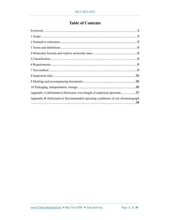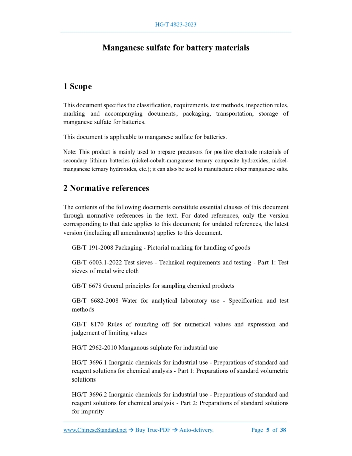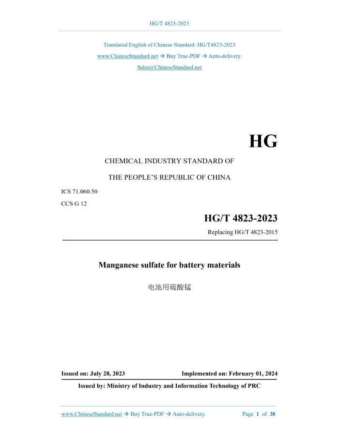 HG/T 4823-2023: Manganese sulfate for battery materials---This is an excerpt. Full copy of true-PDF in English version (including equations, symbols, images, flow-chart, tables, and figures etc.), auto-downloaded/delivered in 9 seconds, can be purchased online: https://www.ChineseStandard.net/PDF.aspx/HGT4823-2023HG CHEMICAL INDUSTRY STANDARD OF THE PEOPLE’S REPUBLIC OF CHINA ICS 71.060.50 CCS G 12 Replacing HG/T 4823-2015 Manganese sulfate for battery materials Issued on. JULY 28, 2023 Implemented on. FEBRUARY 01, 2024 Issued by. Ministry of Industry and Information Technology of PRC Table of ContentsForeword... 3 1 Scope... 5 2 Normative references... 5 3 Terms and definitions... 6 4 Molecular formula and relative molecular mass... 6 5 Classification... 6 6 Requirements... 6 7 Test method... 8 8 Inspection rules... 35 9 Marking and accompanying documents... 36 10 Packaging, transportation, storage... 36 Appendix A (Informative) Reference wavelength of analytical spectrum... 37 Appendix B (Informative) Recommended operating conditions of ion chromatograph ... 381 ScopeThis document specifies the classification, requirements, test methods, inspection rules, marking and accompanying documents, packaging, transportation, storage of manganese sulfate for batteries. This document is applicable to manganese sulfate for batteries. Note. This product is mainly used to prepare precursors for positive electrode materials of secondary lithium batteries (nickel-cobalt-manganese ternary composite hydroxides, nickel- manganese ternary hydroxides, etc.); it can also be used to manufacture other manganese salts.2 Normative referencesThe contents of the following documents constitute essential clauses of this document through normative references in the text. For dated references, only the version corresponding to that date applies to this document; for undated references, the latest version (including all amendments) applies to this document. GB/T 191-2008 Packaging - Pictorial marking for handling of goods GB/T 6003.1-2022 Test sieves - Technical requirements and testing - Part 1.Test sieves of metal wire cloth GB/T 6678 General principles for sampling chemical products GB/T 6682-2008 Water for analytical laboratory use - Specification and test methods GB/T 8170 Rules of rounding off for numerical values and expression and judgement of limiting values HG/T 2962-2010 Manganous sulphate for industrial use HG/T 3696.1 Inorganic chemicals for industrial use - Preparations of standard and reagent solutions for chemical analysis - Part 1.Preparations of standard volumetric solutions HG/T 3696.2 Inorganic chemicals for industrial use - Preparations of standard and reagent solutions for chemical analysis - Part 2.Preparations of standard solutions for impurity3 Terms and definitionsThere are no terms and definitions that need to be defined in this document.4 Molecular formula and relative molecular massMolecular formula of solid product. MnSO4·H2O Relative molecular mass. 169.01 (according to the 2022 international relative atomic mass)5 ClassificationManganese sulfate products for batteries are divided into two categories according to the form of the product.6 Requirements6.1 Appearance. Category I is light pink white powder; Category II is light red solution. 6.2 Category I manganese sulfate solid for batteries shall comply with the provisions of Table 1, 6.3 Manganese sulfate solution for category II batteries shall comply with the requirements of Table 2, when tested according to the test method specified in this document.7 Test methodWarning. Some reagents used in this test method are corrosive, so be careful when operating! 7.1 General provisions The reagents and water used in this document, unless otherwise specified, refer to analytical reagents and grade 3 water specified in Table 1 of GB/T 6682-2008. The standard titration solutions, impurity standard solutions, preparations and products used in the test, unless otherwise specified, are prepared in accordance with the provisions of HG/T 3696.1, HG/T 3696.2, HG/T 3696.3. 7.2 Appearance inspection Under natural light, place the solid product on a white-backed watch glass or white porcelain plate; place the solution product in a beaker; judge the appearance by visual inspection. 7.3 Determination of manganese sulfate content 7.3.1 Principle In an ammonia-ammonium chloride buffer solution with a pH of about 10, use chrome black T as an indicator and use disodium ethylenediaminetetraacetic acid (EDTA) standard titration solution to titrate, until the solution changes from purple-red to pure blue, which is the end point. Calculate the manganese sulfate content based on the consumption of the standard titration solution. 7.3.2 Reagents or materials 7.3.3 Test steps 7.3.4 Test data processing 7.4 Determination of the content of iron, zinc, copper, lead, cadmium, chromium, potassium, sodium, calcium, magnesium, nickel, cobalt, aluminum 7.4.1 Principle The specimen is dissolved in nitric acid; the intensity of the characteristic spectrum of the elements to be measured (iron, zinc, copper, lead, cadmium, chromium, potassium, sodium, calcium, magnesium, nickel, cobalt, aluminum) is determined by inductively coupled plasma emission spectrometer; the working curve method is used for quantification. 7.4.2 Reagents or materials 7.4.2.1 Nitric acid solution. 1+1. Prepared with high-grade pure reagents. 7.4.3 Instruments and equipment Inductively coupled plasma emission spectrometer. 7.4.4 Test steps 7.4.5 Test data processing 7.5.1 Reagents or materials 7.5.2 Instruments and equipment Atomic absorption spectrophotometer. Equipped with a lead hollow cathode lamp. 7.5.3 Test steps 7.5.4 Test data processing 7.5.4.1 Data processing of solid specimen The lead content is calculated as the mass fraction of lead w4 according to formula (6). 7.6 Determination of chloride content 7.6.1 Spectrophotometry (arbitration method) 7.6.2 Ion chromatography 7.6.2.1 Principle The s