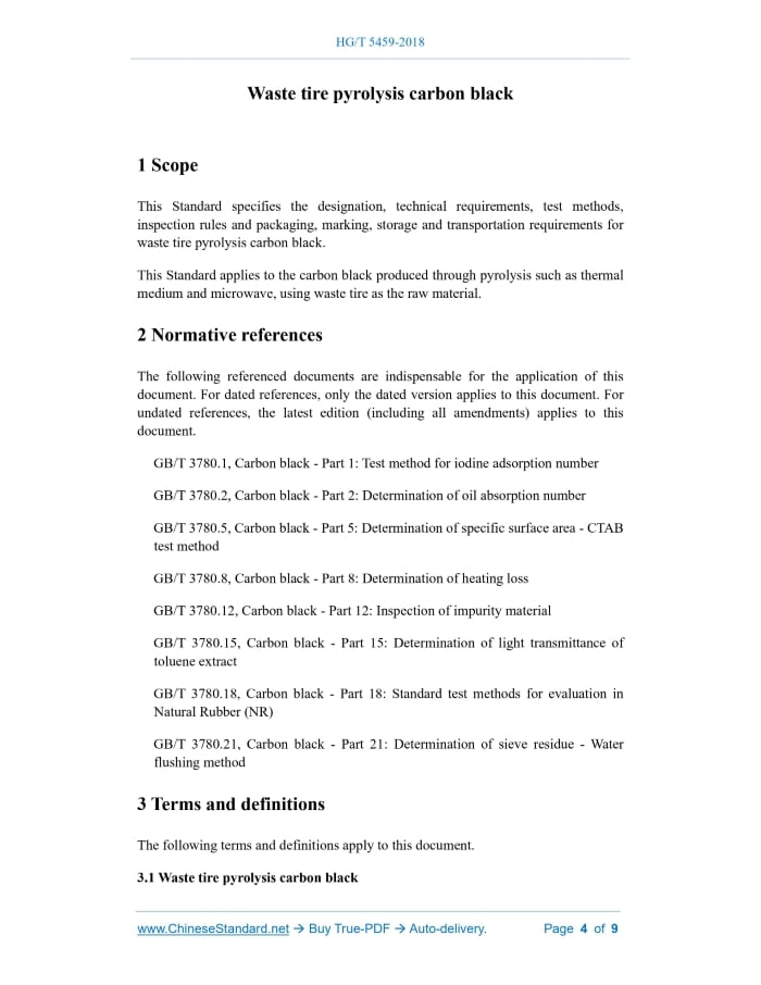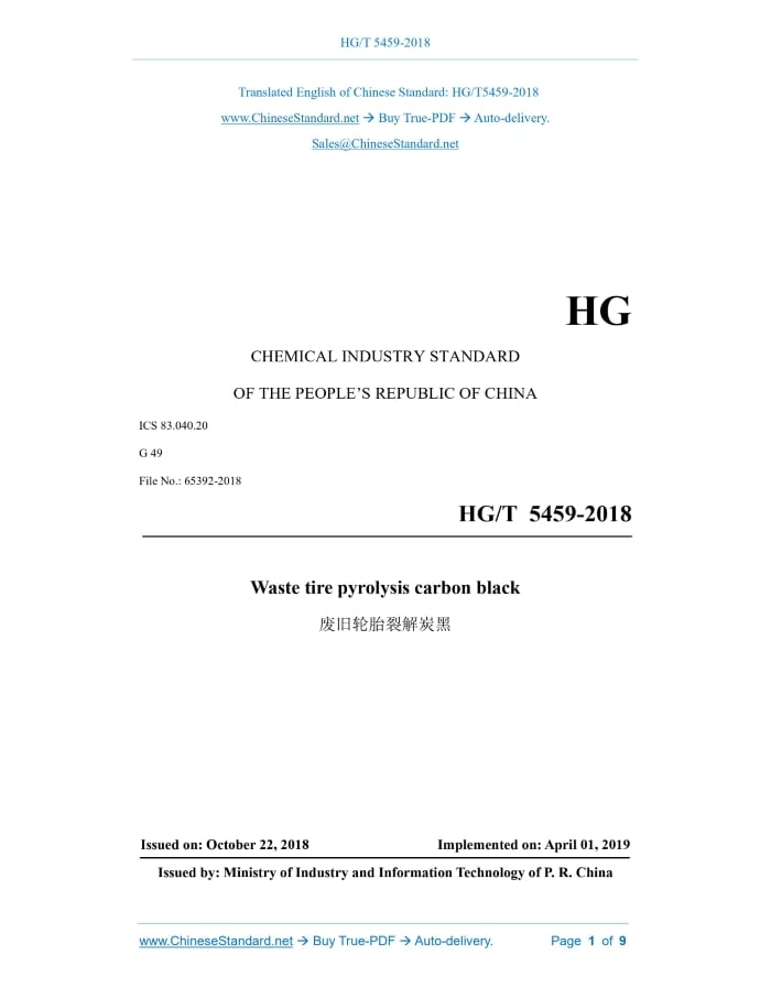 HG/T 5459-2018: Waste tire pyrolysis carbon black Delivery: 9 seconds. True-PDF full-copy in English & invoice will be downloaded + auto-delivered via email. See step-by-step procedure Status: Valid