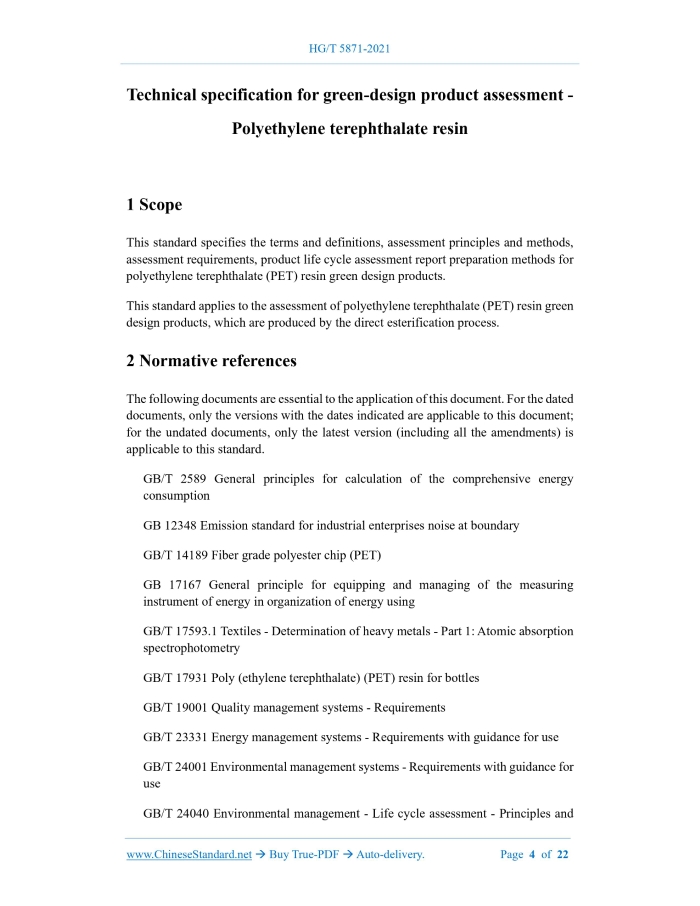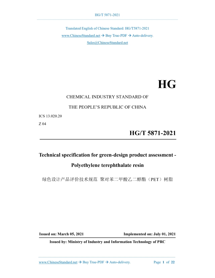 Similar standardsHG/T 5871-2021: Technical specification for green-design product assessment - Polyethylene terephthalate resin---This is an excerpt. Full copy of true-PDF in English version (including equations, symbols, images, flow-chart, tables, and figures etc.), auto-downloaded/delivered in 9 seconds, can be purchased online: https://www.ChineseStandard.net/PDF.aspx/HGT5871-2021 HG CHEMICAL INDUSTRY STANDARD OF THE PEOPLE’S REPUBLIC OF CHINA ICS 13.020.20 Z 04 Technical specification for green-design product assessment - Polyethylene terephthalate resin ISSUED ON: MARCH 05, 2021 IMPLEMENTED ON: JULY 01, 2021 Issued by: Ministry of Industry and Information Technology of PRC Table of ContentsForeword ... 3 1 Scope ... 4 2 Normative references ... 4 3 Terms and definitions ... 5 4 Assessment principles and methods ... 6 5 Assessment requirements ... 7 6 Preparation method for product life cycle assessment report ... 10 Appendix A (Normative) Indicator calculation method ... 12 Appendix B (Informative) Life cycle assessment method for polyethylene terephthalate (PET) resin ... 14 Technical specification for green-design product assessment - Polyethylene terephthalate resin1 ScopeThis standard specifies the terms and definitions, assessment principles and methods, assessment requirements, product life cycle assessment report preparation methods for polyethylene terephthalate (PET) resin green design products. This standard applies to the assessment of polyethylene terephthalate (PET) resin green design products, which are produced by the direct esterification process.2 Normative referencesThe following documents are essential to the application of this document. For the dated documents, only the versions with the dates indicated are applicable to this document; for the undated documents, only the latest version (including all the amendments) is applicable to this standard. GB/T 2589 General principles for calculation of the comprehensive energy consumption GB 12348 Emission standard for industrial enterprises noise at boundary GB/T 14189 Fiber grade polyester chip (PET) GB 17167 General principle for equipping and managing of the measuring instrument of energy in organization of energy using GB/T 17593.1 Textiles - Determination of heavy metals - Part 1: Atomic absorption spectrophotometry GB/T 17931 Poly (ethylene terephthalate) (PET) resin for bottles GB/T 19001 Quality management systems - Requirements GB/T 23331 Energy management systems - Requirements with guidance for use GB/T 24001 Environmental management systems - Requirements with guidance for use GB/T 24040 Environmental management - Life cycle assessment - Principles and frameworks GB/T 24044 Environmental management - Life cycle assessment - Requirements and guidelines GB 31572 Emission standard of pollutants for synthetic resin industry GB 31604.49 National food safety standard - Food contact materials and articles - Determination of arsenic, cadmium, chromium and lead; migration of arsenic, cadmium, chromium, nickel, lead, antimony and zinc GB/T 32161 General principles for eco-design product assessment GB/T 32685 Purified terephthalic acid (PTA) for industrial use GB 37822 Standard for fugitive emission of volatile organic compounds GB/T 45001 Occupational health and safety management systems - Requirements with guidance for use AQ/T 9006 Basic norms for work safety standardization of enterprises SH/T 1817 Plastics - Determination of residual acetaldehyde in polyethylene terephthalate (PET) resin for bottles - Headspace gas chromatography Measures for the Disclosure of Environmental Information of Enterprises and Institutions (Order No.31 of the Ministry of Environmental Protection of the People's Republic of China, December 19, 2014)3 Terms and definitionsThe following terms and definitions apply to this document. 3.1 Green-design product Products that meet product performance and safety requirements, with low energy consumption, low pollution emissions, low environmental impact, harmless to human health, easy recycling and reuse, in the entire life cycle of raw material acquisition, product production, use, waste disposal, under the premise of meeting technical feasibility and economic rationality. 3.2 Life cycle A series of linked stages in the product system, from the acquisition of raw materials from nature or natural resources to final disposal. 3.3 Life cycle assessment (LCA) The stage of understanding and evaluating the potential environmental impact and importance of the product system throughout the product life cycle. 3.4 Direct esterification A method of producing esters by direct reaction of acids and alcohols. High-purity terephthalic acid and ethylene glycol are prepared, according to the molar ratio, to form fluid bis(hydroxyethyl) terephthalate, then poly-condensed to obtain PET.4 Assessment principles and methods4.1 Assessment principles 4.1.1 Principle of combining life cycle assessment with indicator assessment Based on the principle of combining life cycle assessment with indicator assessment, the entire life cycle of polyethylene terephthalate (PET) resin products is considered; the resource and energy consumption, ecological environment, human health factors of each stage are deeply analyzed from product design, raw material acquisition, product production, product use, post-waste recycling, comprehensive utilization of the industrial "three wastes" produced, to select the indicators that can be evaluated at different stages to form an assessment indicator system. 4.1.2 Principle of optimal selection of environmental impact types Based on the characteristics of polyethylene terephthalate (PET) resin products and production process characteristics, taking into account the types of environmental impacts that are of high social concern and clearly required by national laws or policies, select the key resource attributes, energy attributes, environmental attributes, product attributes for assessment.