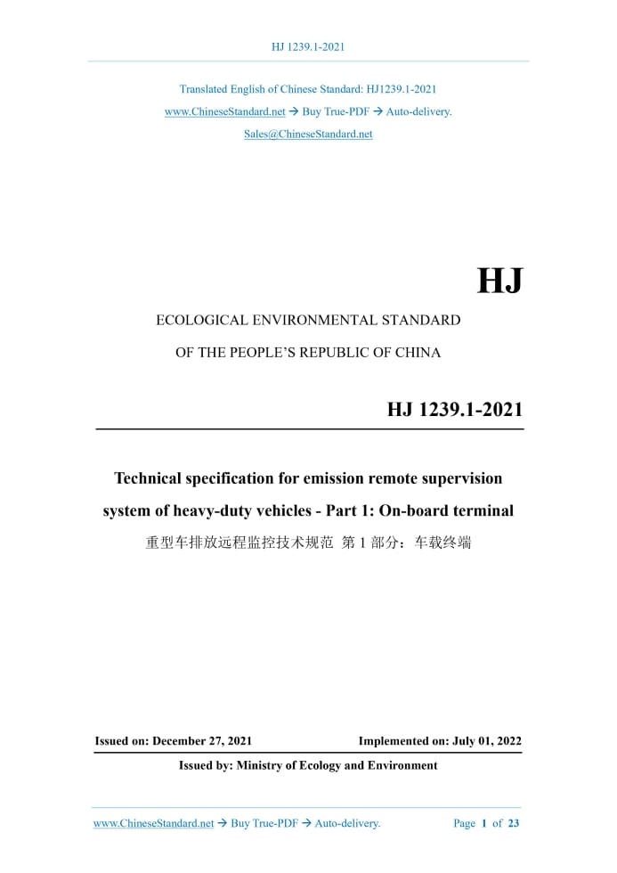 HJ 1239.1-2021: Technical specification for emission remote supervision system of heavy-duty vehicles - Part 1: On-board terminal Delivery: 9 seconds. True-PDF full-copy in English & invoice will be downloaded + auto-delivered via email. See step-by-step procedure Status: Valid