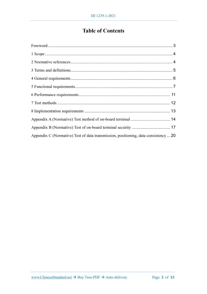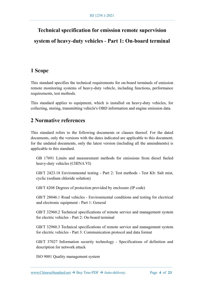 HJ 1239.1-2021: Technical specification for emission remote supervision system of heavy-duty vehicles - Part 1: On-board terminal---This is an excerpt. Full copy of true-PDF in English version (including equations, symbols, images, flow-chart, tables, and figures etc.), auto-downloaded/delivered in 9 seconds, can be purchased online: https://www.ChineseStandard.net/PDF.aspx/HJ1239.1-2021 ECOLOGICAL ENVIRONMENTAL STANDARD OF THE PEOPLE’S REPUBLIC OF CHINA Technical specification for emission remote supervision system of heavy-duty vehicles - Part 1: On-board terminal ISSUED ON: DECEMBER 27, 2021 IMPLEMENTED ON: JULY 01, 2022 Issued by: Ministry of Ecology and Environment Table of ContentsForeword ... 3 1 Scope ... 4 2 Normative references ... 4 3 Terms and definitions... 5 4 General requirements ... 6 5 Functional requirements ... 7 6 Performance requirements ... 11 7 Test methods ... 12 8 Implementation requirements ... 13 Appendix A (Normative) Test method of on-board terminal ... 14 Appendix B (Normative) Test of on-board terminal security ... 17 Appendix C (Normative) Test of data transmission, positioning, data consistency ... 20 Technical specification for emission remote supervision system of heavy-duty vehicles - Part 1: On-board terminal1 ScopeThis standard specifies the technical requirements for on-board terminals of emission remote monitoring systems of heavy-duty vehicle, including functions, performance requirements, test methods. This standard applies to equipment, which is installed on heavy-duty vehicles, for collecting, storing, transmitting vehicle's OBD information and engine emission data.2 Normative referencesThis standard refers to the following documents or clauses thereof. For the dated documents, only the versions with the dates indicated are applicable to this document; for the undated documents, only the latest version (including all the amendments) is applicable to this standard. GB 17691 Limits and measurement methods for emissions from diesel fueled heavy-duty vehicles (CHINA VI) GB/T 2423.18 Environmental testing - Part 2: Test methods - Test Kb: Salt mist, cyclic (sodium chloride solution) GB/T 4208 Degrees of protection provided by enclosure (IP code) GB/T 28046.1 Road vehicles - Environmental conditions and testing for electrical and electronic equipment - Part 1: General GB/T 32960.2 Technical specifications of remote service and management system for electric vehicles - Part 2: On-board terminal GB/T 32960.3 Technical specifications of remote service and management system for electric vehicles - Part 3: Communication protocol and data format GB/T 37027 Information security technology - Specifications of definition and description for network attack ISO 9001 Quality management system ISO 14001 Environmental management system GM/T 0008 Cryptography test criteria for security IC GM/T 0009 SM2 Cryptography algorithm application specification3 Terms and definitionsThe terms and definitions, which are defined in GB 17691, as well as the following terms and definitions, apply to this standard. 3.1 Heavy-duty vehicles (HDV) Heavy-duty vehicles in this standard refer to vehicles, that undergo type inspection and information disclosure, in accordance with the technical requirements specified in GB 17691, including compression-ignition engine vehicles, gas-fuel ignition engine vehicles, dual-fuel vehicles, hybrid electric vehicles. 3.2 On-board terminal Equipment, which is installed on heavy-duty vehicles, to collect, store, transmit vehicle's on-board diagnostic system (OBD) information and engine emission data, AND shall not be artificially removed. It is a pollution control device. 3.3 Digital signature Data attached to a data unit, or a cryptographic conversion of a data unit. Such data or conversion allows the receipt of the data unit to confirm the origin and integrity of the data unit AND to protect the data from forgery or denial by a person (such as the recipient). 3.4 Key A sequence of symbols, which are used to control cryptographic transformation operations (such as encryption, decryption, cryptographic verification function computation, signature generation, or signature verification). It is an asymmetric key pair, which consists of a public and private key. The private key is used for signature or decryption, which shall not be disclosed. The public key is used for signature verification or encryption. 3.5 Time to first fix (TTFF) The time to obtain the correct fix, after the navigation receiver is powered on. 3.6 Re-get time After a brief interruption of the satellite signal, the time when the navigation receiver reacquires the satellite signal AND determines its current position. 3.7 Real-time kinematic (RTK) The carrier phase difference technology, which is a difference method for processing the carrier phase observations of two measuring stations in real time. It sends the carrier phase, which is collected by the base station, to the user receiver, to calculate the difference and resolve the coordinates.4 General requirements4.1 The on-board terminals for emission remote monitoring of heavy-duty vehicles shall meet the requirements of GB 17691; meet the functional requirements, which are specified in Chapter 5 of this standard; meet the performance requirements, which are specified in Chapter 6. 4.2 In principle, the original OBD interface shall not be occupied, by the installation of the on-board terminal for emission remote monitoring. If it is required to be occupied, an OBD interface, that meets the relevant standards, shall be reserved separately. 4.3 Vehicle manufacturers shall install alarm light-related indicators, in prominent positions, such as on-board terminals, dashboards or display panels. Owners of heavy- duty vehicles can use the alarm lights and other indicators of on-board terminals, to know the networking situation of on-board terminals, in real time. 4.4 The on-board terminal shall have anti-dismantling technical measures, 