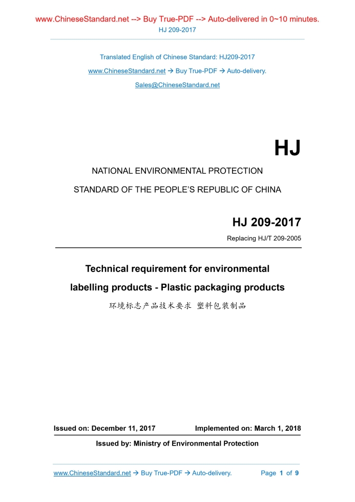 HJ 209-2017: Technical requirement for environmental labeling products Plastic packaging products Delivery: 9 seconds. True-PDF full-copy in English & invoice will be downloaded + auto-delivered via email. See step-by-step procedure Status: Valid HJ 209: Historical versions