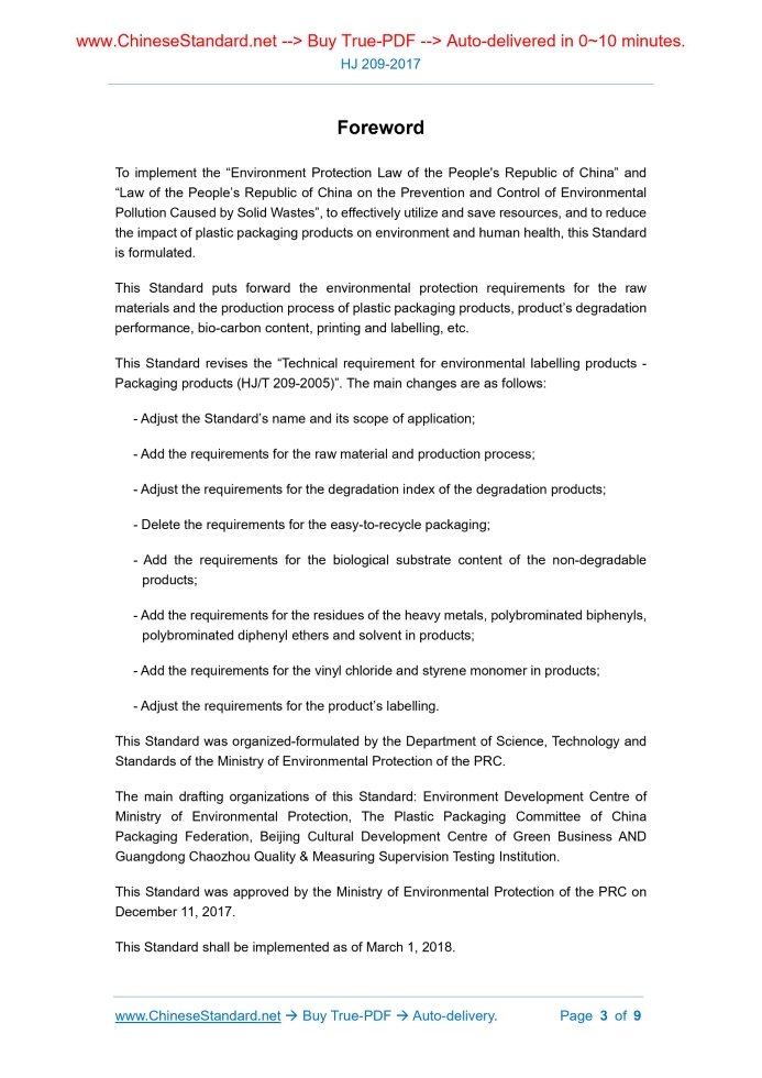 Similar standardsHJ 209-2017: Technical requirement for environmental labeling products Plastic packaging products---This is an excerpt. Full copy of true-PDF in English version (including equations, symbols, images, flow-chart, tables, and figures etc.), auto-downloaded/delivered in 9 seconds, can be purchased online: https://www.ChineseStandard.net/PDF.aspx/HJ209-2017 HJ NATIONAL ENVIRONMENTAL PROTECTION Replacing HJ/T 209-2005 Technical requirement for environmental labelling products - Plastic packaging products Issued on: DECEMBER 11, 2017 Implemented on: MARCH 1, 2018 Issued by. Ministry of Environmental Protection Table of ContentsForeword. 3 1 Scope of application. 5 2 Normative references. 5 3 Terms and definitions. 5 4 Basic requirements. 6 5 Technical contents.. 6 6 Test methods.. 7 Appendix A. 8 Appendix B.. 9ForewordTo implement the “Environment Protection Law of the People's Republic of China” and “Law of the People’s Republic of China on the Prevention and Control of Environmental Pollution Caused by Solid Wastes”, to effectively utilize and save resources, and to reduce the impact of plastic packaging products on environment and human health, this Standard is formulated. This Standard puts forward the environmental protection requirements for the raw materials and the production process of plastic packaging products, product’s degradation performance, bio-carbon content, printing and labelling, etc. This Standard revises the “Technical requirement for environmental labelling products - Packaging products (HJ/T 209-2005)”. The main changes are as follows. - Adjust the Standard’s name and its scope of application; - Add the requirements for the raw material and production process; - Adjust the requirements for the degradation index of the degradation products; - Delete the requirements for the easy-to-recycle packaging; - Add the requirements for the biological substrate content of the non-degradable products; - Add the requirements for the residues of the heavy metals, polybrominated biphenyls, polybrominated diphenyl ethers and solvent in products; - Add the requirements for the vinyl chloride and styrene monomer in products; - Adjust the requirements for the product’s labelling. This Standard was organized-formulated by the Department of Science, Technology and Standards of the Ministry of Environmental Protection of the PRC. The main drafting organizations of this Standard. Environment Development Centre of Ministry of Environmental Protection, The Plastic Packaging Committee of China Packaging Federation, Beijing Cultural Development Centre of Green Business AND Guangdong Chaozhou Quality & Measuring Supervision Testing Institution. This Standard was approved by the Ministry of Environmental Protection of the PRC on December 11, 2017. This Standard shall be implemented as of March 1, 2018. Technical requirement for environmental labelling products - Plastic packaging products 1 Scope of application This standard specifies the terms and definitions, basic requirements, technical contents, and inspection methods for environmental labelling products of plastic packaging products. This standard applies to packaging products with plastic as the main material. 2 Normative references The provisions in following documents are referenced by this Standard. For undated documents, the valid version applies to this Standard. GB 9681 Hygienic standard of products of polyvinyl chloride for food packaging GB 9692 Hygienic standard for polystyrene resin used as food packaging material GB/T 4122.1 Packaging terms - Part 1.Basic GB/T 10004 Plastic laminated films and pouches for packaging - dry lamination and extrusion lamination GB/T 16288 Marking of plastics products GB/T 20197 Define, classify, marking and degradability requirement of degradable plastic GB/T 21928 Determination of phthalate esters in food plastic packaging materials GB/T 29649 Determining the bio-based content of bio-based materials - Liquid scintillation counters (LSC) method HJ 2539 Technical requirement for environmental labelling products - Part 3.Gravure printing 3 Terms and definitions The terms and definitions specified in GB/T 4122.1-2008 and the followings are applicable ......Source: Above contents are excerpted from the full-copy PDF -- translated/reviewed by: www.ChineseStandard.net / Wayne Zheng et al. Tips & Frequently Asked Questions:Question 1: How long will the true-PDF of English version of HJ 209-2017 be delivered?Answer: The full copy PDF of English version of HJ 209-2017 can be downloaded in 9 seconds, and it will also be emailed to you in 9 seconds (double mechanisms to ensure the delivery reliably), with PDF-invoice.Question 2: Can I share the purchased PDF of HJ 209-2017_English with my colleagues?Answer: Yes. The purchased PDF of HJ 209-2017_English will be deemed to be sold to your employer/organization who actually paid for it, including your colleagues and your employer's intranet.Question 3: Does the price include tax/VAT?Answer: Yes. Our tax invoice, downloaded/delivered in 9 seconds, includes all tax/VAT and complies with 100+ countries' tax regulations (tax exempted in 100+ countries) -- See Avoidance of Double Taxation Agreements (DTAs): List of DTAs signed between Singapore and 100+ countriesQuestion 4: Do you accept my currency other than USD?Answer: Yes. www.ChineseStandard.us -- HJ 209-2017 -- Click this link and select your country/currency to pay, the exact amount in your currency will be printed on the invoice. Full PDF will also be downloaded/emailed in 9 seconds.Question 5: Should I purchase the latest version HJ 209-2017?Answer: Yes. Unless special scenarios such as technical constraints or academic study, you should always prioritize to purchase the latest version HJ 209-2017 even if the enforcement date is in future. Complying with the latest version means that, by default, it also complies with all the earlier versions, technically.How to buy and downlo
