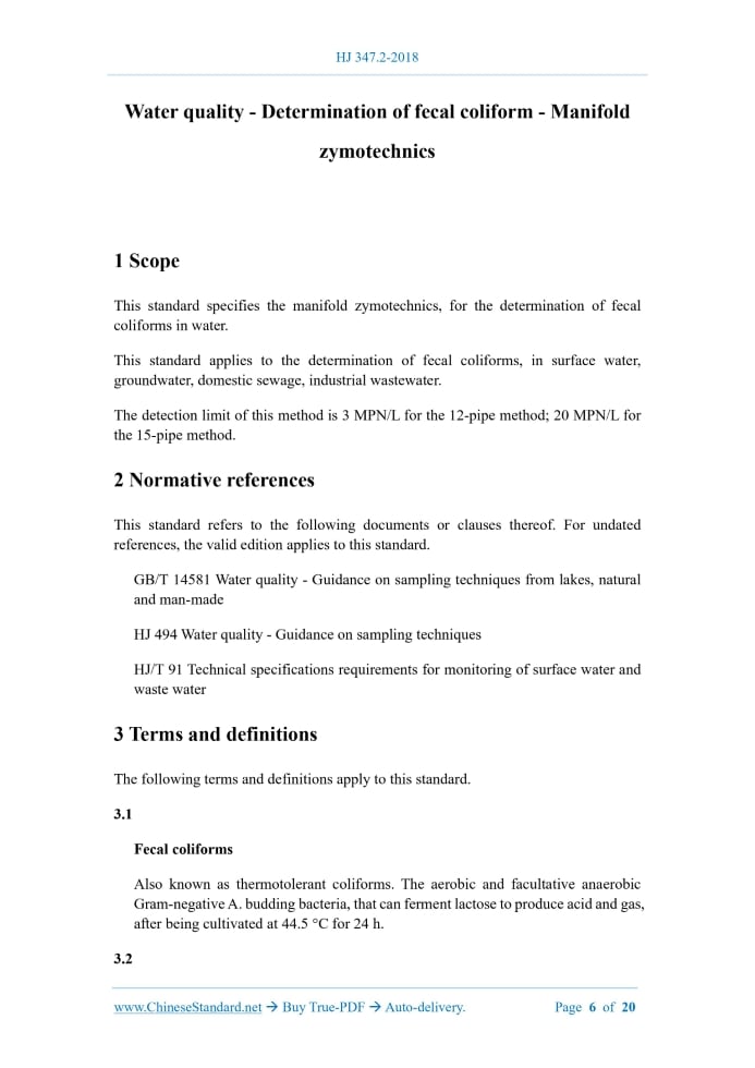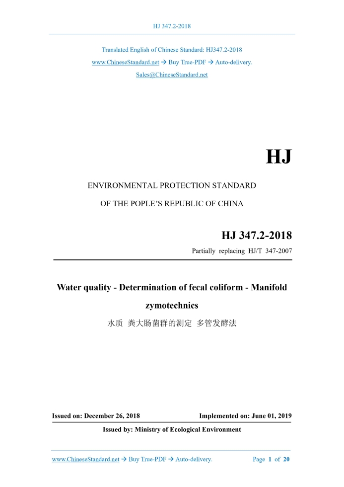 HJ 347.2-2018: Water quality - Determination of fecal coliform - Manifold zymotechnics Delivery: 9 seconds. True-PDF full-copy in English & invoice will be downloaded + auto-delivered via email. See step-by-step procedure Status: Valid