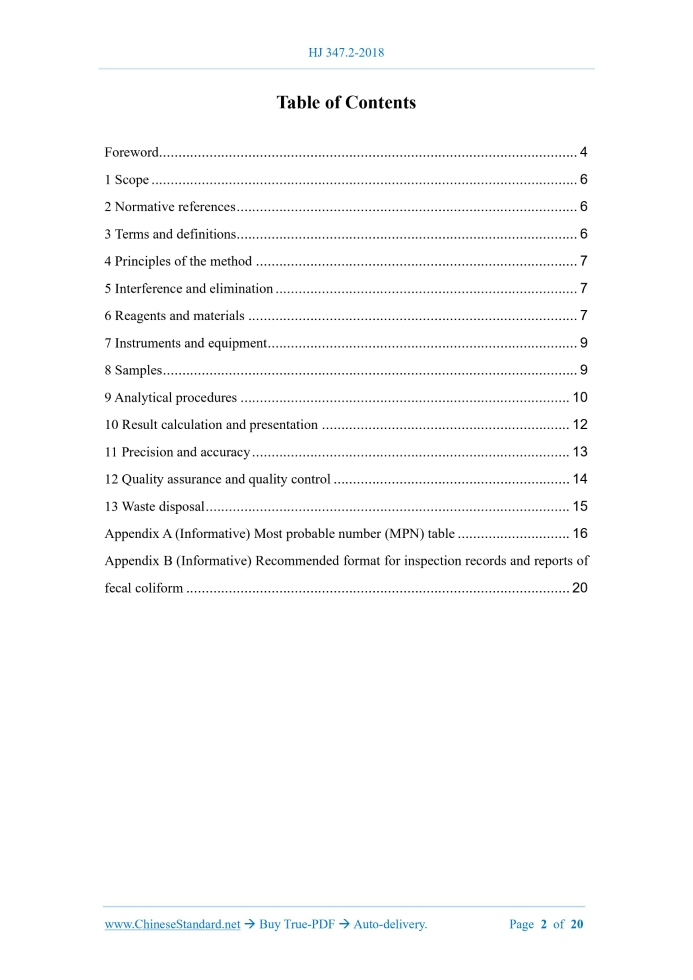 HJ 347.2-2018: Water quality - Determination of fecal coliform - Manifold zymotechnics---This is an excerpt. Full copy of true-PDF in English version (including equations, symbols, images, flow-chart, tables, and figures etc.), auto-downloaded/delivered in 9 seconds, can be purchased online: https://www.ChineseStandard.net/PDF.aspx/HJ347.2-2018ENVIRONMENTAL PROTECTION STANDARD OF THE POPLE’S REPUBLIC OF CHINA Partially replacing HJ/T 347-2007 Water quality - Determination of fecal coliform - Manifold zymotechnics ISSUED ON: DECEMBER 26, 2018 IMPLEMENTED ON: JUNE 01, 2019 Issued by: Ministry of Ecological Environment Table of ContentsForeword ... 4 1 Scope ... 6 2 Normative references ... 6 3 Terms and definitions... 6 4 Principles of the method ... 7 5 Interference and elimination ... 7 6 Reagents and materials ... 7 7 Instruments and equipment ... 9 8 Samples ... 9 9 Analytical procedures ... 10 10 Result calculation and presentation ... 12 11 Precision and accuracy ... 13 12 Quality assurance and quality control ... 14 13 Waste disposal ... 15 Appendix A (Informative) Most probable number (MPN) table ... 16 Appendix B (Informative) Recommended format for inspection records and reports of fecal coliform ... 20 Water quality - Determination of fecal coliform - Manifold zymotechnics1 ScopeThis standard specifies the manifold zymotechnics, for the determination of fecal coliforms in water. This standard applies to the determination of fecal coliforms, in surface water, groundwater, domestic sewage, industrial wastewater. The detection limit of this method is 3 MPN/L for the 12-pipe method; 20 MPN/L for the 15-pipe method.2 Normative referencesThis standard refers to the following documents or clauses thereof. For undated references, the valid edition applies to this standard. GB/T 14581 Water quality - Guidance on sampling techniques from lakes, natural and man-made HJ 494 Water quality - Guidance on sampling techniques HJ/T 91 Technical specifications requirements for monitoring of surface water and waste water3 Terms and definitionsThe following terms and definitions apply to this standard. 3.1 Fecal coliforms Also known as thermotolerant coliforms. The aerobic and facultative anaerobic Gram-negative A. budding bacteria, that can ferment lactose to produce acid and gas, after being cultivated at 44.5 °C for 24 h. 3.2 Most probable number (MPN) Also known as dilution culture counting, which is an indirect counting method, based on Poisson distribution. Using statistical principles, according to the positive number of target microorganisms, which are produced by a certain volume of samples, at different dilutions after culturing, look up the Table to estimate the number of target microorganisms, in a certain volume of samples (the most probable number of target microorganisms per unit volume).4 Principles of the methodThe samples are added to the test tube, which contains lactose peptone medium. The initial fermentation and enrichment culture is carried out at 37 °C. The coliform bacteria grow and reproduces in the medium; decomposes lactose to produce acid and gas. The generated acid changes the bromocresol purple indicator from purple to yellow; the gas produced goes into the reverse tube, indicating gas production. After re-fermentation at 44.5 °C, the bile salt No.3 in the medium can inhibit the growth of Gram-positive bacteria; the bacteria, that produced gas at the end, are determined to be fecal coliforms. By checking the MPN Table, the fecal coliform concentration value is obtained.5 Interference and elimination5.1 Active chlorine has oxidative properties, which can destroy the enzyme activity in microbial cells AND cause cell death. Sodium thiosulfate solution (6.7) can be added, during sample collection (8.1), to eliminate the interference. 5.2The metal ions have cytotoxicity, which can destroy the enzymatic activity in the microbial cells AND cause cell death. The disodium EDTA solution (6.8) can be added, during sample collection (8.1), to eliminate the interference.6 Reagents and materialsUnless otherwise stated, analytical reagents or biological reagents, that meet national standards, are used in the analysis. The experimental water is distilled or deionized water. 6.1 Lactose peptone medium. Peptone: 10 g Beef extract: 3 g Lactose: 5 g Weigh 15.7 g of sodium thiosulfate (6.5). Dissolve it in an appropriate amount of water. Make its volume reach to 100 ml. Prepare it before use. 6.8 Disodium EDTA solution: ρ (C10H14N2O8Na2·2H2O) = 0.15 g/ml Weigh 15 g of disodium EDTA (6.6). Dissolve it in an appropriate amount of water. Make its volume reach to 100 ml. This solution can be stored for 30 days.7 Instruments and equipment7.1 Sampling bottle: 500 ml wide-mouth glass bottle with screw cap or ground stopper. 7.2 Autoclave: 115 °C, 121 °C adjustable. 7.3 Constant temperature incubator or water bath: The allowable temperature deviation is 37 °C ± 0.5 °C, 44 °C ± 0.5 °C. 7.4 pH meter: Accurate to 0.1 pH unit. 7.5 Inoculation loop: 3 mm in diameter. 7.6 Test tubes: 300 ml, 50 ml, 20 ml. 7.7 Common laboratory instruments and equipment. Note: Glassware and sampling equipment shall be wrapped, according to the requirements of aseptic operation before the test; sterilized by high pressure steam at 121 °C for 20 minutes, for later use.8 Samples8.1 Sample collection The point layout and sampling frequency shall be implemented, in accordance with the relevant provisions of GB/T 14581, HJ/T 494, HJ/T 91. When collecting microbial samples, the sampling bottle (7.1) shall not be washed by the sample. The sample shall be collected in a sterilized sampling bottle. The sampling volume of clean water bodies is not less than 400 ml. The sampling volume of other water bodies is not less than 100 ml. When collecting surface water samples, such as rivers, lakes, reservoirs, it may hold the bottom of the bottle, to directly insert the stoppered sampling bottle into the water, at about 10