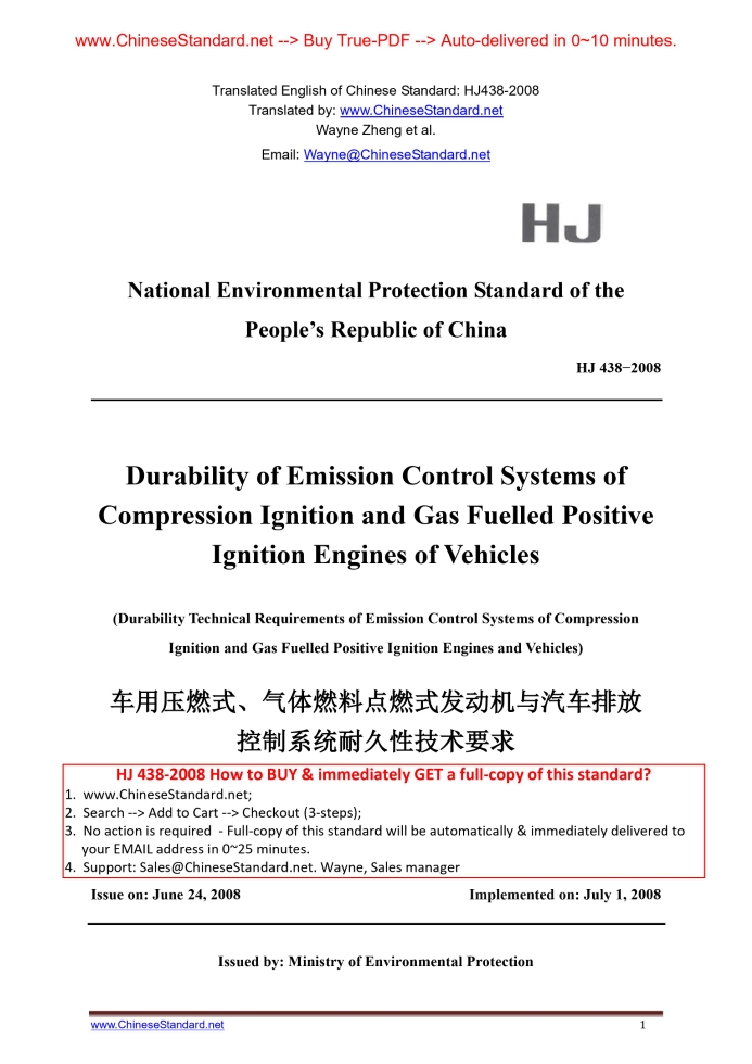 HJ 438-2008: Durability of Emission Control Systems of compression ignition and gas fuelled positive ignition engines of vehicles Delivery: 9 seconds. True-PDF full-copy in English & invoice will be downloaded + auto-delivered via email. See step-by-step procedure Status: Valid