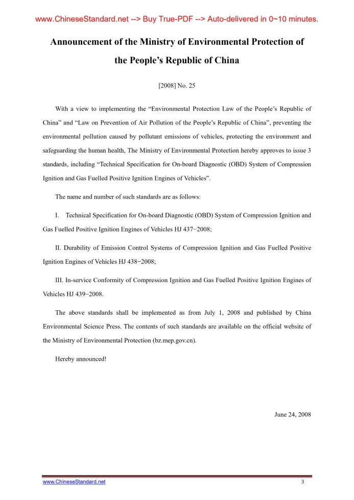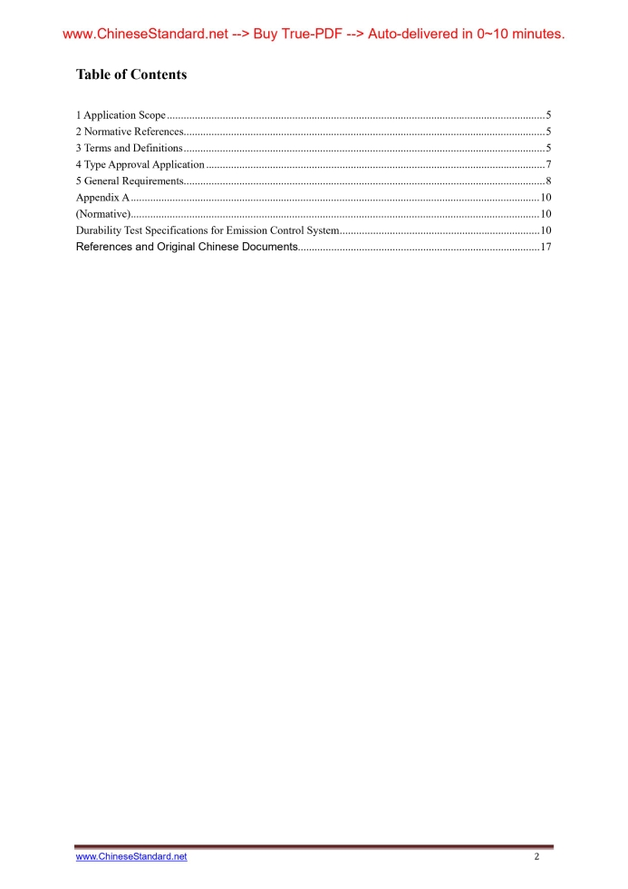 Similar standardsHJ 438-2008: Durability of Emission Control Systems of compression ignition and gas fuelled positive ignition engines of vehicles---This is an excerpt. Full copy of true-PDF in English version (including equations, symbols, images, flow-chart, tables, and figures etc.), auto-downloaded/delivered in 9 seconds, can be purchased online: https://www.ChineseStandard.net/PDF.aspx/HJ438-2008 National Environmental Protection Standard of the People’s Republic of China HJ 438−2008 Durability of Emission Control Systems of Compression Ignition and Gas Fuelled Positive Ignition Engines of Vehicles (Durability Technical Requirements of Emission Control Systems of Compression Ignition and Gas Fuelled Positive Ignition Engines and Vehicles) ISSUE ON. JUNE 24, 2008 Implemented on: JULY 1, 2008 Issued by. Ministry of Environmental Protection Table of Contents1 Application Scope ... 5 2 Normative References ... 5 3 Terms and Definitions ... 5 4 Type Approval Application ... 7 5 General Requirements ... 8 Appendix A ... 10 (Normative) ... 10 Durability Test Specifications for Emission Control System ... 10 References and Original Chinese Documents... 17 Announcement of the Ministry of Environmental Protection of the People’s Republic of China [2008] No. 25 With a view to implementing the “Environmental Protection Law of the People’s Republic of China” and “Law on Prevention of Air Pollution of the People’s Republic of China”, preventing the environmental pollution caused by pollutant emissions of vehicles, protecting the environment and safeguarding the human health, The Ministry of Environmental Protection hereby approves to issue 3 standards, including “Technical Specification for On-board Diagnostic (OBD) System of Compression Ignition and Gas Fuelled Positive Ignition Engines of Vehicles”. The name and number of such standards are as follows. I. Technical Specification for On-board Diagnostic (OBD) System of Compression Ignition and Gas Fuelled Positive Ignition Engines of Vehicles HJ 437−2008; II. Durability of Emission Control Systems of Compression Ignition and Gas Fuelled Positive Ignition Engines of Vehicles HJ 438−2008; III. In-service Conformity of Compression Ignition and Gas Fuelled Positive Ignition Engines of Vehicles HJ 439−2008. The above standards shall be implemented as from July 1, 2008 and published by China Environmental Science Press. The contents of such standards are available on the official website of the Ministry of Environmental Protection (bz.mep.gov.cn). Hereby announced! June 24, 2008 Foreword This standard was formulated with a view to implementing the “Environmental Protection Law of the People’s Republic of China” and the “Law on Prevention of Air Pollution of the People’s Republic of China”, preventing the environmental pollution caused by pollutant emissions of vehicles, and improving the environmental quality. This standard specifies the durability requirements (including measurement methods) of emission control systems of compression ignition and gas fuelled positive ignition engines of vehicles. It supplements the contents about durability of emission control system in “Limits and Measurement Methods for Exhaust Pollutants from Compression Ignition and Gas Fuelled Positive Ignition Engines of Vehicles (III, IV, V)” GB 17691. This standard is modified in relation to the requirements for the durability of heavy-duty vehicles specified in Directive 2005/55/EC of European Union (EU) “Relating to the measures to be taken against the emission of gaseous and particulate pollutants from compression-ignition engines for use in vehicles, and the emission of gaseous pollutants from positive-ignition engines fuelled with natural gas or liquefied petroleum gas for use in vehicles” as well as the requirements for the durability test procedures of emission control system specified in Directive 2005/78/EC. This standard is issued for the first time. Appendix A of this standard is normative. This national standard is formulated by the Technology and Standards of the Ministry of Environmental Protection. Drafting organizations of this standard. Jinan Vehicle Test Center, Chinese Research Academy of Environmental Science and China Automotive Technology & Research Center This standard was approved by the Ministry of Environmental Protection of the People’s Republic of China on June 24, 2008. This standard shall be implemented from July 1, 2008. Ministry of Environmental Protection is responsible for the explanation of this standard. Durability of Emission Control Systems of Compression Ignition and Gas Fuelled Positive Ignition Engines of Vehicles1 Application ScopeThis standard specifies the durability requirements (including measurement methods) for vehicle adopted with compression ignition engine and that adopted with the spark ignition engine fuelled with natural gas (NG) or liquefied petroleum gas (LPG) as well as emission control system of such engines. This standard is applicable to the type approval of the emission control system of compression ignition (including gas fuelled positive ignition) engines equipped in M2, M3, N1, N2 and N3 vehicles with design speed greater than 25km/h as well as M1 vehicles with total mass greater than 3500kg. Where N1 and M2 vehicles adopted with compression ignition (including gas fuelled positive ignition) engines meet the durability requirements of “Limits and Measurement Methods for Emissions from Light-duty Vehicles” GB 18352.3−2005, this standard may not be implemented.2 Normative ReferencesThe following normative documents contain provisions which, through reference in this text, constitute provisions of this standard. For undated references, the effective edition of the normative document applies. GB 17691 “Limits and Measurement Methods for Exhaust Pollutants from Compression Ignition and Gas Fuelled Positive Ignition Engines of Vehicles (III IV V)” GB 18352.3