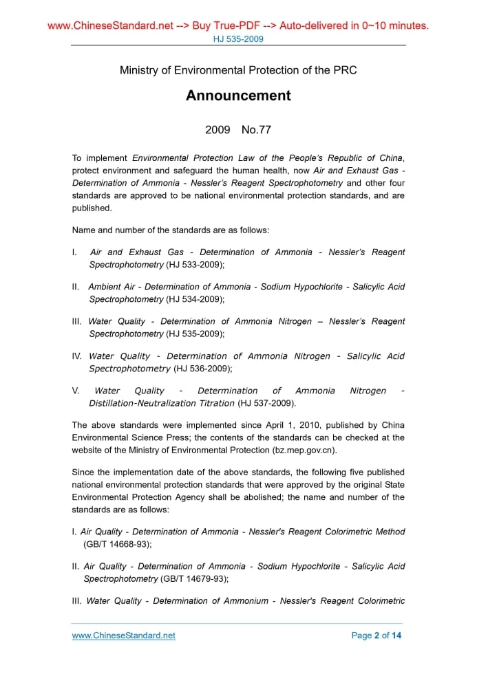 Question 1: How long will the true-PDF of English version of HJ 535-2009 be delivered?Answer: The full copy PDF of English version of HJ 535-2009 can be downloaded in 9 seconds, and it will also be emailed to you in 9 seconds (double mechanisms to ensure the delivery reliably), with PDF-invoice.