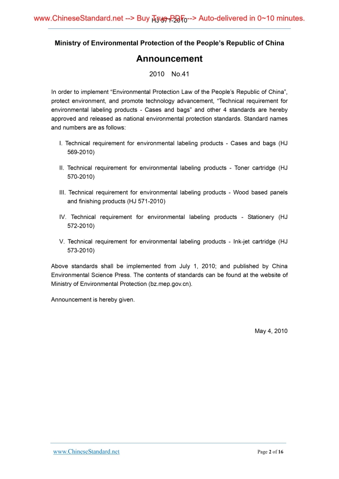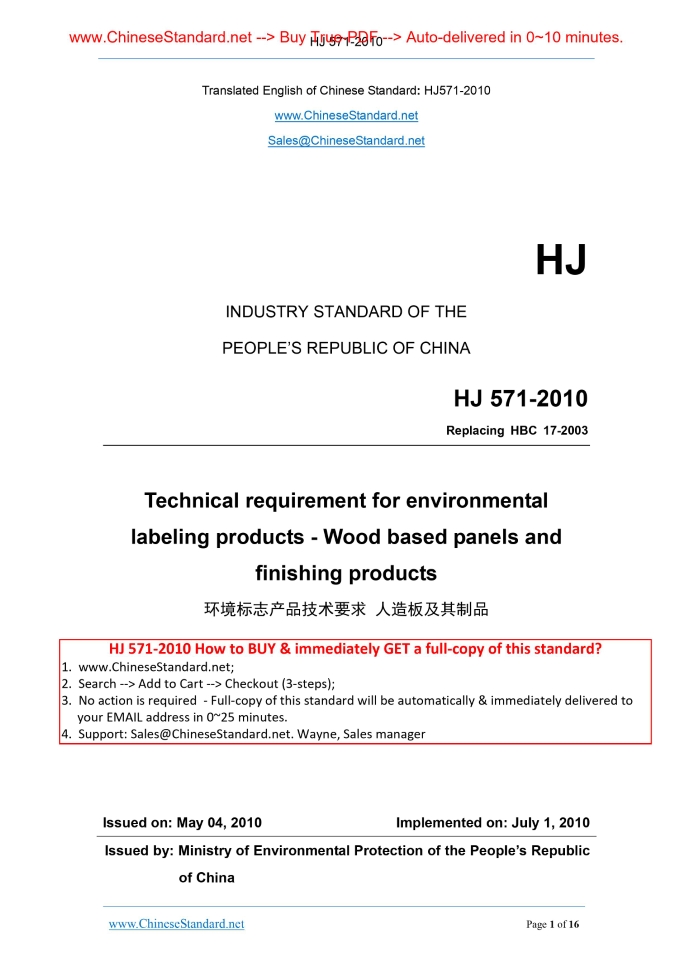 HJ 571-2010: Technical requirement for environmental labeling products - Wood based panels and finishing products Delivery: 9 seconds. True-PDF full-copy in English & invoice will be downloaded + auto-delivered via email. See step-by-step procedure Status: Valid