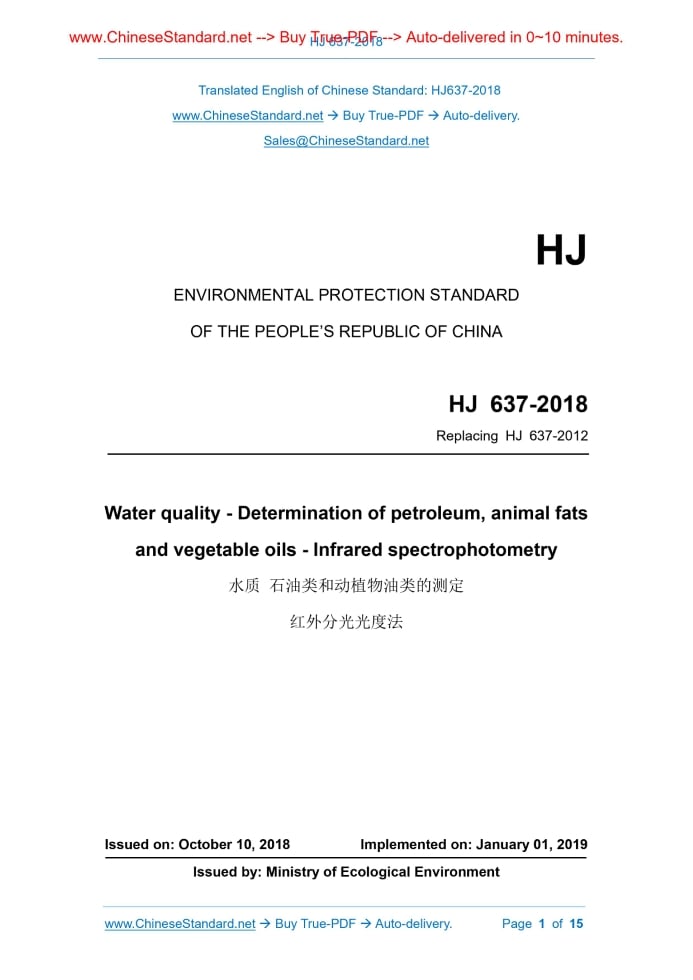 HJ 637-2018: Water quality - Determination of petroleum, animal fats and vegetable oils - Infrared spectrophotometry Delivery: 9 seconds. True-PDF full-copy in English & invoice will be downloaded + auto-delivered via email. See step-by-step procedure Status: Valid HJ 637: Historical versions