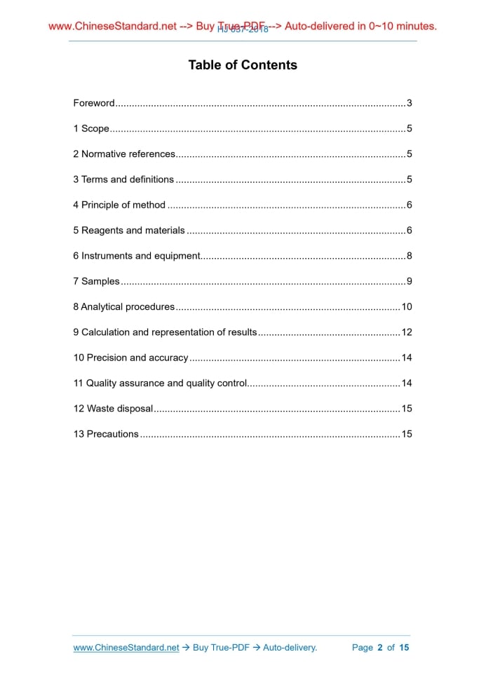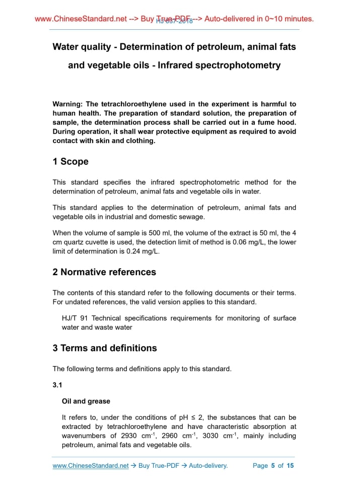 HJ 637-2018: Water quality - Determination of petroleum, animal fats and vegetable oils - Infrared spectrophotometry---This is an excerpt. Full copy of true-PDF in English version (including equations, symbols, images, flow-chart, tables, and figures etc.), auto-downloaded/delivered in 9 seconds, can be purchased online: https://www.ChineseStandard.net/PDF.aspx/HJ637-2018 HJ ENVIRONMENTAL PROTECTION STANDARD OF THE PEOPLE’S REPUBLIC OF CHINA Replacing HJ 637-2012 Water quality - Determination of petroleum, animal fats and vegetable oils - Infrared spectrophotometry Issued on: OCTOBER 10, 2018 Implemented on: JANUARY 01, 2019 Issued by. Ministry of Ecological Environment Table of ContentsForeword ... 3 1 Scope ... 5 2 Normative references ... 5 3 Terms and definitions ... 5 4 Principle of method ... 6 5 Reagents and materials ... 6 6 Instruments and equipment... 8 7 Samples ... 9 8 Analytical procedures ... 10 9 Calculation and representation of results ... 12 10 Precision and accuracy ... 14 11 Quality assurance and quality control... 14 12 Waste disposal ... 15 13 Precautions ... 15 Water quality - Determination of petroleum, animal fats and vegetable oils - Infrared spectrophotometry Warning. The tetrachloroethylene used in the experiment is harmful to human health. The preparation of standard solution, the preparation of sample, the determination process shall be carried out in a fume hood. During operation, it shall wear protective equipment as required to avoid contact with skin and clothing.1 ScopeThis standard specifies the infrared spectrophotometric method for the determination of petroleum, animal fats and vegetable oils in water. This standard applies to the determination of petroleum, animal fats and vegetable oils in industrial and domestic sewage. When the volume of sample is 500 ml, the volume of the extract is 50 ml, the 4 cm quartz cuvette is used, the detection limit of method is 0.06 mg/L, the lower limit of determination is 0.24 mg/L.2 Normative referencesThe contents of this standard refer to the following documents or their terms. For undated references, the valid version applies to this standard. HJ/T 91 Technical specifications requirements for monitoring of surface water and waste water3 Terms and definitionsThe following terms and definitions apply to this standard. 3.1 Oil and grease It refers to, under the conditions of pH ≤ 2, the substances that can be extracted by tetrachloroethylene and have characteristic absorption at wavenumbers of 2930 cm-1, 2960 cm-1, 3030 cm-1, mainly including petroleum, animal fats and vegetable oils. 5.4 n-hexadecane (C16H34). Chromatographical pure. 5.5 Isooctane (C8H18). Chromatographical pure. 5.6 Benzene (C6H6). Chromatographical pure. 5.7 Anhydrous sodium sulfate (Na2SO4). PLACE it in a muffle furnace to heat it at 550 °C for 4 h. After it is slightly cooled, CONTAIN it into a ground glass bottle. PLACE it in a desiccator for storage. 5.8 Magnesium silicate (MgSiO3). 150 μm ~ 250 μm (100 mesh ~ 60 mesh). TAKE magnesium silicate and PLACE it in a porcelain evaporating dish. PLACE it in a muffle furnace at 550 °C to heat it for 4 h. After it is slightly cooled, TRANSFER it into a desiccator to cool it to room temperature. WEIGH an appropriate amount of magnesium silicate in a ground glass bottle. According to the mass of magnesium silicate, ADD an appropriate amount of distilled water in a ratio of 6% (m/m). CAP it tightly and SHAKE it thoroughly. LET it be standing for 12 h before use. PRESERVE it in a glass bottle. 5.9 Glass wool Before use, USE the tetrachloroethylene (5.3) to soak and rinse the glass wool. DRY it naturally to prepare for use. 5.10 Standard stock solution of n-hexadecane. ρ≈10000 mg/L. WEIGH 1.0 g (accurate to 0.1 mg) of n-hexadecane (5.4) in a 100 ml volumetric flask. USE tetrachloroethylene (5.3) to make its volume reach to the mark. SHAKE it uniformly. STORE it at 0 °C ~ 4 °C, which can be preserved in the dark for 1 year. 5.11 Standard use solution of n-hexadecane. ρ = 1000 mg/L. USE tetrachloroethylene (5.3) to dilute the standard stock solution of n- hexadecane (5.10) to the volume in a 100 ml volumetric flask. 5.12 Standard stock solution of isooctane. ρ≈10000 mg/L. WEIGH 1.0 g (accurate to 0.1 mg) of isooctane (5.5) in a 100 ml volumetric flask. USE tetrachloroethylene (5.3) to make its volume reach to the mark. SHAKE it uniformly. STORE it at 0 °C ~ 4 °C, which can be preserved in the dark for 1 year. 5.13 Standard use solution of isooctane. ρ = 1000 mg/L. USE tetrachloroethylene (5.3) to dilute the standard stock solution of isooctane (5.12) to the volume in a 100 ml volumetric flask. 6.6 Colorimetric tube. 25 ml, 50 ml, ground, with a stopper. 6.7 Separating funnel. 1000 ml with Teflon cock. 6.8 Measuring cylinder. 1000 ml. 6.9 Commonly used laboratory utensils and equipment.7 Samples7.1 Collection of sample With reference to the relevant provisions of HJ/T 91, USE the sampling bottle (6.3) to collect about 500 ml of water sample. ADD hydrochloric acid solution (5.2) to acid it to pH ≤ 2. 7.2 Preservation of samples If the sample cannot be determined within 24 h, it shall be stored at 0 °C ~ 4 °C and determined within 3 days. 7.3 Preparation of samples 7.3.1 Preparation of oil and grease samples TRANSFER the sample into a 1000 ml separatory funnel (6.7). MEASURE 50 ml of tetrachloroethylene (5.3) to rinse the sample bottle. TRANSFER all the rinsing solution into the separatory funnel (6.7). SHAKE it completely for 2 min. Frequently OPEN the cock for exhaust. LET it be standing for stratification. USE tweezers to take glass wool (5.9) and place it in a glass funnel (6.4). TAKE an appropriate amount of anhydrous sodium sulfate (5.7) to pave above the glass wool. OPEN the cock of the separatory funnel. MAKE the lower layer of organic phase extract pass the glass funnel (6.4) which contains anhydrous sodium sulfate (5.7) into a 50 ml colorimetric tube (6.6). USE an appropriate 