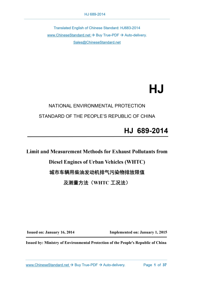 HJ 689-2014: Limits and measurement methods for exhaust pollutants from diesel engines of urban vehicles (WHTC) Delivery: 9 seconds. True-PDF full-copy in English & invoice will be downloaded + auto-delivered via email. See step-by-step procedure Status: Valid