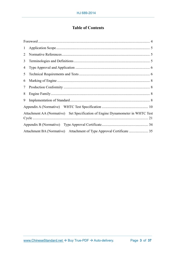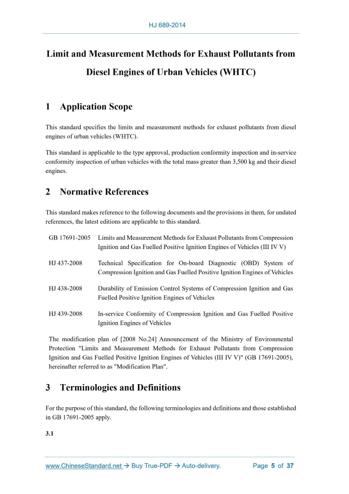 HJ 689-2014: Limits and measurement methods for exhaust pollutants from diesel engines of urban vehicles (WHTC)---This is an excerpt. Full copy of true-PDF in English version (including equations, symbols, images, flow-chart, tables, and figures etc.), auto-downloaded/delivered in 9 seconds, can be purchased online: https://www.ChineseStandard.net/PDF.aspx/HJ689-2014 NATIONAL ENVIRONMENTAL PROTECTION STANDARD OF THE PEOPLE’S REPUBLIC OF CHINA Limit and Measurement Methods for Exhaust Pollutants from Diesel Engines of Urban Vehicles (WHTC) ISSUED ON: JANUARY 16, 2014 IMPLEMENTED ON: JANUARY 1, 2015 Issued by: Ministry of Environmental Protection of the People's Republic of China Table of ContentsForeword ... 4 1 Application Scope ... 5 2 Normative References ... 5 3 Terminologies and Definitions ... 5 4 Type Approval and Application ... 6 5 Technical Requirements and Tests ... 6 6 Marking of Engine ... 8 7 Production Conformity ... 8 8 Engine Family ... 8 9 Implementation of Standard ... 8 Appendix A (Normative) WHTC Test Specification ... 10 Attachment AA (Normative) Set Specification of Engine Dynamometer in WHTC Test Cycle ... 21 Appendix B (Normative) Type Approval Certificate ... 34 Attachment BA (Normative) Attachment of Type Approval Certificate ... 35 Limit and Measurement Methods for Exhaust Pollutants from Diesel Engines of Urban Vehicles (WHTC)1 Application ScopeThis standard specifies the limits and measurement methods for exhaust pollutants from diesel engines of urban vehicles (WHTC). This standard is applicable to the type approval, production conformity inspection and in-service conformity inspection of urban vehicles with the total mass greater than 3,500 kg and their diesel engines.2 Normative ReferencesThis standard makes reference to the following documents and the provisions in them, for undated references, the latest editions are applicable to this standard. GB 17691-2005 Limits and Measurement Methods for Exhaust Pollutants from Compression Ignition and Gas Fuelled Positive Ignition Engines of Vehicles (III IV V) HJ 437-2008 Technical Specification for On-board Diagnostic (OBD) System of Compression Ignition and Gas Fuelled Positive Ignition Engines of Vehicles HJ 438-2008 Durability of Emission Control Systems of Compression Ignition and Gas Fuelled Positive Ignition Engines of Vehicles HJ 439-2008 In-service Conformity of Compression Ignition and Gas Fuelled Positive Ignition Engines of Vehicles The modification plan of [2008 No.24] Announcement of the Ministry of Environmental Protection "Limits and Measurement Methods for Exhaust Pollutants from Compression Ignition and Gas Fuelled Positive Ignition Engines of Vehicles (III IV V)" (GB 17691-2005), hereinafter referred to as "Modification Plan".3 Terminologies and DefinitionsFor the purpose of this standard, the following terminologies and definitions and those established in GB 17691-2005 apply. 3.1 WHTC test (World Harmonized Transient Cycle test) It refers to the transient cycle including 1,800 working conditions transforming second by second in the Appendix A of this standard. 3.2 Urban vehicles It refers to the buses, mail cars and sanitation trucks operating in the city.4 Type Approval and Application4.1 Type approval application For the new type vehicles or engines within the application scope of this standard, the vehicle or engine (or family) manufacturing enterprise or its authorized agency shall propose the type approval application to the type approval competent departments according to the requirements of GB 17691-2005 and this standard, and shall complete the specified inspection items. 4.2 Type approval If the vehicles or engines (family) within the application scope of this standard meet the requirements of GB 17691-2005 and its "Modification Plan" as well as those specified in this standard, the type approval shall be conducted and the type approval certificate in accordance with Appendix B shall be issued.5 Technical Requirements and Tests5.1 Exhaust requirements of gaseous pollutants and particulate matters For the engine or vehicle which is conducted with type approval according to this standard, the WHTC cold starting and hot starting emission tests shall be conducted according to the test procedures specified in Appendix A to determine the exhaust of gaseous pollutants and particulate matters. 5.1.1 The results of exhaust pollutants measured by cold starting and hot starting tests shall be weighted according to the following formula.6 Marking of EngineFor the engine approved according to this standard, its mark shall meet the requirements of Chapter 6 in GB 17691-2005, and the text "meeting the requirements of HJ 689-2014" also shall be indicated on the nameplate.7 Production Conformity7.1 The manufacturing enterprise shall take measures to ensure the production conformity. 7.2 Production conformity inspection and judgment shall be conducted according to the requirements of GB 17691-2005. Not only the corresponding technical requirements of GB 17691-2005, but also the WHTC exhaust pollutants shall be inspected, the calibration shall be conducted according to deterioration coefficient or correction value to meet the limit requirements specified in this standard.8 Engine FamilyThe engines in same family shall not only meet the requirements of Chapter 9 in GB 17691-2005, but also shall meet the requirements of this standard in the aspect having same emission control strategies, measures and technical parameters [e.g., optimal control strategy and urea injection strategy (Mapping adjustment), improving the catalyst activity, exhaust heat management, etc.], and related materials shall be provided to the type approval organization to prove that it can reach the same control effect.9 Implementation of Standard9.1 Type approval The type approval of engines or vehicles within the application scope of this standard shall be implemented from the issuance date of this standard. 9.2 Registration, sales