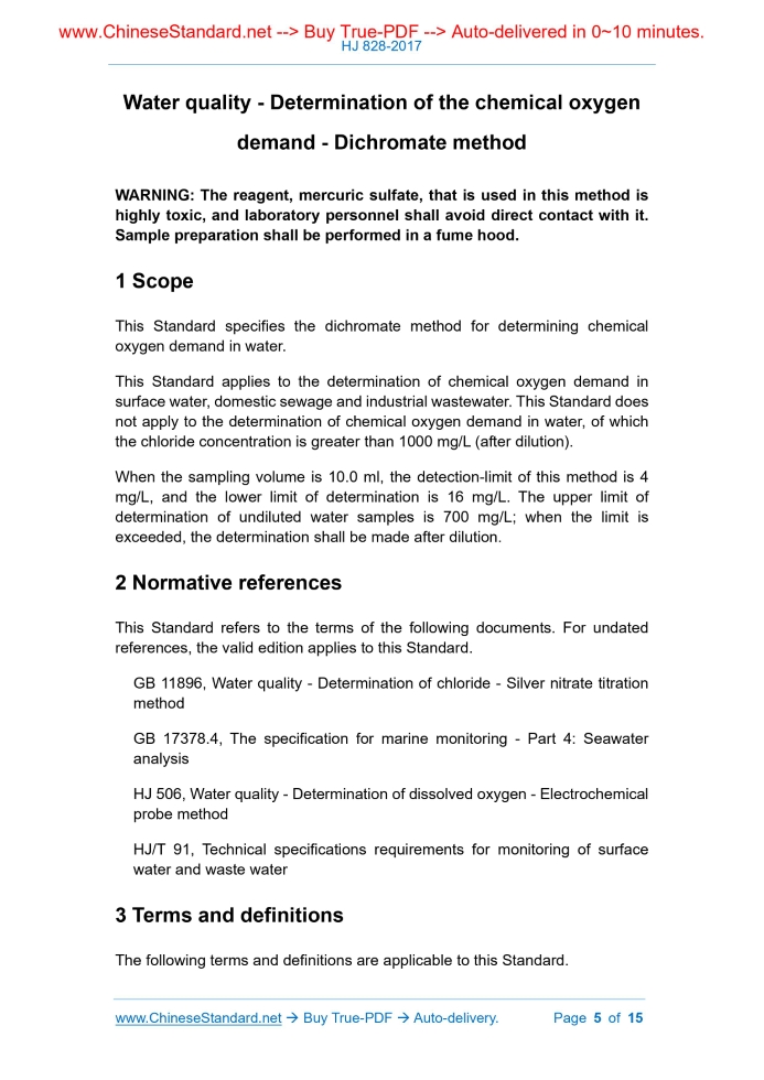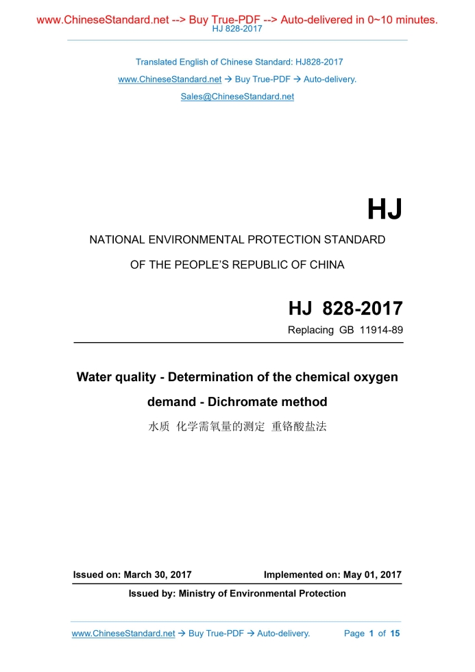 HJ 828-2017: Water quality - Determination of the chemical oxygen demand - Dichromate method Delivery: 9 seconds. True-PDF full-copy in English & invoice will be downloaded + auto-delivered via email. See step-by-step procedure Status: Valid