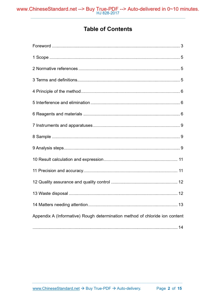 HJ 828-2017: Water quality - Determination of the chemical oxygen demand - Dichromate method---This is an excerpt. Full copy of true-PDF in English version (including equations, symbols, images, flow-chart, tables, and figures etc.), auto-downloaded/delivered in 9 seconds, can be purchased online: https://www.ChineseStandard.net/PDF.aspx/HJ828-2017NATIONAL ENVIRONMENTAL PROTECTION STANDARD OF THE PEOPLE’S REPUBLIC OF CHINA Replacing GB 11914-89 Water quality - Determination of the chemical oxygen demand - Dichromate method ISSUED ON: MARCH 30, 2017 IMPLEMENTED ON: MAY 01, 2017 Issued by: Ministry of Environmental Protection Table of ContentsForeword ... 3 1 Scope ... 5 2 Normative references ... 5 3 Terms and definitions ... 5 4 Principle of the method ... 6 5 Interference and elimination ... 6 6 Reagents and materials ... 6 7 Instruments and apparatuses ... 9 8 Sample ... 9 9 Analysis steps ... 9 10 Result calculation and expression ... 11 11 Precision and accuracy ... 11 12 Quality assurance and quality control ... 12 13 Waste disposal ... 12 14 Matters needing attention ... 13 Appendix A (Informative) Rough determination method of chloride ion content ... 14 Water quality - Determination of the chemical oxygen demand - Dichromate method WARNING: The reagent, mercuric sulfate, that is used in this method is highly toxic, and laboratory personnel shall avoid direct contact with it. Sample preparation shall be performed in a fume hood.1 ScopeThis Standard specifies the dichromate method for determining chemical oxygen demand in water. This Standard applies to the determination of chemical oxygen demand in surface water, domestic sewage and industrial wastewater. This Standard does not apply to the determination of chemical oxygen demand in water, of which the chloride concentration is greater than 1000 mg/L (after dilution). When the sampling volume is 10.0 ml, the detection-limit of this method is 4 mg/L, and the lower limit of determination is 16 mg/L. The upper limit of determination of undiluted water samples is 700 mg/L; when the limit is exceeded, the determination shall be made after dilution.2 Normative referencesThis Standard refers to the terms of the following documents. For undated references, the valid edition applies to this Standard. GB 11896, Water quality - Determination of chloride - Silver nitrate titration method GB 17378.4, The specification for marine monitoring - Part 4: Seawater analysis HJ 506, Water quality - Determination of dissolved oxygen - Electrochemical probe method HJ/T 91, Technical specifications requirements for monitoring of surface water and waste water3 Terms and definitionsThe following terms and definitions are applicable to this Standard. 6.1 Sulfuric acid (H2SO4), ρ = 1.84 g/ml, guaranteed reagent. 6.2 Potassium dichromate (K2Cr2O7): primary reagent; take an appropriate amount of potassium dichromate and dry in a 105°C oven to constant weight. 6.3 Silver sulfate (Ag2SO4). 6.4 Mercury sulfate (HgSO4). 6.5 Ammonium ferrous sulfate ([(NH4)2Fe(SO4)2·6H2O]). 6.6 Potassium hydrogen phthalate (KC8H5O4). 6.7 Ferrous sulfate heptahydrate (FeSO4·7H2O). 6.8 Sulfuric acid solution: 1+9 (V/V). 6.9 Potassium dichromate standard solution 6.9.1 Potassium dichromate standard solution c ( K2CR2O7) = 0.250 mol/L. Accurately weigh 12.258 g of potassium dichromate (6.2); dissolve it in water; fix-volume to 1000 ml. 6.9.2 Potassium dichromate standard solution c ( K2CR2O7) = 0.0250 mol/L. Dilute the potassium dichromate standard solution (6.9.1) 10 times. 6.10 Silver sulfate-sulfuric acid solution. Weigh 10 g of silver sulfate (6.3); add it to 1 L of sulfuric acid (6.1); leave it for 1 ~ 2 day(s) to dissolve it; shake it well; shake carefully before use. 6.11 Mercury sulfate solution, ρ = 100 g/L. Weigh 10 g of mercury sulfate (6.4); dissolve in 100 ml of sulfuric acid solution (6.8); mix it well. 6.12 Ammonium ferrous sulfate standard solution 6.12.1 Ammonium ferrous sulfate standard solution, c[(NH4)2Fe(SO4)2·6H2O] ≈ 0.05 mol/L. Weigh 19.5 g of ammonium ferrous sulfate (6.5) to dissolve in water; add 10 ml of sulfuric acid (6.1); dilute to 1000 ml after the solution is cooled.7 Instruments and apparatuses7.1 Reflux device: All-glass reflux device for 250 ml conical flask with grinding mouth. Water-cooled or air-cooled all-glass reflux device can be selected. Other equivalent condensation reflux devices are also applicable. 7.2 Heating device: electric furnace or other equivalent digestion device. 7.3 Analytical balance: sensitivity of 0.0001 g. 7.4 Acid burette: 25 ml or 50 ml. 7.5 Instruments and apparatuses that are commonly used in general laboratories.8 SampleCollect and store water samples in accordance with the relevant regulations of HJ/T 91. The volume of the collected water sample shall not be less than 100 ml. The collected water samples shall be placed in glass bottles and analyzed as soon as possible. If it cannot be analyzed immediately, sulfuric acid (6.1) shall be added until pH < 2; store it at 4°C for less than 5 days.9 Analysis steps9.1 Samples of CODCr concentration ≤ 50 mg/L 9.1.1 Sample determination Take 10.0 ml of water sample into the conical flask; add 5.00 ml of mercury sulfate solution (6.11), potassium dichromate standard solution (6.9.2) and several explosive boiling-proof glass beads (6.15) in order; shake well. Add mercury sulfate solution (6.11) at a mass ratio of m[HgSO4]:m[Cl-] ≥20: 1; the maximum addition is 2 ml. Connect the conical flask to the lower end of the condenser of the reflux device (7.1); slowly add 15 ml of silver sulfate-sulfuric acid solution (6.10) from the upper end of the condenser to prevent the escape of low-boiling organics; rotate the conical flask to mix evenly. Since the solution begins to boil, maintain a slight boiling reflux for 2 h. In the case of a water-cooled device, condensate shall be introduced before adding the silver sulfate-sulfuric acid solution (6.10). mg/L, 7 mg/L, 9 mg/L, an