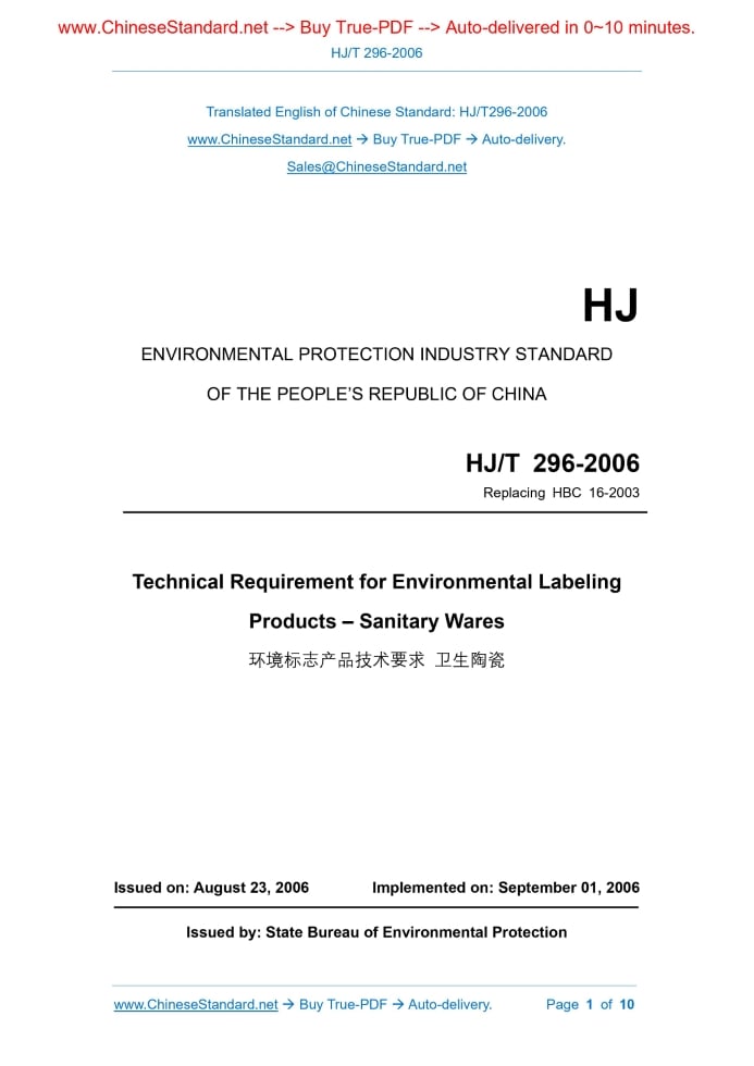HJ/T 296-2006: Technical requirement for environmental labeling products. Sanitary wares Delivery: 9 seconds. True-PDF full-copy in English & invoice will be downloaded + auto-delivered via email. See step-by-step procedure Status: Obsolete HJ/T 296: Historical versions