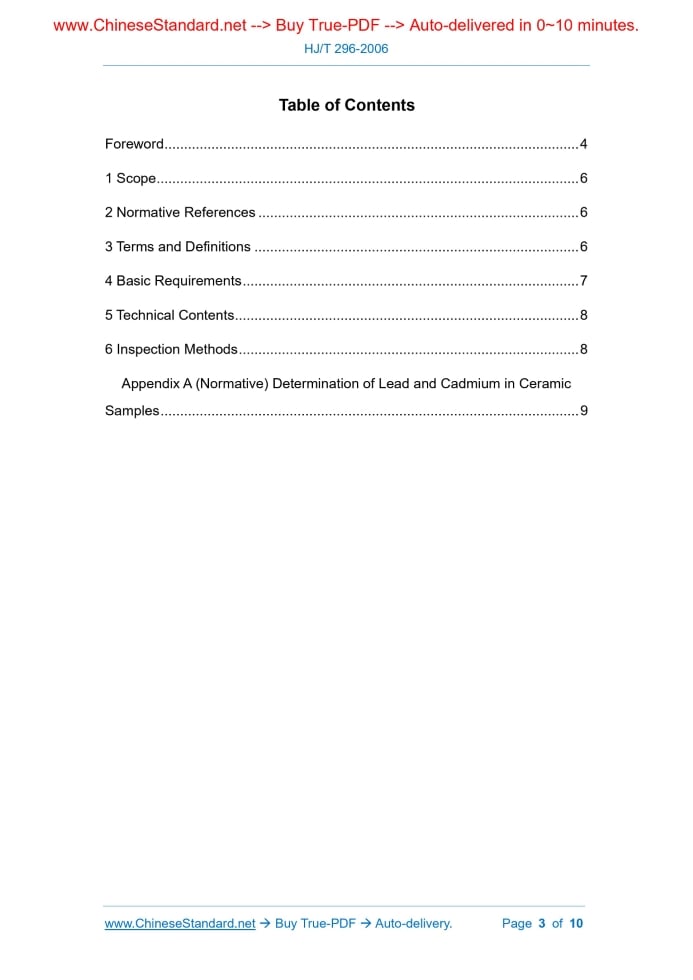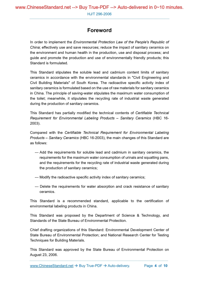 HJ/T 296-2006: Technical requirement for environmental labeling products. Sanitary wares---This is an excerpt. Full copy of true-PDF in English version (including equations, symbols, images, flow-chart, tables, and figures etc.), auto-downloaded/delivered in 9 seconds, can be purchased online: https://www.ChineseStandard.net/PDF.aspx/HJT296-2006HJ ENVIRONMENTAL PROTECTION INDUSTRY STANDARD Replacing HBC 16-2003 Technical Requirement for Environmental Labeling Products – Sanitary Wares Issued on: AUGUST 23, 2006 Implemented on: SEPTEMBER 01, 2006 Issued by. State Bureau of Environmental Protection Table of ContentsForeword... 4 1 Scope... 6 2 Normative References... 6 3 Terms and Definitions... 6 4 Basic Requirements... 7 5 Technical Contents... 8 6 Inspection Methods... 8 Appendix A (Normative) Determination of Lead and Cadmium in Ceramic Samples... 9ForewordIn order to implement the Environmental Protection Law of the People's Republic of China; effectively use and save resources; reduce the impact of sanitary ceramics on the environment and human health in the production, use and disposal process; and guide and promote the production and use of environmentally friendly products; this Standard is formulated. This Standard stipulates the soluble lead and cadmium content limits of sanitary ceramics in accordance with the environmental standards in "Civil Engineering and Civil Building Materials" of South Korea. The radioactive specific activity index of sanitary ceramics is formulated based on the use of raw materials for sanitary ceramics in China. The principle of saving-water stipulates the maximum water consumption of the toilet; meanwhile, it stipulates the recycling rate of industrial waste generated during the production of sanitary ceramics. This Standard has partially modified the technical contents of Certifiable Technical Requirement for Environmental Labeling Products – Sanitary Ceramics (HBC 16- 2003). Compared with the Certifiable Technical Requirement for Environmental Labeling Products – Sanitary Ceramics (HBC 16-2003), the main changes of this Standard are as follows. --- Add the requirements for soluble lead and cadmium in sanitary ceramics, the requirements for the maximum water consumption of urinals and squatting pans, and the requirements for the recycling rate of industrial waste generated during the production of sanitary ceramics; --- Modify the radioactive specific activity index of sanitary ceramics; --- Delete the requirements for water absorption and crack resistance of sanitary ceramics. This Standard is a recommended standard, applicable to the certification of environmental labeling products in China. This Standard was proposed by the Department of Science & Technology, and Standards of the State Bureau of Environmental Protection. Chief drafting organizations of this Standard. Environmental Development Center of State Bureau of Environmental Protection; and National Research Center for Testing Techniques for Building Materials. This Standard was approved by the State Bureau of Environmental Protection on August 23, 2006. Technical Requirement for Environmental Labeling Products – Sanitary Wares1 ScopeThis Standard specifies the definition, basic requirements, technical content and inspection methods for the sanitary ceramics of environmental labeling products. This Standard is applicable to sanitary ceramic products such as washbasins, toilets, urinals, bidets, washing tanks, squatting pans, bathtubs, etc.2 Normative ReferencesThe provisions in following documents become the provisions of this Standard through reference in this Standard. For dated references, the subsequent amendments (excluding corrigendum) or revisions do not apply to this Standard, however, parties who reach an agreement based on this Standard are encouraged to study if the latest versions of these documents are applicable. For undated references, the latest edition of the referenced document applies. GB 6566 Limits of Radionuclides in Building Materials GB 6952 Sanitary Wares GB/T 15555.2-1995 Solid Waste - Determination of Copper, Zinc, Lead, Cadmium - Atomic Absorption Spectrometry3 Terms and Definitions3.1 Internal exposure index The radioactive specific activity of the natural radionuclide radium-226 in sanitary ceramics is divided by the limit specified in this Standard. Expression formula. Where. IRa – internal exposure index;Appendix A(Normative) Determination of Lead and Cadmium in Ceramic Samples A.1 Principle The powder samples of ceramics were treated by strong acid; and the heavy metals of lead and cadmium in the solution were determined by flame atomic absorption spectrometry. A.2 Reagents --- Nitric acid (HNO3, ρ = 1.42 g/ml), guaranteed reagent; --- Preparation of nitric acid solution (1 + 1); --- Deionized water or distilled water. A.3 Apparatus --- Atomic absorption spectrophotometer; --- Filtering device. glass sand core filter, fiber filter membrane (pore size φ45μm); --- Adjustable electric heating plate. A.4 Sample preparation The sample is cleaned, dried, smashed, shrunk, ground to pass through an 80μm (180 mesh) sieve, and stored in a clean weighing bottle for later use. The preparation process shall avoid introducing impurities. A.5 Preparation of test solution Take 10 g of the sample (accurate to 0.0001 g) into a 100 ml beaker; add 25 ml of nitric acid solution; rinse the wall of the beaker with a small amount of distilled water; stir evenly; and cover with a watch glass. Place it on a 200°C low-temperature heating plate to heat for 2h; cool to stand for 1h; immediately filter into a 50 ml volumetric flask, rinse to the mark/ and shake well. This is the test solution of the sample to be tested. A.6 Blank test solution Use deionized water or distilled water to replace the sample; use the same procedures and reagents as the sample; and prepare a blank test solution while processing the ......Source: Above contents are excerpted from the full-copy P