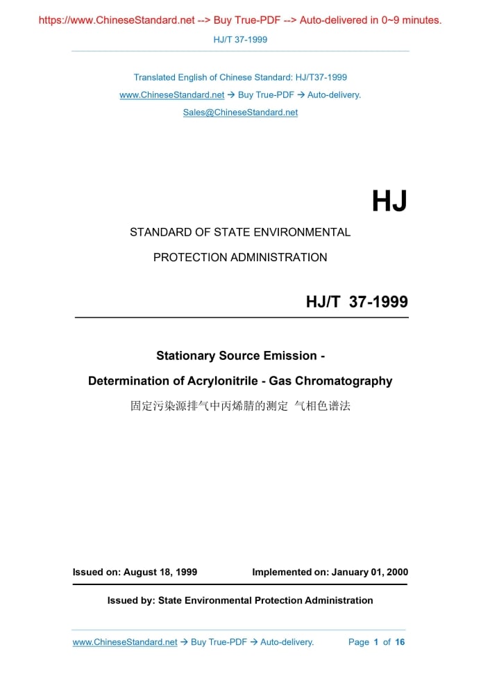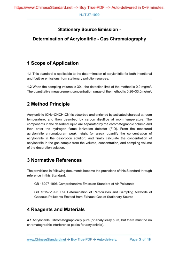 HJ/T 37-1999: Stationary source emission. Determination of acrylonitrile. Gas chromatography Delivery: 9 seconds. True-PDF full-copy in English & invoice will be downloaded + auto-delivered via email. See step-by-step procedure