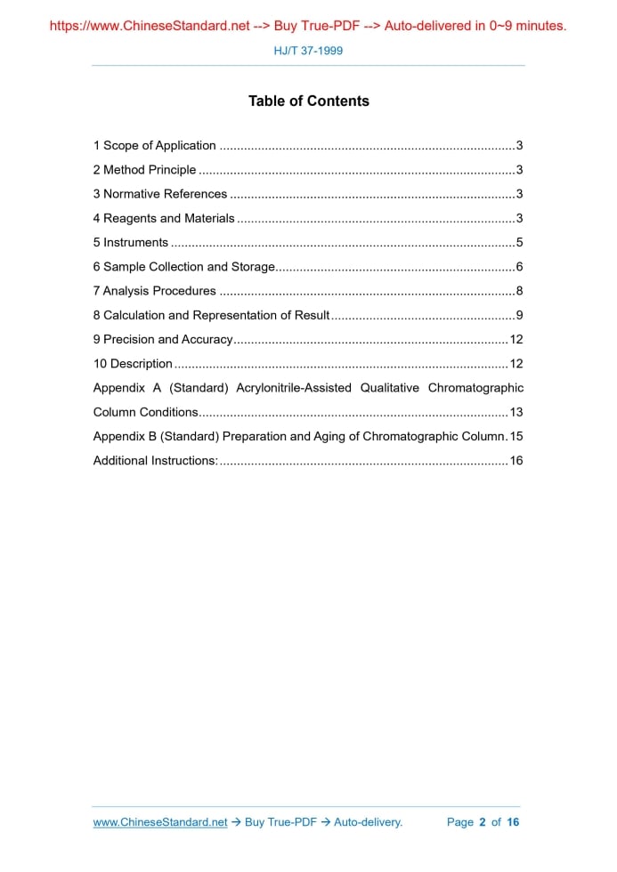 HJ/T 37-1999: Stationary source emission. Determination of acrylonitrile. Gas chromatography---This is an excerpt. Full copy of true-PDF in English version (including equations, symbols, images, flow-chart, tables, and figures etc.), auto-downloaded/delivered in 9 seconds, can be purchased online: https://www.ChineseStandard.net/PDF.aspx/HJT37-1999HJ STANDARD OF STATE ENVIRONMENTAL PROTECTION ADMINISTRATION Stationary Source Emission - Determination of Acrylonitrile - Gas Chromatography Issued on: AUGUST 18, 1999 Implemented on: JANUARY 01, 2000 Issued by. State Environmental Protection Administration Table of Contents1 Scope of Application... 3 2 Method Principle... 3 3 Normative References... 3 4 Reagents and Materials... 3 5 Instruments... 5 6 Sample Collection and Storage... 6 7 Analysis Procedures... 8 8 Calculation and Representation of Result... 9 9 Precision and Accuracy... 12 10 Description... 12 Appendix A (Standard) Acrylonitrile-Assisted Qualitative Chromatographic Column Conditions... 13 Appendix B (Standard) Preparation and Aging of Chromatographic Column. 15 Additional Instructions... 16 Stationary Source Emission - Determination of Acrylonitrile - Gas Chromatography1 Scope of Application1.1 This standard is applicable to the determination of acrylonitrile for both intentional and fugitive emissions from stationary pollution sources. 1.2 When the sampling volume is 30L, the detection limit of the method is 0.2 mg/m3. The quantitative measurement concentration range of the method is 0.26~33.0mg/m3.2 Method PrincipleAcrylonitrile (CH2=CHCH2CN) is adsorbed and enriched by activated charcoal at room temperature; and then desorbed by carbon disulfide at room temperature. The components in the desorbed liquid are separated by the chromatographic column and then enter the hydrogen flame ionization detector (FID). From the measured acrylonitrile chromatogram peak height (or area), quantify the concentration of acrylonitrile in the desorption solution; and finally calculate the concentration of acrylonitrile in the gas sample from the volume, concentration, and sampling volume of the desorption solution.3 Normative ReferencesThe provisions in following documents become the provisions of this Standard through reference in this Standard. GB 16297-1996 Comprehensive Emission Standard of Air Pollutants GB 16157-1996 The Determination of Particulates and Sampling Methods of Gaseous Pollutants Emitted from Exhaust Gas of Stationary Source4 Reagents and Materials4.1 Acrylonitrile. Chromatographically pure (or analytically pure, but there must be no chromatographic interference peaks for acrylonitrile). and dilute to the mark with carbon disulfide.5 Instruments5.1 Gas chromatograph. Equipped with hydrogen flame ionization detector 5.2 Chromatographic column 5.2.1 Column material. Glass or PTFE. 5.2.2 Column length. 3m. 5.2.3 Column inner diameter. 3mm. 5.2.4 Column type. packed column. 5.2.5 In-column packing. GDX-502, 60~80mesh. 5.2.6 Preparation and aging of chromatographic column (see Appendix B). 5.3 Micro syringe. 1.0µL 5.4 Sampling instrument Refer to 9.3 in GB 16157-1996 to configure the sampling instrument. 5.4.1 Sampling instrument for intentional emission monitoring 5.4.1.1 Sampling tube It is made of stainless steel, hard glass or PTFE, with appropriate dimensions, and is equipped with an insulation jacket that can be heated to above 120°C. 5.4.1.2 Sample collecting device Activated charcoal adsorption tube (4.7). 5.4.1.3 Flowrate measuring device See 9.3.6 of GB 16157-1996. 5.4.1.4 Suction pump See 9.3.7 of GB 16157-1996. 5.4.1.5 Connecting pipe PTFE hose or silicone rubber tube lined with PTFE film. 1-flue; 2-heating sampler; 3-bypass adsorption tube; 4-thermometer; 5-pressure gauge; 6-adsorption tube; 7-three-way valve; 8-dryer; 9-flow meter; 10- suction pump. Figure 2 – Flue Gas Sampling System 6.1.3 Sample collection Plug an appropriate amount of glass wool into the port of the sampling tube; then extend it to the sampling point in the exhaust cylinder; start the suction pump; and first make the gas in the exhaust cylinder circulate flow through the bypass adsorption tube to fully wash the sampling pipeline. Then let the exhaust gas pass through the adsorption tube; and record the sampling time, temperature, and flow rate. After sampling, the adsorption tube shall be removed immediately; and its two ends shall be tightly covered by plastic caps; and then take back to the laboratory for analysis. 6.1.4 Heating temperature control of sampling tube The heating temperature of the sampling tube shall be based on the principle that water vapor and the sample do not condense on the wall of the sampling tube; but the maximum heating temperature shall not exceed 160°C. If the exhaust gas temperature is close to room temperature, the sampling tube is exempted from being heated. 6.1.5 Sampling flowrate The sampling flowrate shall generally be controlled between 0.3L/min and 1.0L/min. When the temperature is higher than 30°C, the sampling flow rate shall be reduced to no greater than 0.5L/min; so that ensure that the adsorption capacity of the activated charcoal in the Section-B is less than 2% of the total adsorption capacity. 6.1.6 Sampling amount For each activated charcoal adsorption tube, the sampling amount shall be controlled to the concentration of acrylonitrile in the carbon disulfide desorption solution at 10~400µg/mL. The maximum sampling amount of each activated charcoal adsorption tube shall generally not exceed 1.6mg; and the acrylonitrile adsorbed by the activated charcoal in Section-B shall not exceed 2% of the total adsorbed amount of acrylonitrile. 6.2 Sample collection of fugitive emissions 6.2.1 Sampling location and sampling point Determine the location of the fugitive emission monitoring point according to the provisions of Appendix C in GB 16297-1996; or determine the location of the sampling point according to other specific requirements. 6.2.2 Connection
