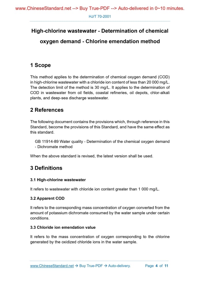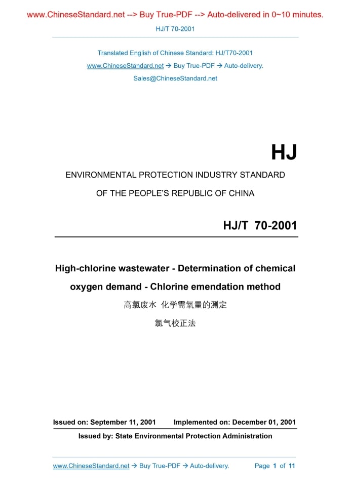 HJ/T 70-2001: High-chlorine wastewater - Determination of chemical oxygen demand - Chlorine emendation method Delivery: 9 seconds. True-PDF full-copy in English & invoice will be downloaded + auto-delivered via email. See step-by-step procedure Status: Valid