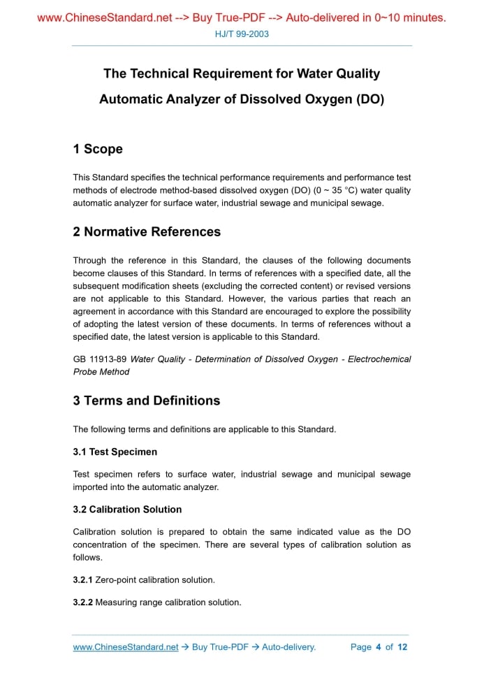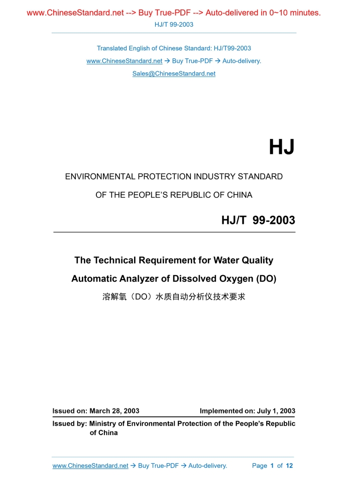 HJ/T 99-2003: The Technical Requirement for Water Quality Automatic Analyzer of Dissolved Oxygen (DO) Delivery: 9 seconds. True-PDF full-copy in English & invoice will be downloaded + auto-delivered via email. See step-by-step procedure Status: Valid