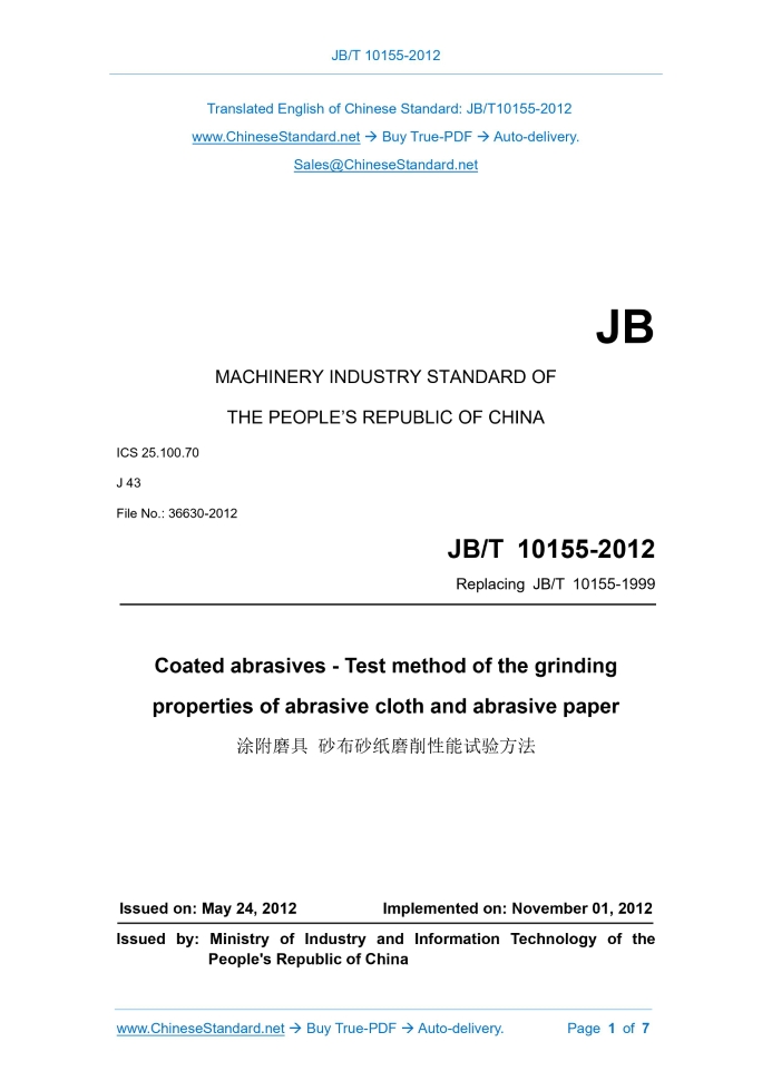 JB/T 10155-2012: Coated abrasives. Test method of the grinding properties of abrasive cloth and abrasive paper Delivery: 9 seconds. True-PDF full-copy in English & invoice will be downloaded + auto-delivered via email. See step-by-step procedure Status: Valid JB/T 10155: Historical versions