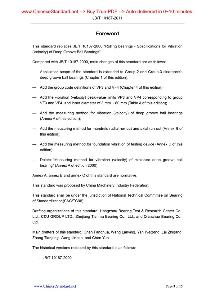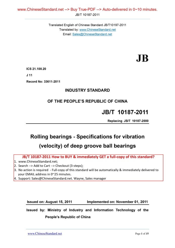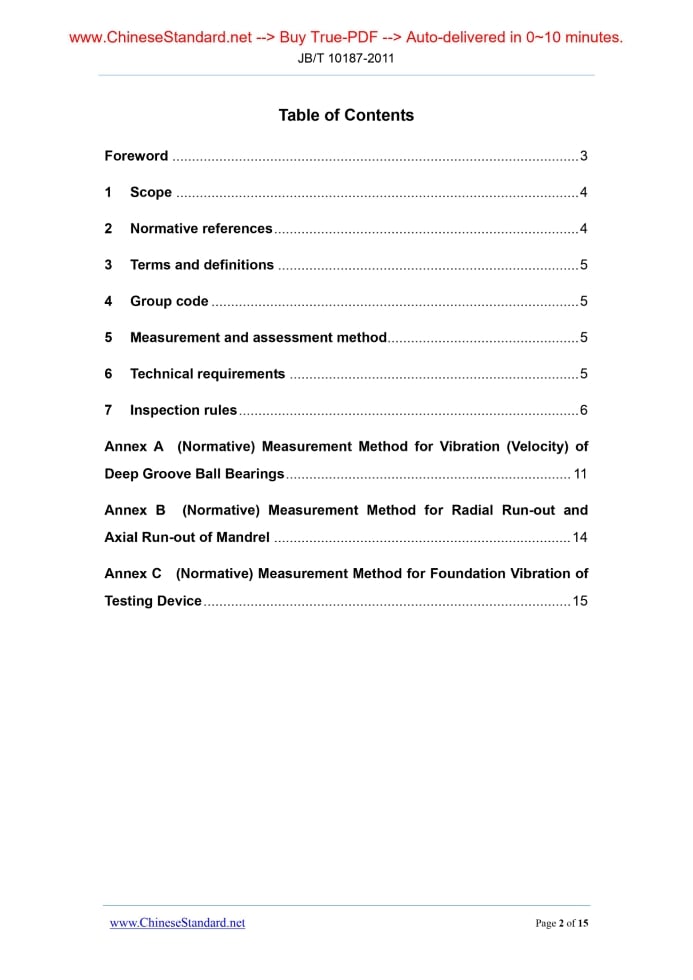 Similar standardsJB/T 10187-2011: Rolling bearings - Specifications for vibration (velocity) of deep groove ball bearings---This is an excerpt. Full copy of true-PDF in English version (including equations, symbols, images, flow-chart, tables, and figures etc.), auto-downloaded/delivered in 9 seconds, can be purchased online: https://www.ChineseStandard.net/PDF.aspx/JBT10187-2011 JB/T10197-2011 JB ICS 21.100.20 J 11 Record No. 33611-2011 INDUSTRY STANDARD Replacing JB/T 10187-2000 Rolling bearings - Specifications for vibration (velocity) of deep groove ball bearings Issued on. AUGUST 15, 2011 Implemented on. NOVEMBER 01, 2011 Issued by. Ministry of Industry and Information Technology of the People’s Republic of China Table of ContentsForeword... 3 1 Scope... 4 2 Normative references... 4 3 Terms and definitions... 5 4 Group code... 5 5 Measurement and assessment method... 5 6 Technical requirements... 5 7 Inspection rules... 6 Annex A (Normative) Measurement Method for Vibration (Velocity) of Deep Groove Ball Bearings... 11 Annex B (Normative) Measurement Method for Radial Run-out and Axial Run-out of Mandrel... 14 Annex C (Normative) Measurement Method for Foundation Vibration of Testing Device... 15ForewordThis standard replaces JB/T 10187-2000 “Rolling bearings - Specifications for Vibration (Velocity) of Deep Groove Ball Bearings”. Compared with JB/T 10187-2000, main changes of this standard are as follows. — Application scope of the standard is extended to Group-2 and Group-3 clearance’s deep groove ball bearings (Chapter 1 of this edition); — Add the group code definitions of VF3 and VF4 (Chapter 4 of this edition); — Add the vibration (velocity) peak-value limits VP3 and VP4 corresponding to group VF3 and VF4, and inner diameter of 3 mm ~ 60 mm (Table A of this edition); — Add the measuring method for vibration (velocity) of deep groove ball bearings (Annex A of this edition); — Add the measuring method for mandrels radial run-out and axial run-out (Annex B of this edition); — Add the measuring method for foundation vibration of testing device (Annex C of this edition). — Delete “Measuring method for vibration (velocity) of miniature deep groove ball bearing” (Annex A of edition 2000). Annex A, annex B and annex C of this standard are normative. This standard was proposed by China Machinery Industry Federation. This standard shall be under the jurisdiction of National Technical Committee on Bearing of Standardization(SAC/TC98). Drafting organizations of this standard. Hangzhou Bearing Test & Research Center Co., Ltd., C&U GROUP LTD., Zhejiang Tianma Bearing Co., Ltd., and Qianchao Bearing Co., Ltd. Main drafters of this standard. Chen Fanghua, Wang Lanying, Yan Weizeng, Lai Zhigang, Zhang Tianping, Wang Jinhan, and Chen Yun. The historical versions replaced by this standard is as follows. - JB/T 10187-2000. Rolling bearings - Specifications for Vibration (Velocity) of Deep Groove Ball Bearings1 ScopeThis standard specifies the specifications for vibration (velocity) of deep groove ball bearings (hereinafter referred as bearings) of which the appearance dimensions comply with provisions of GB/T 276-1994; diameter series are 0, 2 and 3; nominal inner diameter is 3 mm ~ 120 mm; radial clearances comply with Group 0, 2 and 3 clearances as specified in GB/T 4604-2006.And it specifies the vibration (velocity) peak-value specifications corresponding to Group V3 and V4, and the inner diameter is 3 mm ~ 60 mm. Group V specified in this standard stands is the basic requirements to common bearing vibration (velocity). The bearing is not marked with “V”. Group V1, V2, V3 and V4 are applicable to those bearings that have requirements to vibration (velocity). Group VF3 and VF4 are applicable to those bearings that have requirements to both vibration (velocity) and vibration (velocity) peak-value. This standard is applicable to production inspection and user acceptance inspection for finished bearings by manufacturer.2 Normative referencesThe articles contained in the following documents have become part of this standard when they are quoted herein. For the dated documents so quoted, all the modifications (excluding corrections) or revisions made thereafter shall not be applicable to this standard. For the undated documents so quoted, the latest editions shall be applicable to this standard. GB/T 276-1994 Rolling bearings - Deep groove ball bearings - Boundary dimensions GB/T 2828.1-2003 Sampling procedures for inspection by attribute – Part 1.Sampling schemes indexed by acceptance quality limit (AQL) for lot-by-lot inspection GB/T 3141-1994 Industrial liquid lubricants - ISO viscosity classification GB/T 4604-2006 Rolling bearings - Radial internal clearance GB/T 24610.1-2009 Rolling bearings - Measuring methods for vibration - Part 1. Fundamentals (ISO 15242-1.2004, IDT)3 Terms and definitionsFor the purpose of this standard, the following terms and definitions AND those defined in GB/T 24610.1-2009 apply. 3.1 Peak-value of rolling bearings vibration (velocity) The maximum positive peak-value of bearing vibration (velocity) within a given time interval.4 Group codeFollowing vibration group codes and the ones specified in JB/T 2974-2004 apply to this standard.5 Measurement and assessment method5.1 Assessment method follows the provisions in Annex A. 5.2 In accordance with specified measuring method, select three roughly equidistant positions on cylindrical outside surface of bearing outer ring in peripheral direction. During the test of certain measuring plane, arithmetic mean of vibrations at three positions of some frequency band is the vibration (velocity) value of the measuring plane for this frequency band of the bearing.6 Technical requirements6.1 For deep groove ball bearings of which the inner diameter is 3 mm ~ 60 mm, single bearing vibration (velocity) or vibration (velocity) peak-value of different groups shall comply with provisions in Table 1.7 Insp