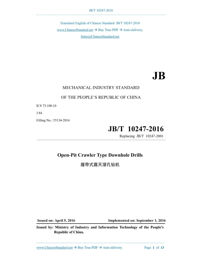 JB/T 10247-2016: Open-Pit Crawler Type Downhole Drills Delivery: 9 seconds. True-PDF full-copy in English & invoice will be downloaded + auto-delivered via email. See step-by-step procedure Status: Valid JB/T 10247: Historical versions