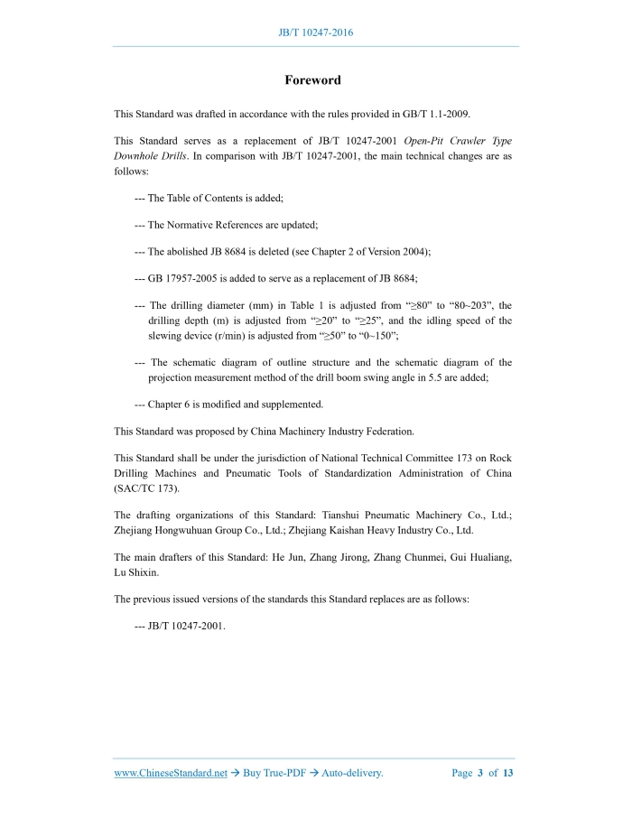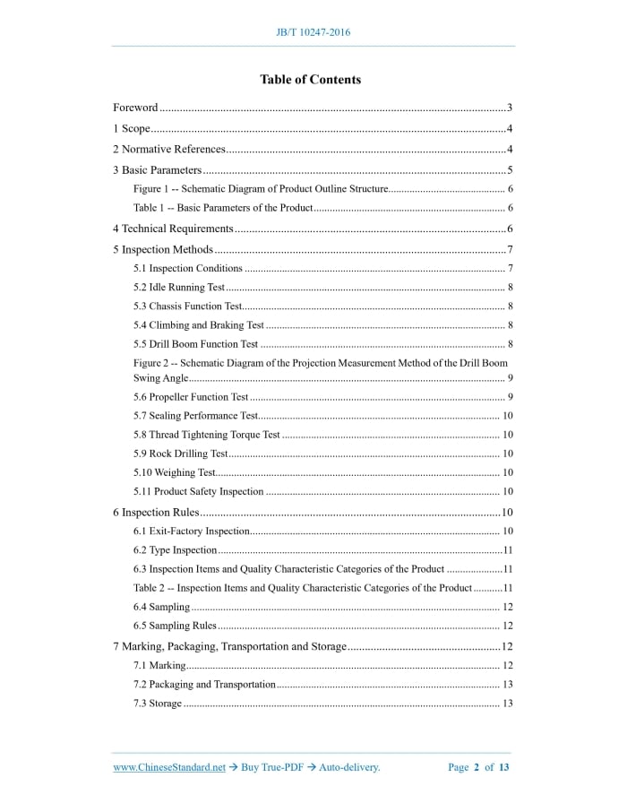 Similar standardsJB/T 10247-2016: Open-Pit Crawler Type Downhole Drills---This is an excerpt. Full copy of true-PDF in English version (including equations, symbols, images, flow-chart, tables, and figures etc.), auto-downloaded/delivered in 9 seconds, can be purchased online: https://www.ChineseStandard.net/PDF.aspx/JBT10247-2016JB MECHANICAL INDUSTRY STANDARD ICS 73.100.10 J 84 Filling No.. 55134-2016 Replacing JB/T 10247-2001 Open-Pit Crawler Type Downhole Drills Issued on: APRIL 5, 2016 Implemented on: SEPTEMBER 1, 2016 Issued by. Ministry of Industry and Information Technology of the People’s Republic of China. Table of ContentsForeword... 3 1 Scope... 4 2 Normative References... 4 3 Basic Parameters... 5 Figure 1 -- Schematic Diagram of Product Outline Structure... 6 Table 1 -- Basic Parameters of the Product... 6 4 Technical Requirements... 6 5 Inspection Methods... 7 5.1 Inspection Conditions... 7 5.2 Idle Running Test... 8 5.3 Chassis Function Test... 8 5.4 Climbing and Braking Test... 8 5.5 Drill Boom Function Test... 8 Figure 2 -- Schematic Diagram of the Projection Measurement Method of the Drill Boom Swing Angle... 9 5.6 Propeller Function Test... 9 5.7 Sealing Performance Test... 10 5.8 Thread Tightening Torque Test... 10 5.9 Rock Drilling Test... 10 5.10 Weighing Test... 10 5.11 Product Safety Inspection... 10 6 Inspection Rules... 10 6.1 Exit-Factory Inspection... 10 6.2 Type Inspection... 11 6.3 Inspection Items and Quality Characteristic Categories of the Product... 11 Table 2 -- Inspection Items and Quality Characteristic Categories of the Product... 11 6.4 Sampling... 12 6.5 Sampling Rules... 12 7 Marking, Packaging, Transportation and Storage... 12 7.1 Marking... 12 7.2 Packaging and Transportation... 13 7.3 Storage... 13ForewordThis Standard was drafted in accordance with the rules provided in GB/T 1.1-2009. This Standard serves as a replacement of JB/T 10247-2001 Open-Pit Crawler Type Downhole Drills. In comparison with JB/T 10247-2001, the main technical changes are as follows. --- The Table of Contents is added; --- The Normative References are updated; --- The abolished JB 8684 is deleted (see Chapter 2 of Version 2004); --- GB 17957-2005 is added to serve as a replacement of JB 8684; --- The drilling diameter (mm) in Table 1 is adjusted from “≥80” to “80~203”, the drilling depth (m) is adjusted from “≥20” to “≥25”, and the idling speed of the slewing device (r/min) is adjusted from “≥50” to “0~150”; --- The schematic diagram of outline structure and the schematic diagram of the projection measurement method of the drill boom swing angle in 5.5 are added; --- Chapter 6 is modified and supplemented. This Standard was proposed by China Machinery Industry Federation. This Standard shall be under the jurisdiction of National Technical Committee 173 on Rock Drilling Machines and Pneumatic Tools of Standardization Administration of China (SAC/TC 173). The drafting organizations of this Standard. Tianshui Pneumatic Machinery Co., Ltd.; Zhejiang Hongwuhuan Group Co., Ltd.; Zhejiang Kaishan Heavy Industry Co., Ltd. The main drafters of this Standard. He Jun, Zhang Jirong, Zhang Chunmei, Gui Hualiang, Lu Shixin. The previous issued versions of the standards this Standard replaces are as follows. --- JB/T 10247-2001. Open-Pit Crawler Type Downhole Drills1 ScopeThis Standard specifies the basic parameters, technical requirements, inspection methods, inspection rules, marking, packaging, transportation and storage of open-pit crawler type downhole drills. This Standard is applicable to the open-pit crawler type downhole drills powered by compressed air (hereinafter referred to as products).2 Normative ReferencesThe following documents are indispensable to the application of this document. In terms of references with a specified date, only versions with a specified date are applicable to this document. In terms of references without a specified date, the latest version (including all the modifications) is applicable to this document. GB/T 5621 Test Methods of Performance for Rock Drilling Machines and Pneumatic Tools GB/T 5898-2004 Measurement of Noise Emitted by Rock Drilling Machines and Pneumatic Tools - Engineering Method GB/T 13306-2011 Plates GB/T 13344-2010 Downhole Drill Hammers and Bits GB/T 13916-2013 Unnoted Tolerance of Shape and Position for Stamping Parts GB 17957-2005 Rock Drilling Machines and Pneumatic Tools - Safety Requirements JB/T 1590 Type Organization Method for Rock Drilling Machines and Pneumatic Tools JB/T 3576 General Specifications for Rust-Preventing of Rock-Drilling Machines and Pneumatic Tools JB/T 4385.1-1999 General Specifications for Open Die Forgings on Hammer JB/T 5000.4-2007 Heavy Mechanical General Techniques and Standards - Part 4.Iron Casting JB/T 5000.6-2007 Heavy Mechanical General Techniques and Standards - Part 6.Steel Castings JB/T 7161 General Specification of Heat-Treatment for Rock Drilling Machines and Pneumatic Tools 4.5 The quality of steel die forgings shall comply with the provisions of JB/T 7163. 4.6 The quality of free die forgings shall comply with the provisions of JB/T 4385.1-1999. 4.7 The unnoted tolerance dimensions of stamping parts shall comply with the provisions of GB/T 13916-2013. 4.8 The quality of machined parts shall comply with the provisions of JB/T 7164. 4.9 The quality of heat-treated parts shall comply with the provisions of JB/T 7161. 4.10 The quality of welding parts shall comply with the provisions of JB/T 7167. 4.11 The assembly quality of the product shall comply with the provisions of JB/T 7165. 4.12 There shall be no leakage at the connection parts or thread seals of hydraulic and pneumatic parts. 4.13 Each hose shall be connected according to the system diagram, and no twisting or folding shall occur. 4.14 The tightening torque of fasteners shall comply with the provisions of QC/T 518-2013. 4.15 The tightening torque of threads shall comply with the provisions of